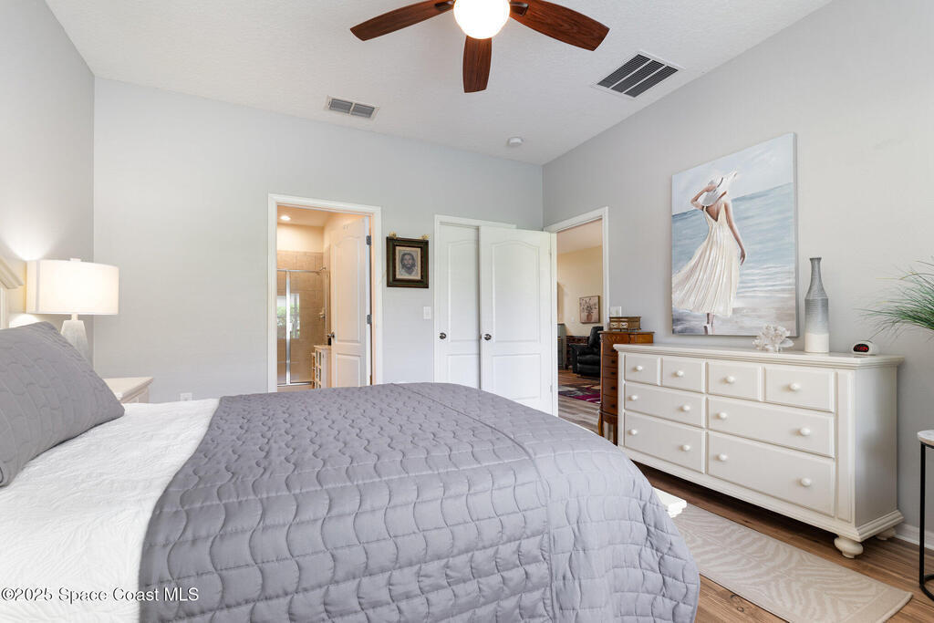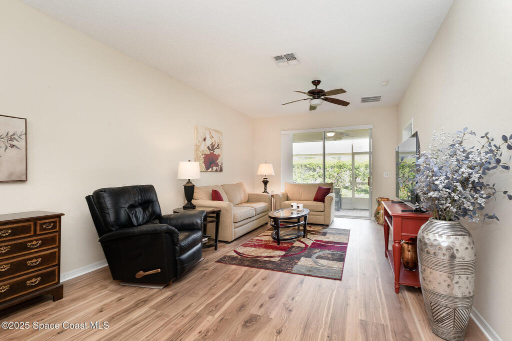 You will love this better than new, impeccably kept, move in ready villa nestled in the most prestigious 55+ resort-style community in Viera. Brand new roof, gutters, freshly painted outside, accordion storm shutters, brand new mohawk wood flooring, all new whirlpool appliances, comfort height toilets, private back yard oasis. Enter into this open floorpan, featuring 2 bedrooms, 2 bathrooms and den,. Enjoy mornings and evenings on your private screened in patio. This villa has been crafted for a life of comfort, luxury, and vibrant community living. The resort-style amenities allow you to immerse yourself in the social scene, whether it's a refreshing dip in the exquisite heated pool & hot tub/spa, a game of tennis or pickleball, a light workout in the fitness center or a leisurely stroll through manicured pathways and community events. This community is close to everything,y et so far away from it all! Start living your dream resort style.