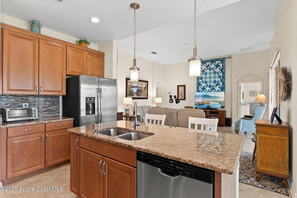 Meticulously maintained 3-bedroom, 2-bath, 2-car garage home, perfectly positioned on a premium lakefront lot with no rear neighbors and breathtaking sunset views. Built in 2016 and owned by only one proud homeowner, this home radiates tremendous pride of ownership. Impeccable landscaping and striking curb appeal. Step inside to find a modern open-concept design with a split-bedroom floor plan. The gourmet kitchen is complete with maple shaker-style cabinetry, granite countertops, and a beautifully coordinated mosaic-tile backsplash. A center island with seating makes it perfect for casual gatherings, while stainless steel appliances complement the overall design. You'll also find a cozy breakfast nook overlooking the lake and a separate dining room currently used as an office--offering flexibility for your lifestyle. The spacious primary suite is a retreat of its own with luxury vinyl plank flooring, a tray ceiling extending the full length of the room, and sliding glass doors that