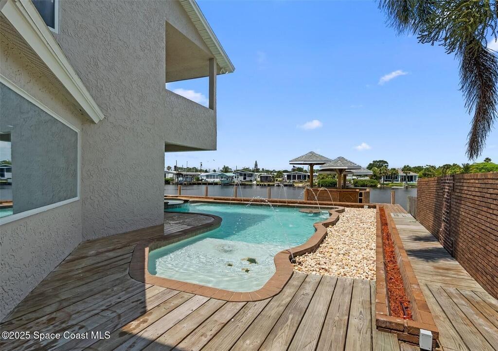 WELCOME HOME TO EXCLUSIVE MILFORD POINT MERRITT ISLAND!An absolute tropical boater's paradise! This stunning canal front single family home offers 5 bedrooms 4 full bathrooms and an open floor plan designed for spacious coastal living. Stunning Kitchen equipped with new stainless appliances. Features include 2 primary suites--one on the first floor and another upstairs with a loft overlooking the main living area, a private balcony overlooking pool and Pelican Creek. One of the downstairs bedrooms is perfect for in-law quarters. The garage is fully equipped custom cabinets and 2 work benches & oversized driveway. Additional highlights include a newer roof, 2 newer HVAC units, two wood-burning fireplaces (one on each level) and an expansive 1,531 sq. ft. dock spanning the full width of the property. Outdoor living at its finest with multiple deck space, a sparkling pool, and a relaxing spa. This property offers direct canal access with no bridges, making it a true boater's dream!