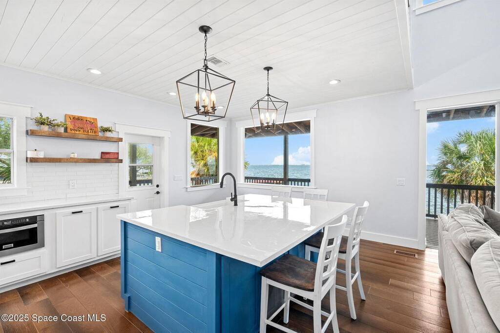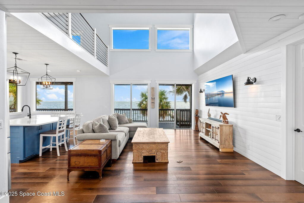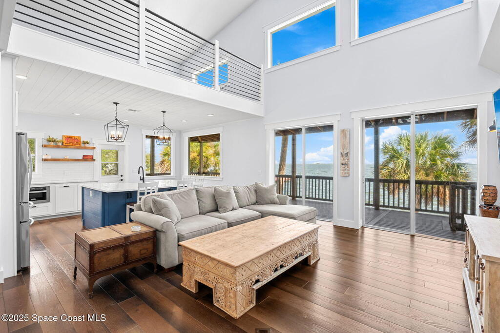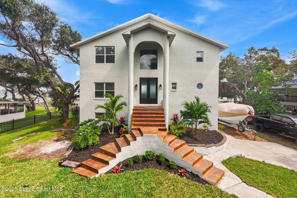Welcome to your dream waterfront escape -- a beautifully remodeled three-story coastal chic home with endless views of the River. From the moment you arrive, you'll feel the serenity of lush palm trees, privacy, and the perfect blend of modern comfort and timeless Florida charm. Inside, the thoughtful layout maximizes both function and flow. The main living level features a spacious open concept with a master suite and an office or guest bedroom, perfectly positioned to capture the river breeze and incredible sunrise views. Below, a massive garage and unfinished workspace offer endless potential -- finish it under air to create an additional 500 sq. ft. of living space, ideal for a gym, recreation room, or social lounge. Upstairs, two more bedrooms and a full bath open to a private balcony overlooking the dock and boat lift -- your front-row seat to the river life. Morning coffee, evening cocktails, or spontaneous boat days -- it's all right outside your door.