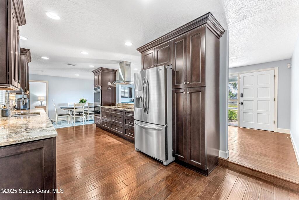Villa De Palmas! Well appointed home fully remodeled Pool home featuring 4 bed/2 bath and a fenced in Private Yard Waterproof, stain resistant wood floors in the main living spaces and primary suite. HUGE kitchen has soft close, wood shaker cabinets, upgraded hardware, electric range overlooking the family room, double oven, granite countertops with matching backsplash, and more! Primary suite with double sinks and walk-in shower with decorative tile. Massive back yard, with brand new white vinyl privacy fence, and workshop w/ electricity and water. The oversized patio is perfect for gatherings and parties! Located close to Shopping, Beaches ,Golf and more!