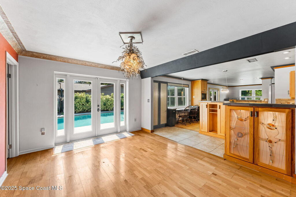 Enjoy sensational sunrises over the Intracoastal Waterway/Indian River from your front river view patio. This home has a large custom pool in the backyard and expansive screened porch. Hardwood floors, one recently upgraded bathroom, hurricane windows and custom lighting. The home sits on a corner lot with mature plantings, a water feature, potting bench and a paver patio overlooking the river. All 3 bedrooms have a view of the water! This is a must see home.