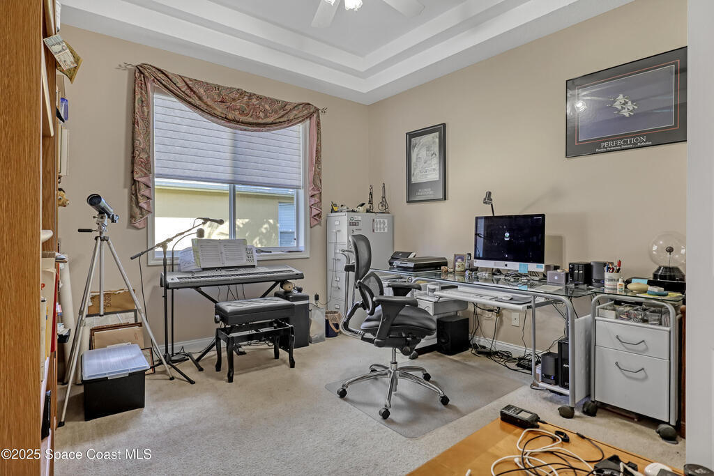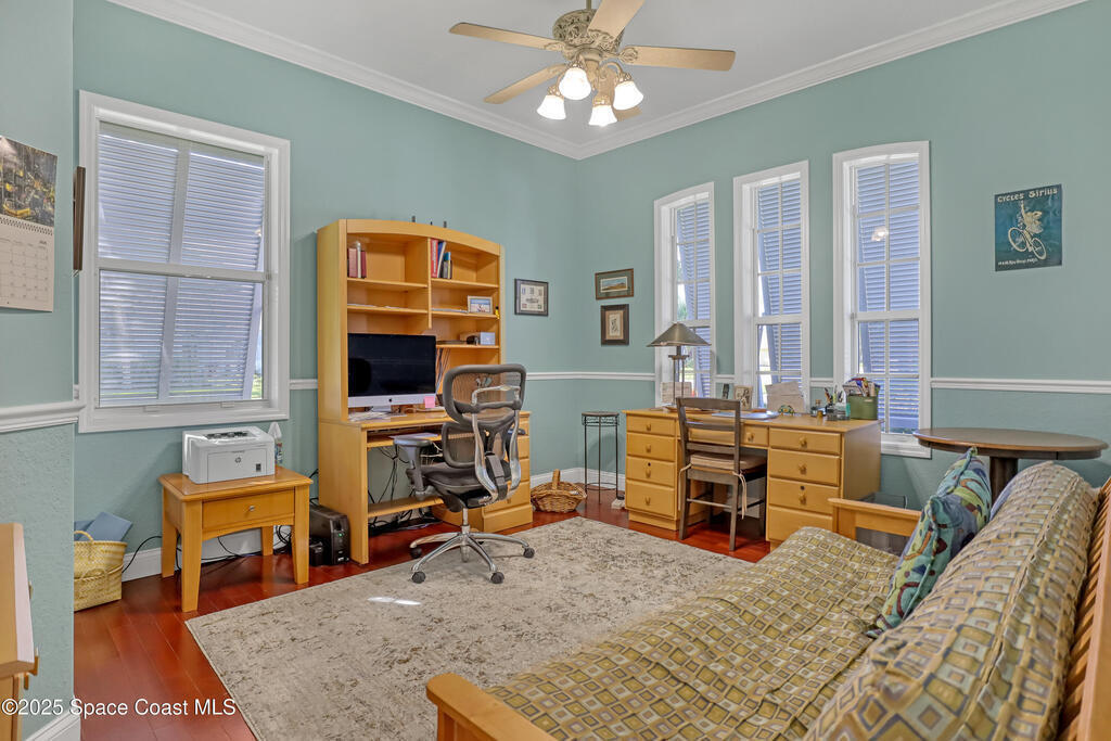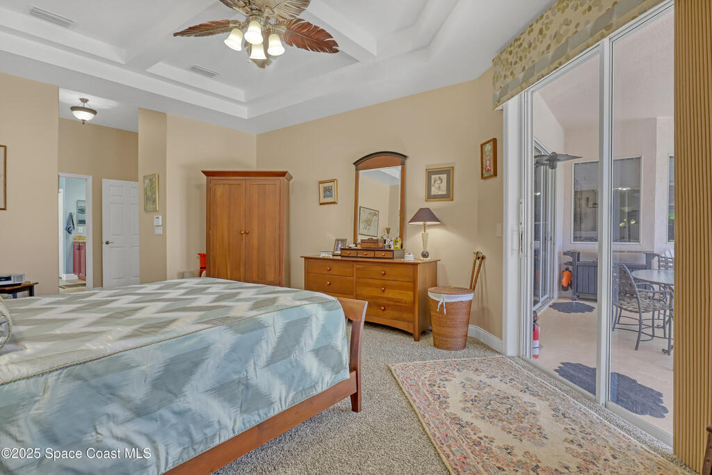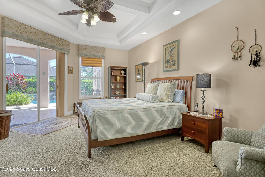 A cut above the rest! This outstanding former model home draws you in upon arrival. The upgraded metal roof, triple wide driveway and three separate garage stalls, set the tone. Quality in abundance throughout, elegant living & dining areas with 10' ceilings & stunning pool view. A spacious en suite with walk-in closets, tray ceilings & designer fan. Master bath with granite tops, jetted tub, walk-in shower & water closet.Adjacent 4th bedroom/study has ample space for an office or bedroom set up. A kitchen to die for! Extensive cabinet & counter space, quartz tops, breakfast bar & center island, stainless steel appliances, walk-in pantry & eat-in dining area.A large family room with attractive built-ins & spacious secondary bedrooms. Indoor laundry room w/ gas dryer. Lush foliage creates privacy for the impressive pool area & covered patio space with 3 ceiling fans, pool bathroom & extended pool deck. Full AC replacement in 2024, including ducts, Accordion & Bahama shutters.