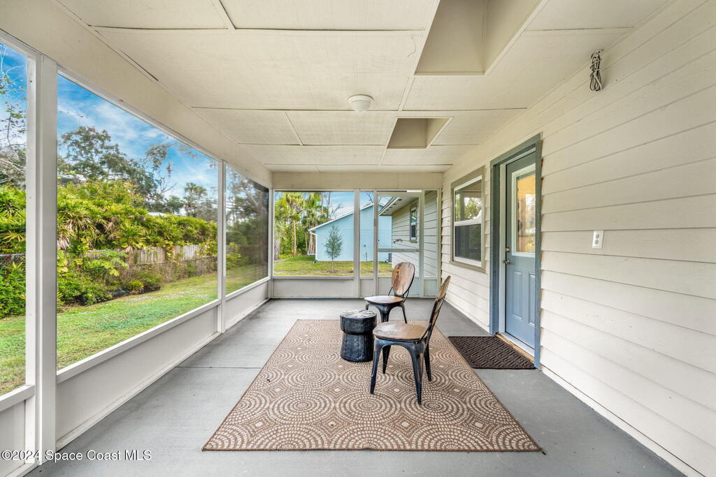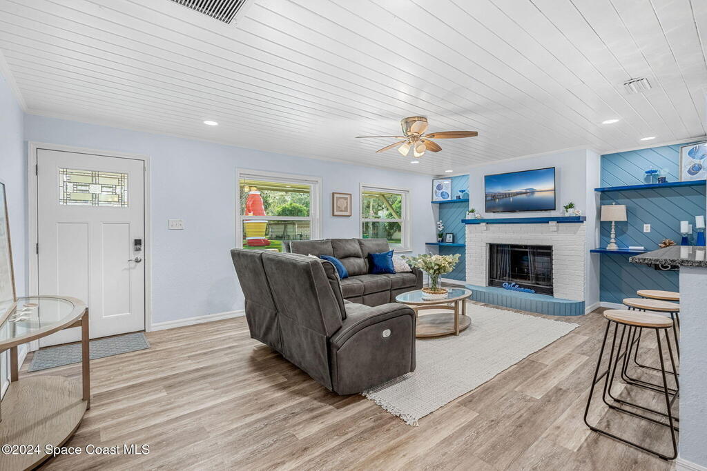 This beautifully crafted 3/2 is situated on a unique, private, and gated road in the quaint town of Bellwood, Titusville, FL. Fully renovated, the home offers 1,428 sq ft of living space and 2,630 sq ft under roof, nestled on a generous .29-acre lot.Inside, a stunning floor-to-ceiling stone fireplace and slat pinewood accents throughout perfectly complement the mature trees and Old Florida charm surrounding the property. The spacious kitchen features updated stainless steel appliances, ample granite counter space, custom cabinetry, and a large walk-in pantry. Built-in desk spaces and modern light fixtures throughout the home enhance both style and functionality, creating a comfortable and inviting atmosphere. The home also includes a 780 sq ft garage for parking, storage, and workspace. Constructed with cedar B&B siding and wood-frame construction, the property exudes rustic yet coastal charm. Features also include hurricane impact windows and doors. Roof installed 2015.