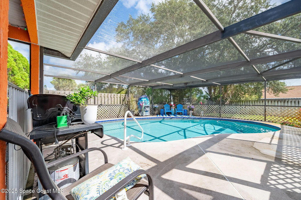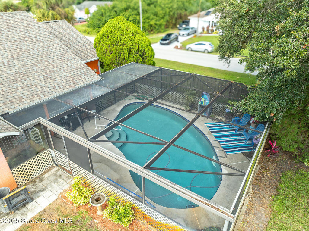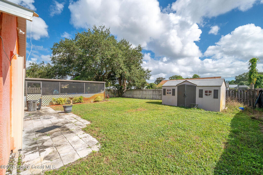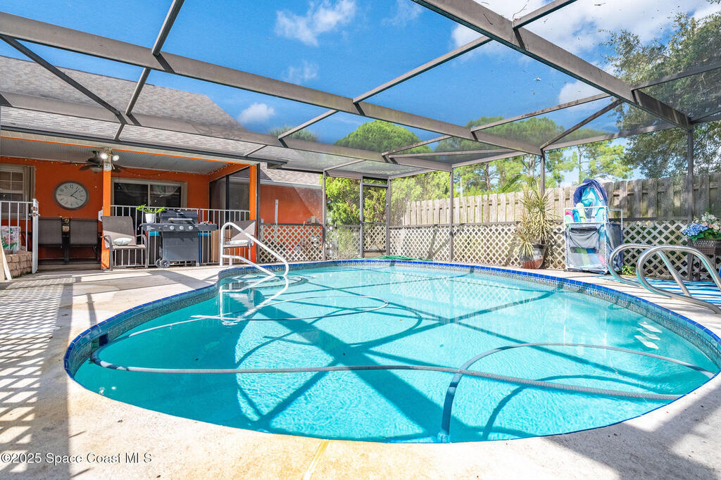 Beautiful split-plan pool home on a fully fenced corner lot in Palm Bay! Enjoy the screen-enclosed pool and patio, perfect for relaxing or entertaining. Inside, you'll find an open kitchen overlooking the family room, plus formal living and dining areas and vaulted ceilings that create an open, airy feel. The primary suite offers privacy from guest bedrooms. Additional features include fresh exterior paint, a new roof, 2019 A/C, hurricane shutters, and a storage shed. Conveniently located near shopping, dining, and I-95!