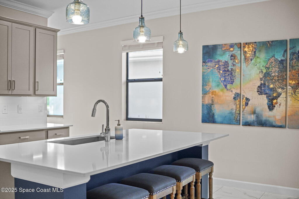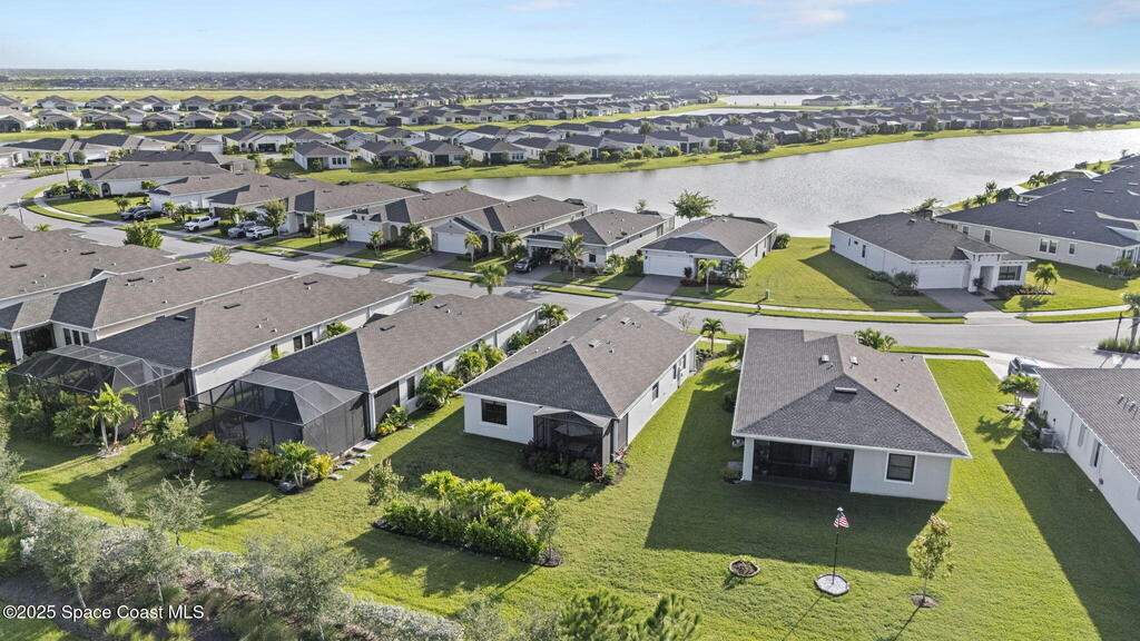 Discover resort-style living in the highly sought-after 55+ gated community of Bridgewater at Viera. This meticulously maintained 3bed, 2bath home built in 2021 is like new. Offering an inviting open floor plan with lovely design details throughout. Kitchen features quartz countertops, a large island, upgraded appliances, sliding cabinet shelves, under-cabinet lighting, neutral finishes to complement any decor. Upgrades include crown molding, porcelain tile flooring, a water filtration system, epoxy garage floor, LiftMaster garage door opener, a ClosetMaid system in the primary bedroom. Start your day with a cup of coffee on the expanded screened-in lanai as the sun rises--or unwind in the evening with a cocktail during golden hour. Experience the ultimate in active adult living with private clubhouse amenities, including a heated resort-style pool and spa, fitness center, group exercise studio, tennis, pickleball, bocce, movie theater and more. 45min to Orlando, 15min to the beach,