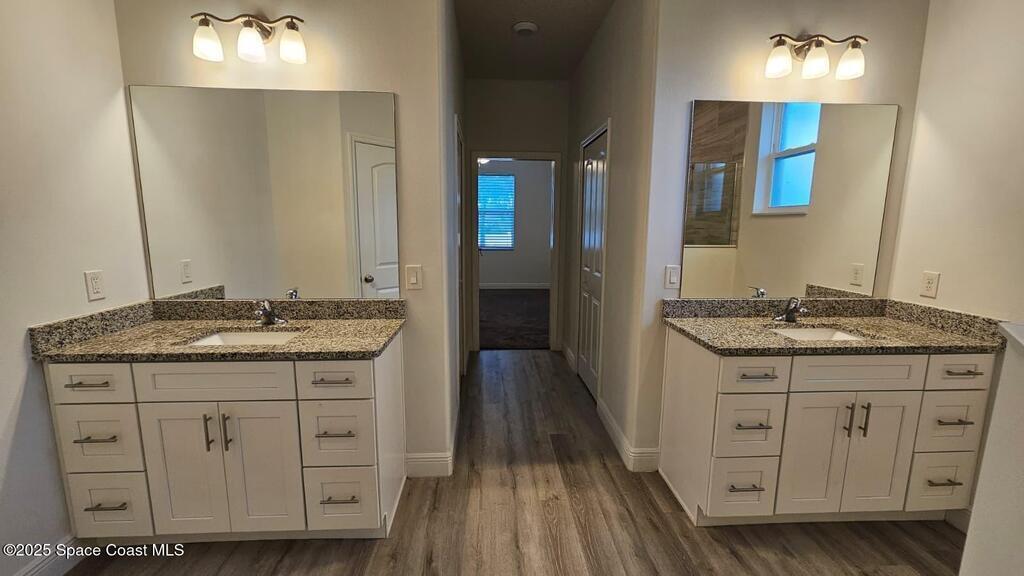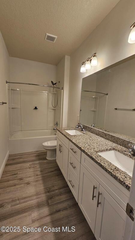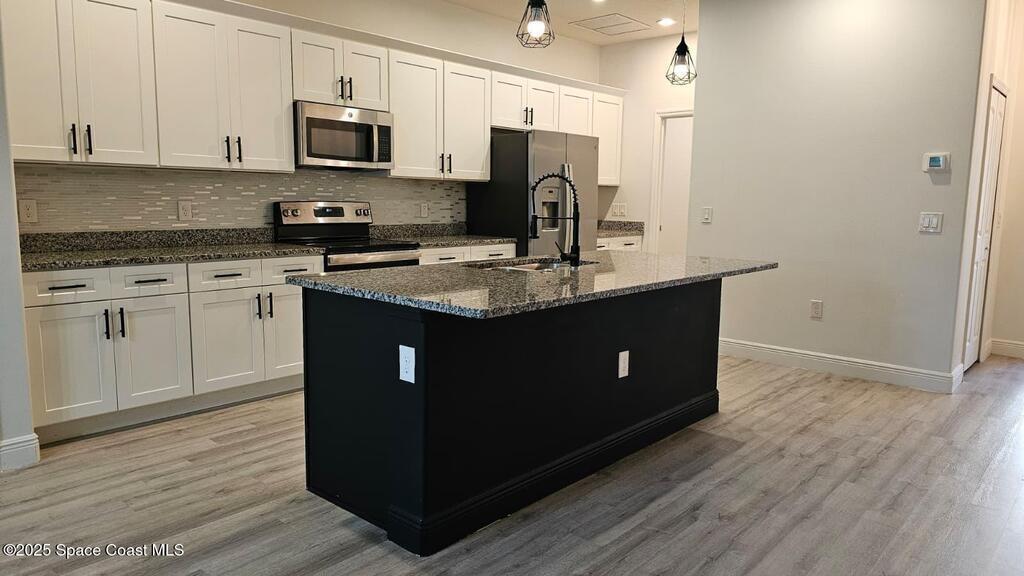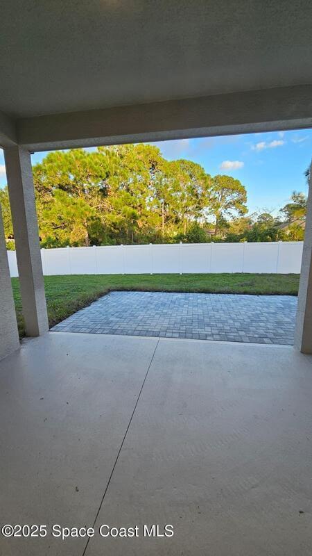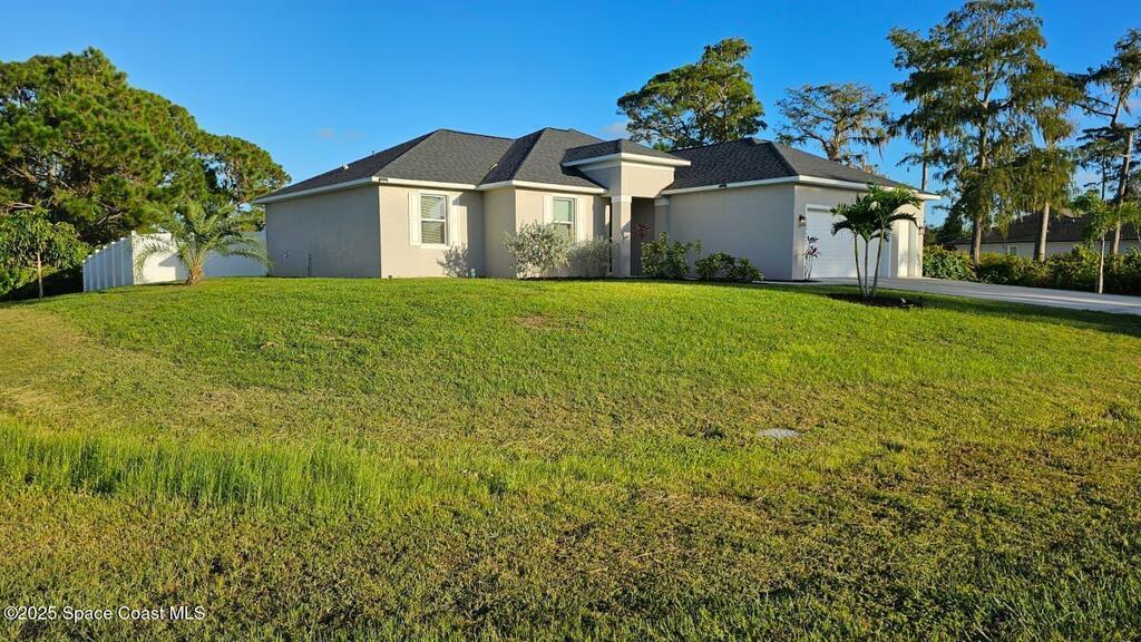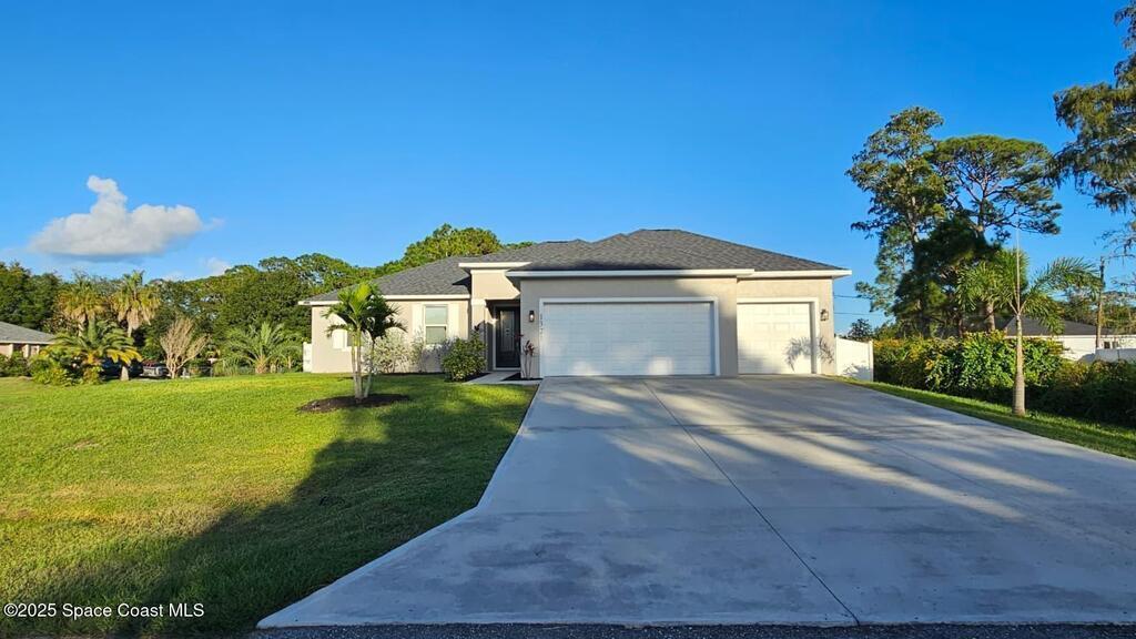 Welcome to this beautifully designed Contemporary Florida home built with comfort, efficiency, and modern style in mind. This 3-bedroom plus den/flex room (possible 4th bedroom), 2-bath, 3-car garage home features a bright open layout with vaulted ceilings and abundant natural light. The kitchen offers stainless steel appliances, soft-close cabinetry, and a large island perfect for entertaining. The split floor plan provides privacy for the primary suite with dual walk-in closets, double vanity, and walk-in shower. Enjoy outdoor living on the covered patio overlooking a spacious, manicured backyard with room for a pool or garden. Built with energy-efficient block construction, storm protection, and modern fixtures, this home offers both comfort and peace of mind. Located on a quiet east-west street near Bayside Lakes, schools, dining, and I-95, this move-in-ready gem combines curb appeal, quality finishes, and low-maintenance Florida living.