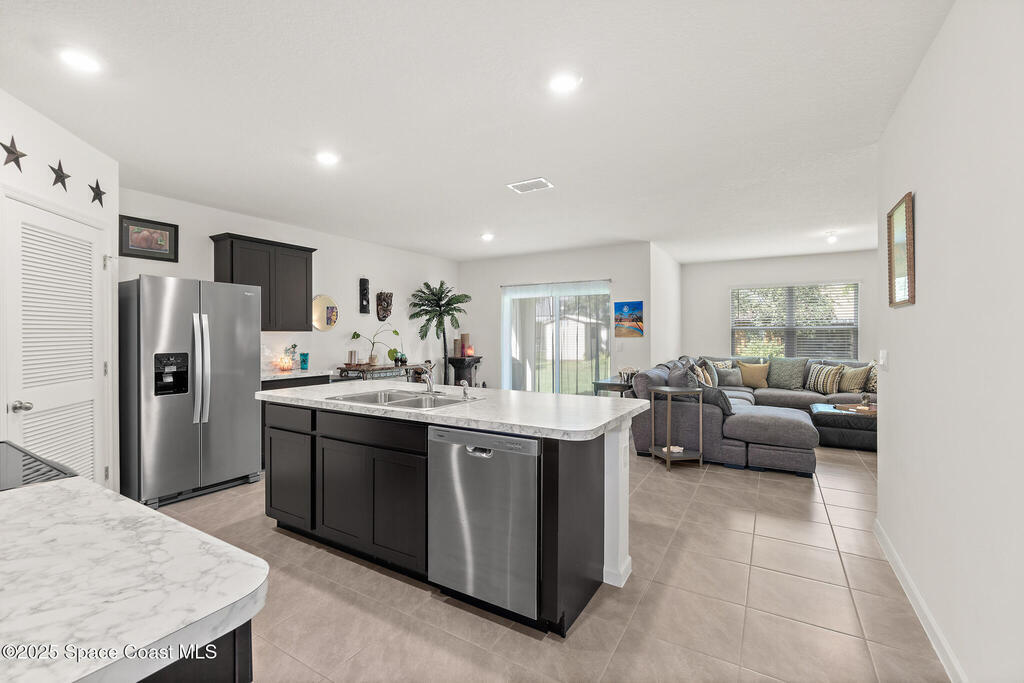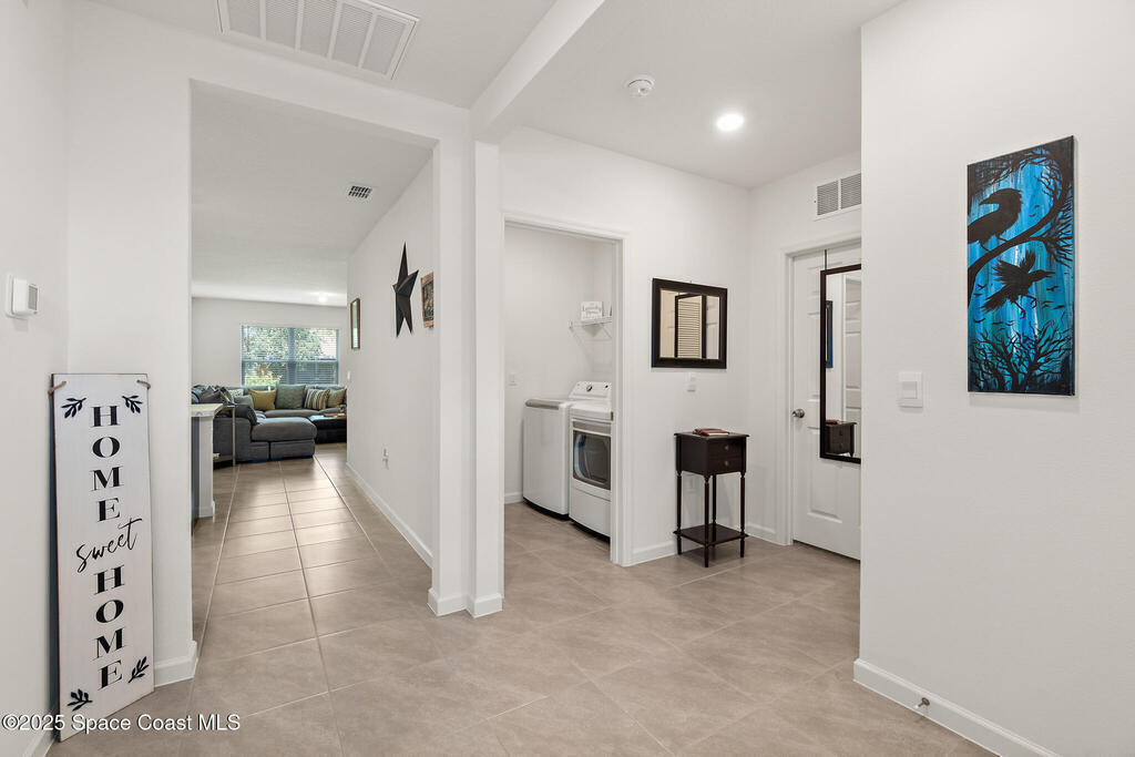 WHY WAIT for new construction when this one-year-old Cali model is already complete and move-in ready! Located on CITY WATER and SEWER--a major advantage over nearby homes on well and septic--this 4 bedroom, 2 bath, 2-car garage home offers modern living with no delays or added construction costs. Smart home has Oolsys IQ panel, Alarm.com app, video door bell & more! See features list! The open floor plan features a large kitchen island, walk-in pantry, and spacious living area filled with natural light. The primary bedroom accommodates king-size furniture with ease and includes an oversized walk-in closet and a large en-suite bathroom with dual sinks and walk-in shower. Owner is installing ceiling fans in all bedrooms and living spaces (excluding bathrooms), providing comfort and efficiency. Close to shopping, dining, and everyday amenities, with quick access to I-95 for commuting, travel, and access to beaches, major employers, and Orlando attractions.