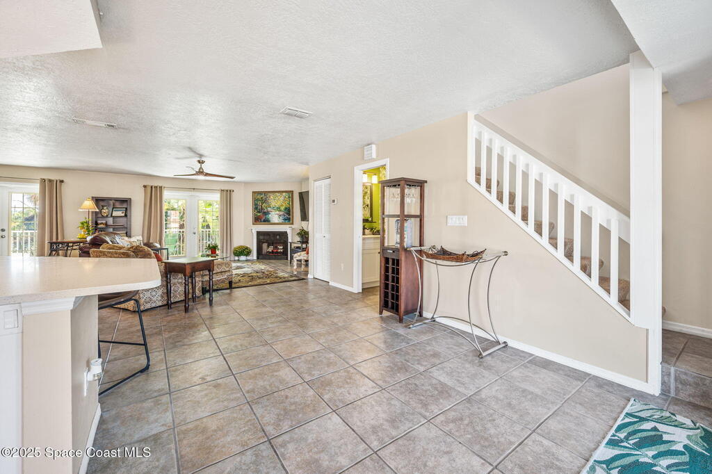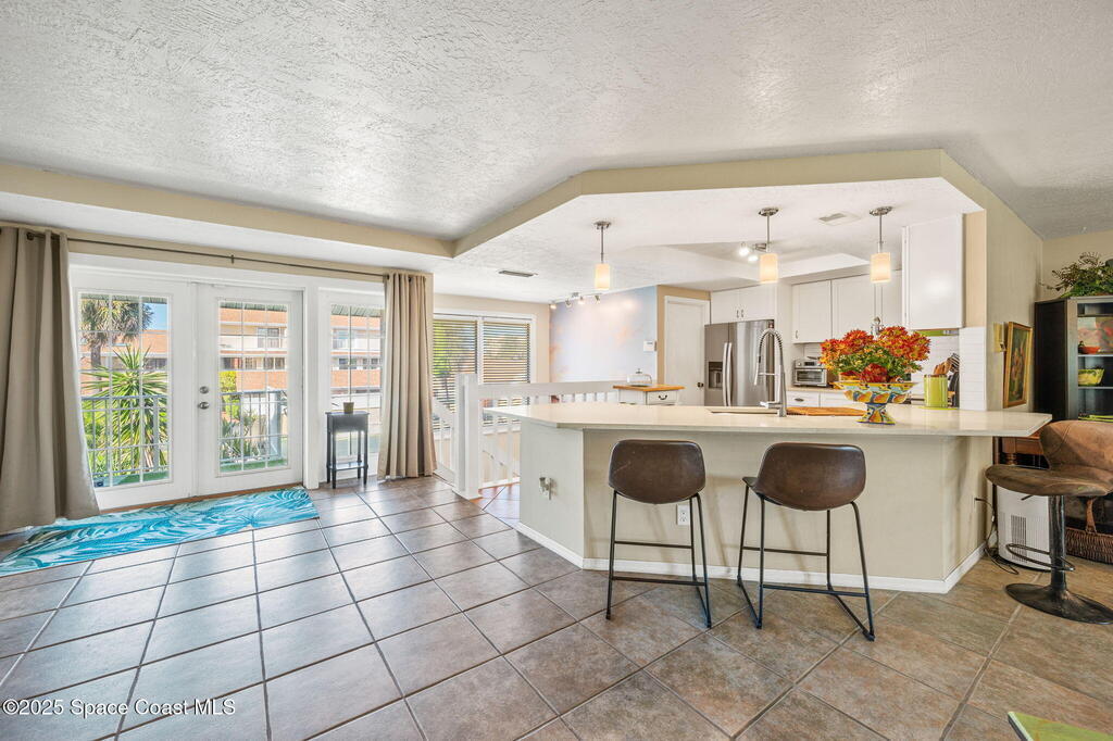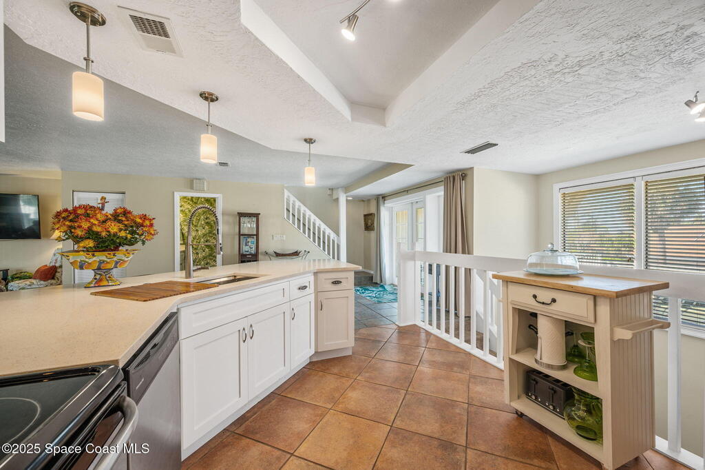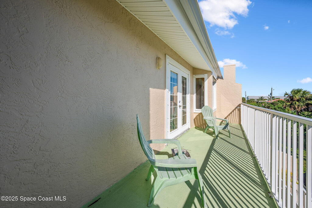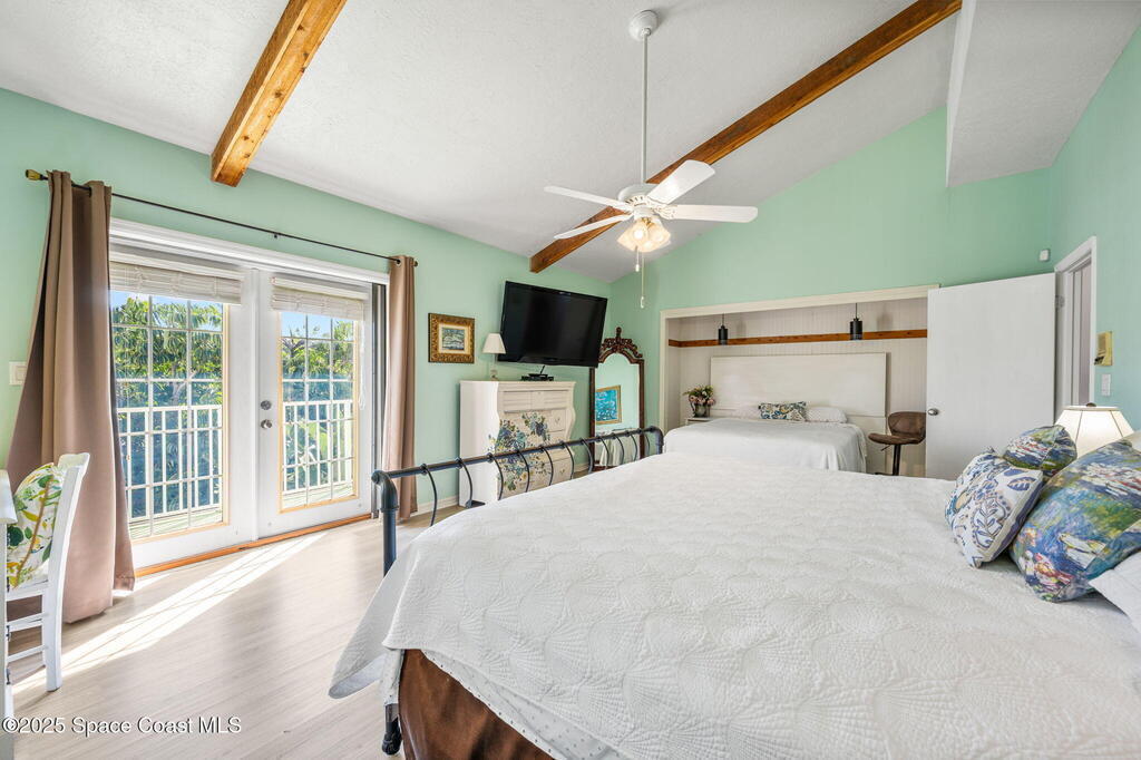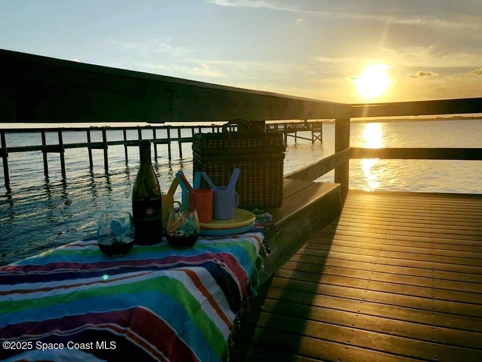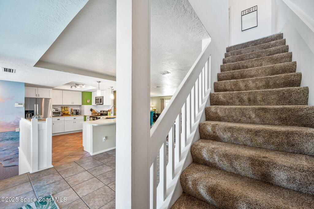 This furnished 3-story townhome offers 1890 sq ft of living space with stunning views from 4 balconies. The attached garage provides convenience and security. The first primary bedroom features an ensuite bathroom and a king bed, with a private balcony overlooking NASA rocket launches, sunrises, ocean view and sunsets. The second primary bedroom also has an ensuite bathroom with a king bed and queen bed, as well as a private balcony with stunning views. Renovated bathrooms feature double vanities/dual sinks, one with a glass walk-in shower and Bluetooth mirror, and the other with a soaker tub. The kitchen has new white wood shaker style cabinets solid wood and soft close, quartz countertops, and appliances. The home has 4 balconies with sunset and sunrise views. Amenities include beaches, a riverfront pier, pickleball and tennis courts, and a heated pool. The water heater and AC were replaced in 2023, with luxury vinyl flooring upstairs.
