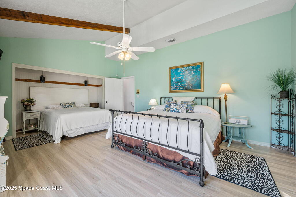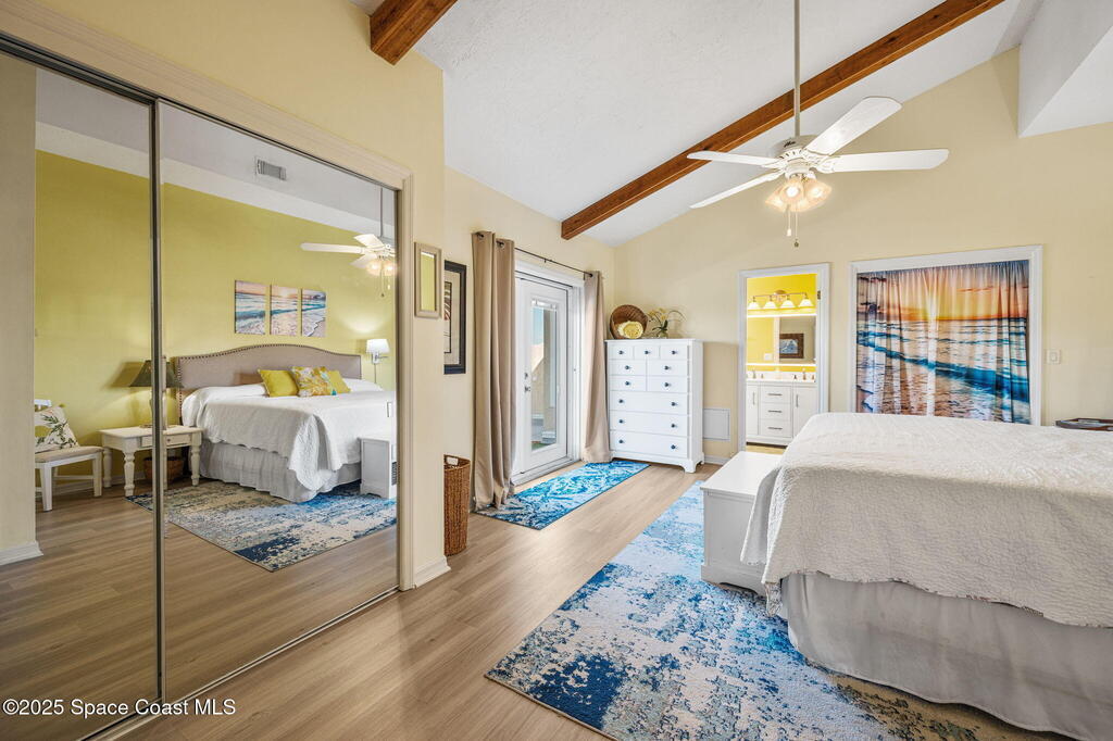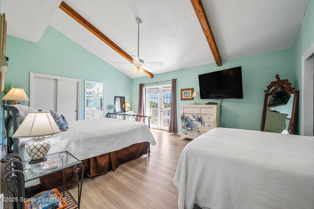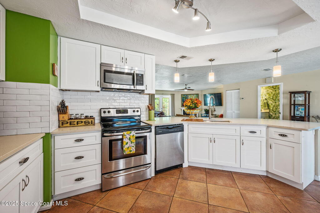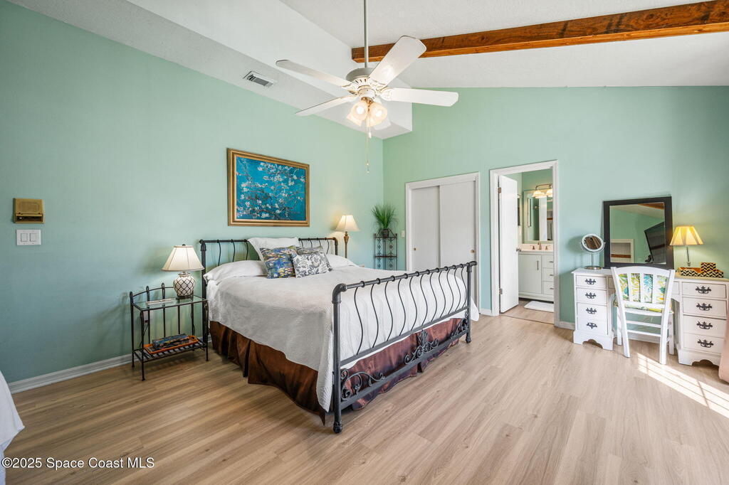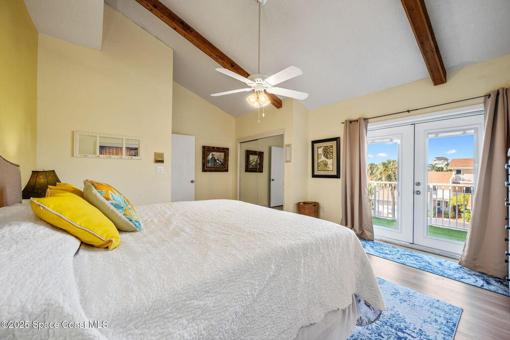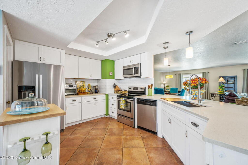 This furnished 3-story townhome offers 1890 sq ft of living space with stunning views from 4 balconies. The attached garage provides convenience and security. The first primary bedroom features an ensuite bathroom and a king bed, with a private balcony overlooking NASA rocket launches, sunrises, ocean view and sunsets. The second primary bedroom also has an ensuite bathroom with a king bed and queen bed, as well as a private balcony with stunning views. Renovated bathrooms feature double vanities/dual sinks, one with a glass walk-in shower and Bluetooth mirror, and the other with a soaker tub. The kitchen has new white wood shaker style cabinets solid wood and soft close, quartz countertops, and appliances. The home has 4 balconies with sunset and sunrise views. Amenities include beaches, a riverfront pier, pickleball and tennis courts, and a heated pool. The water heater and AC were replaced in 2023, with luxury vinyl flooring upstairs.