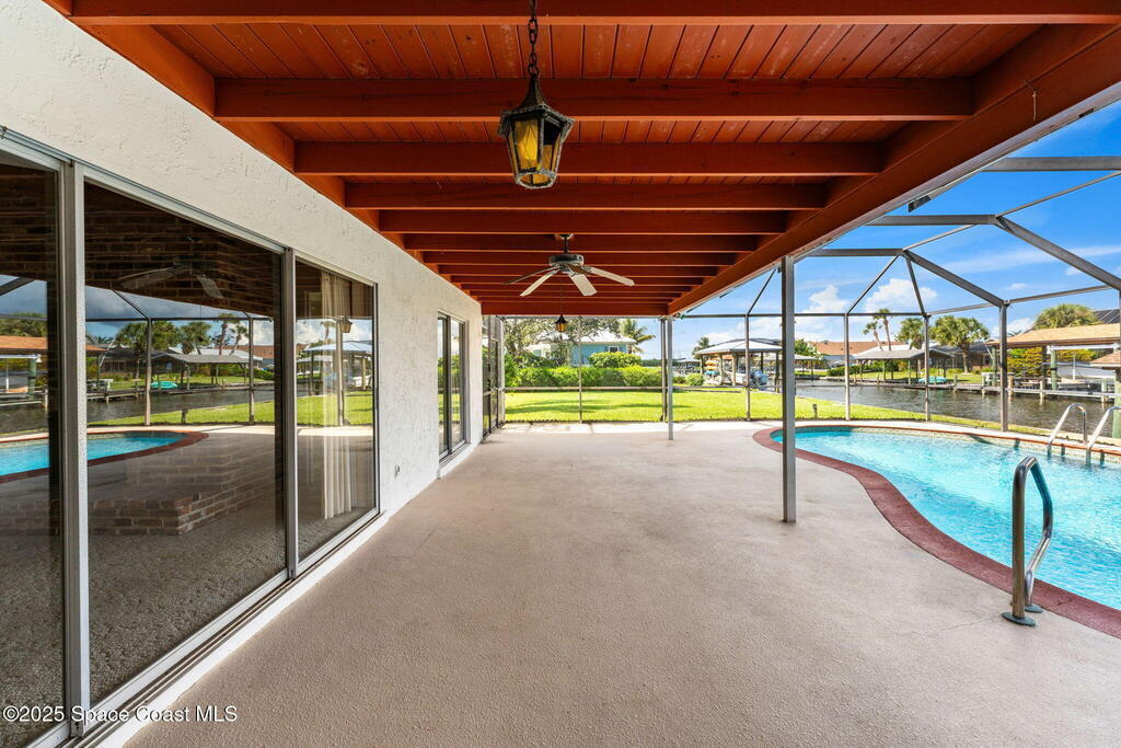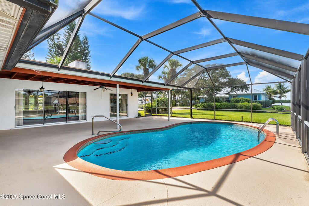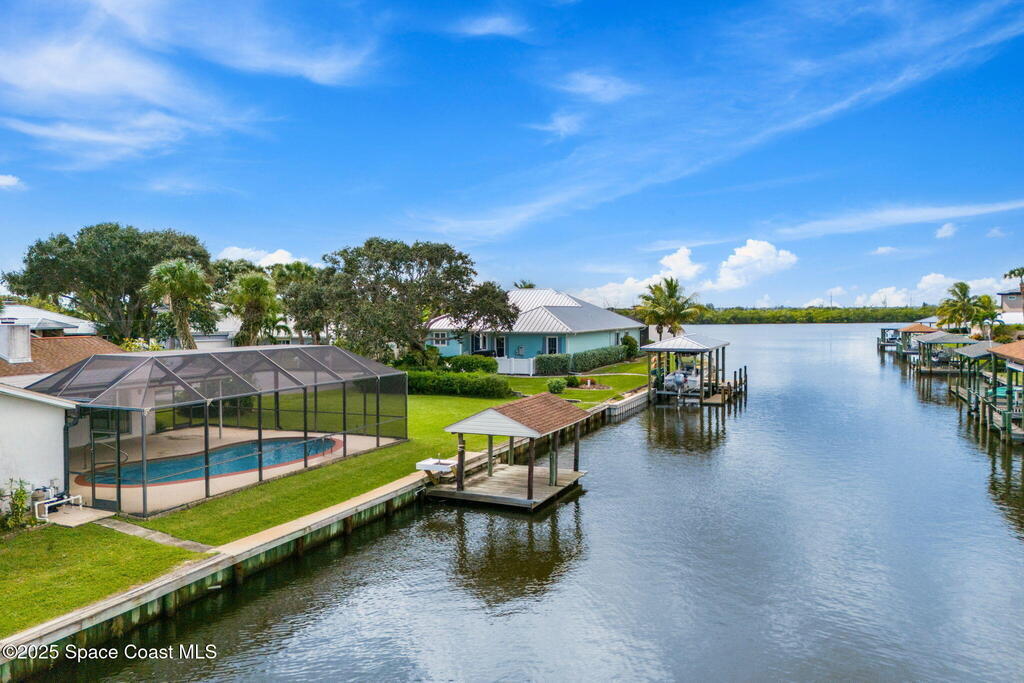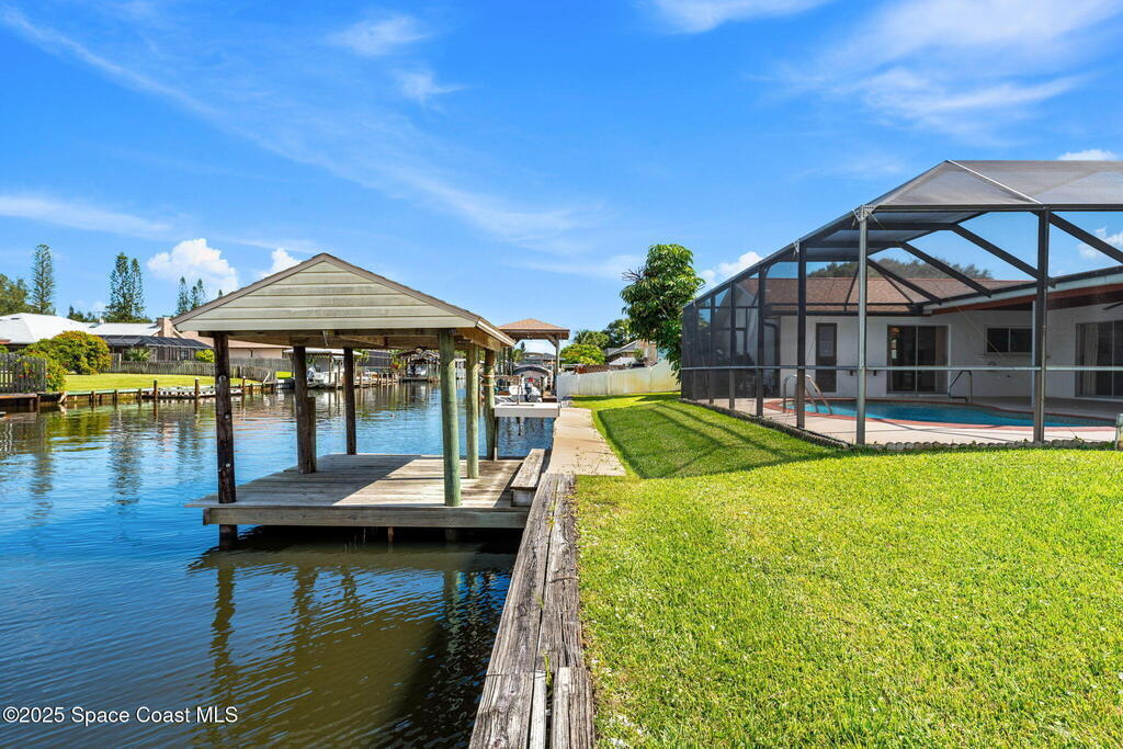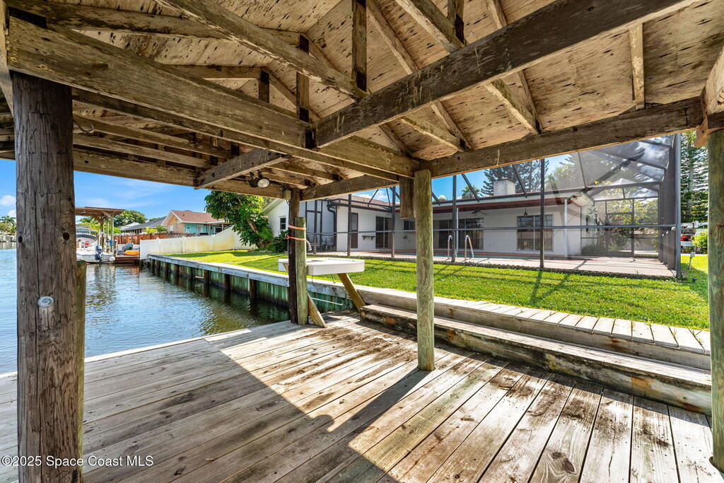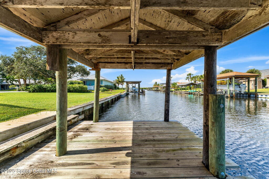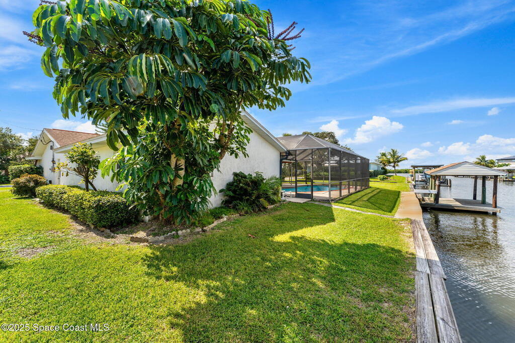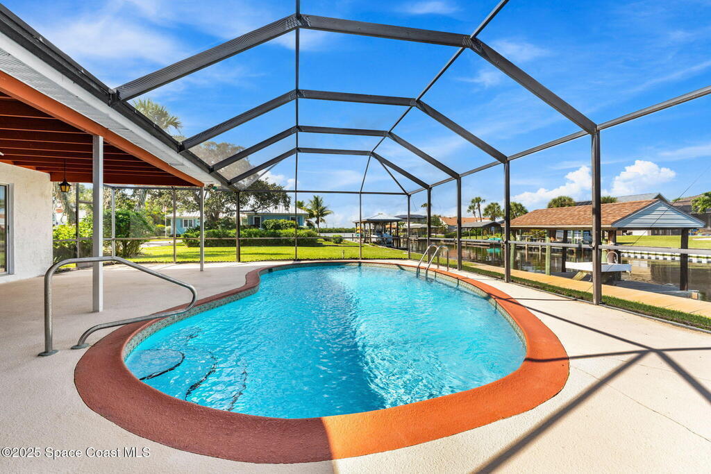 Boater's Paradise Awaits! Perfectly positioned on a .24 acre cul-de-sac lot, this CANAL FRONT POOL HOME offers direct access to the Indian River from your private covered boat dock--just minutes to Sebastian Inlet & offshore adventures! The split floor plan features a spacious living area w/ a wood-beam vaulted ceiling, brick wood-burning fireplace & a custom wood accent wall adding to the vintage charm. Triple sliding doors open to a screened pool & spacious covered lanai where you'll enjoy serene nature views. Recent updates- new HVAC & pool pump in 2025. All windows (except sliders) have been replaced & are impact rated! Tons of potential to make this your dream coastal retreat--bring your water toys & imagination! See Property Highligts in Documents. Sunnyland Beach is a friendly beach community w/ a voluntary HOA, & a deeded beach access, plus close proximity to Aquarina Golf Course & Nancy Higgs Park- indoor basketball, fitness classes, pickleball, disc golf, dog park & more!