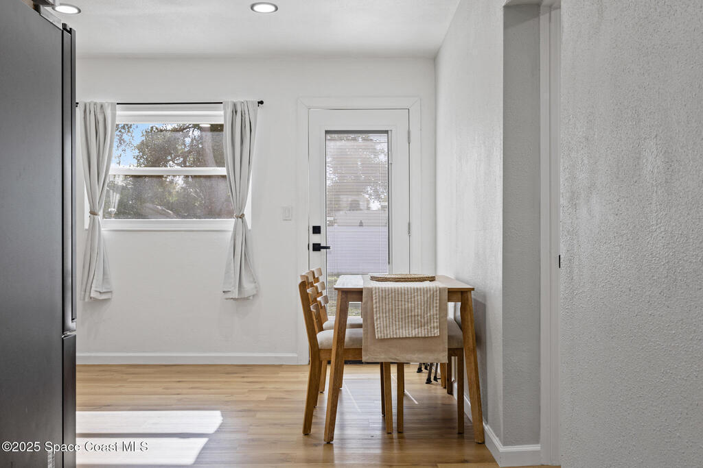 Turn-key and move-in ready! This beautifully updated 3-bedroom, 2-bath home is centrally located in the heart of Melbourne, close to shopping, dining, and the beaches. Inside, you'll find stylish vinyl plank flooring, LED lighting throughout, and a bright open layout. The kitchen boasts shaker cabinets, butcher block countertops, and stainless steel appliances, while both bathrooms feature custom-tiled showers and modern finishes. Enjoy peace of mind with 2024 updates including roof, A/C, electrical, plumbing, stucco, and instant hot water heater, along with hurricane impact windows and doors. Outside, a spacious two-car driveway and inviting back patio make it perfect for relaxing or entertaining. This home truly has it all--modern comfort, quality upgrades, and a fantastic Melbourne location!