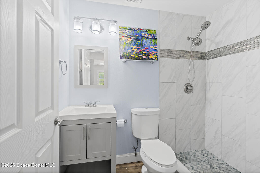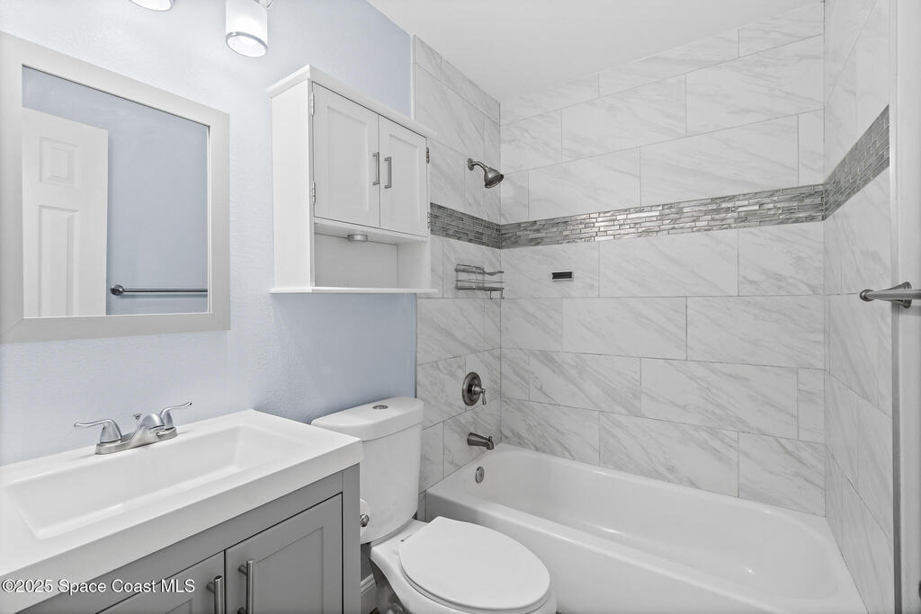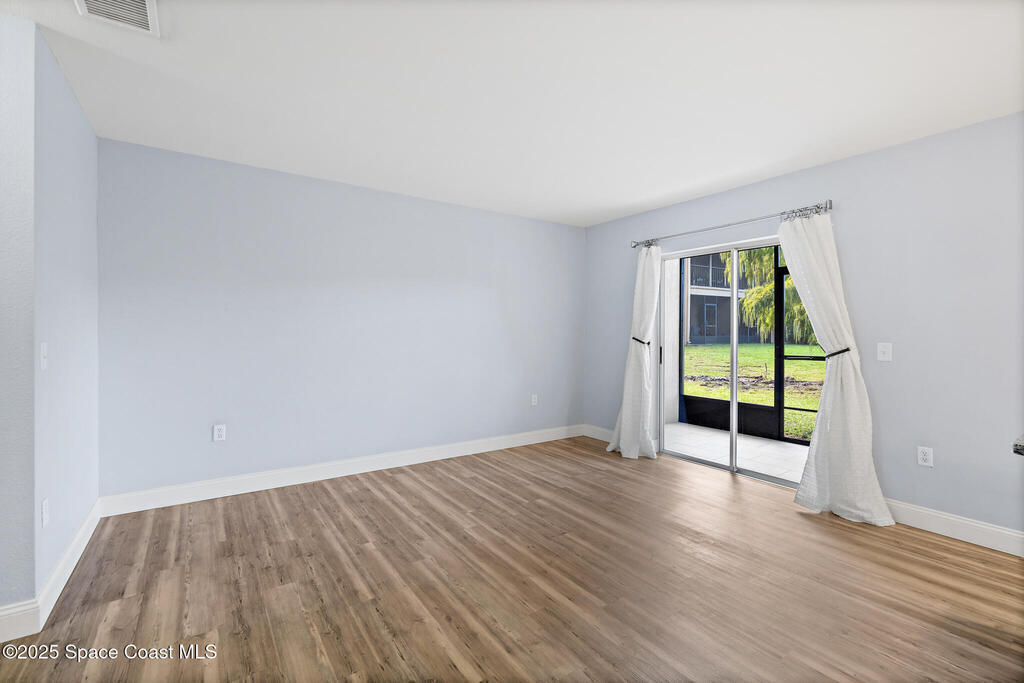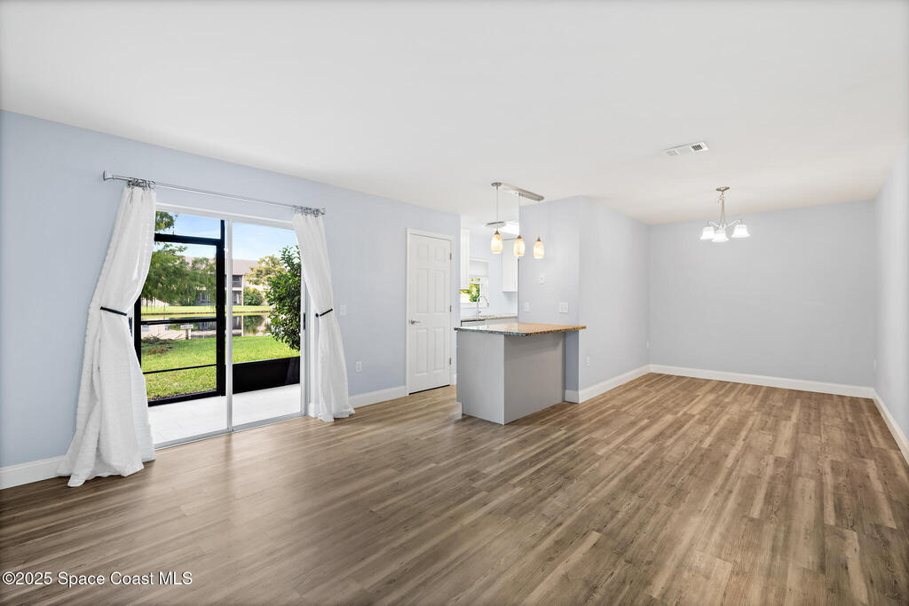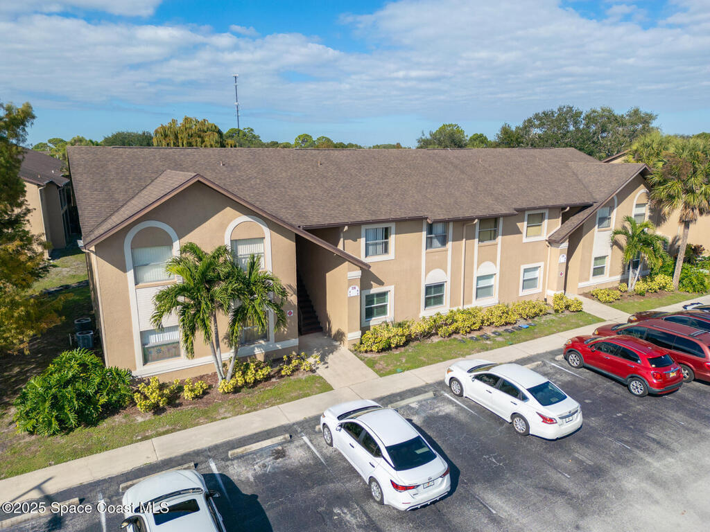 Discover serenity in this pristine 1st-floor Merritt Island condo, where comfort meets coastal ease. Step into open living spaces graced by modern luxury vinyl flooring. The kitchen offers pond views, sleek granite counters, white shaker soft-close cabinets, stainless steel appliances, LG washer/dryer and a granite breakfast bar with chic pendant lights. Unwind on the tiled screened lanai overlooking a peaceful pond and lush greenery. The primary suite includes a walk-in tiled shower with decorative inlay, refreshed vanity, plantation shutters and organized walk-in closet. Guest bath features a tiled tub/shower w/inlay flair and stylish finishes. Impact windows & 2024 hot water heater too! Enjoy low HOA fees of $265/month in a well-run, self-managed community 15 minutes to the beach and close to shops, Publix and dining. Listing includes 3D walkthrough & video tour. Schedule your private tour today and start Living the Florida Lifestyle!