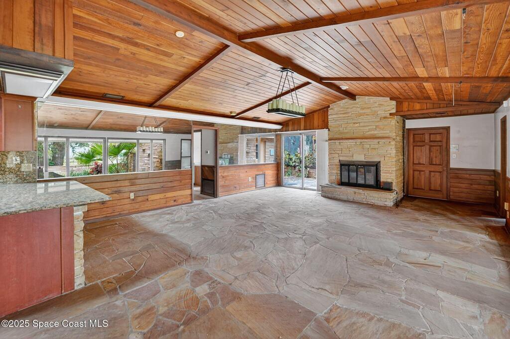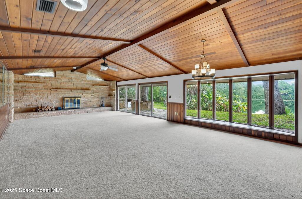 Where architecture meets nature, this rare mid-century modern retreat offers privacy, water views, and timeless design on 1.62 acres at the end of a secluded cul-de-sac. Floor-to-ceiling glass captures panoramic views of a peaceful non-motorized pond surrounded by mature trees, creating a private sanctuary perfect for paddleboarding, wildlife watching, and quiet reflection. The striking architecture features cedar tongue-and-groove ceilings, split-stone fireplaces, and a seamless indoor-outdoor flow. A dramatic family room with soaring ceilings anchors the home, while the private primary suite opens to nature with its own outdoor hot tub. Multiple decks and a screened atrium connect every space to the surrounding landscape. Located near downtown Titusville, waterfront dining, rocket launches, and nature preserves, this is more than a home--it is a lifestyle defined by serenity, design, and connection to nature.
