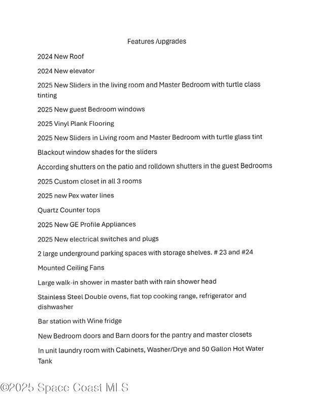 JUST FINISHED, FULL REMODEL CONDO , THIS OCEAN FRONT UNIT IS UNLIKE ANY OTHER UNITS IN THIS BUILDING. A MUST SEE. EVERYTHING HAS BEEN REPLACED FROM THE FLOOR TO THE CEILING. PLUMBING WITH PEX, ELICTRICAL PLUGS AND OUTLETS, STAINLESS STEEL APPLIANCES, QUARTS COUNTER TOPS, FARM SINK, SOFT CLOSE CABINET DOORS AND DRAWERS, VINYL PLANK FLOORING, NEW SLIDERS WITH TURTLE TINT GLASS, ACCORDION AND ROLLDOWN SHUTTERS. BLACKOUT BLINDS, BARN DOORS, CUSTOM CLOSETS. BUILT-IN BAR WITH WINE FRIDGE AND MUCH MORE. WATCH THE ROCKET LAUNCHES FROM YOU OWN PRIVATE BALCONY. THIS IS A RARE UNIT THAT HAS TWO LARGE UNDERGROUND GARAGE SPACES. NEW ROOF AND ELEVATOR IN 2024. ONLY AN HOUR DRIVE TO THE ORLANDO INTERNATIONAL AIRPORT, DISNEY, UNIVERSAL STUDIOS AND MORE.