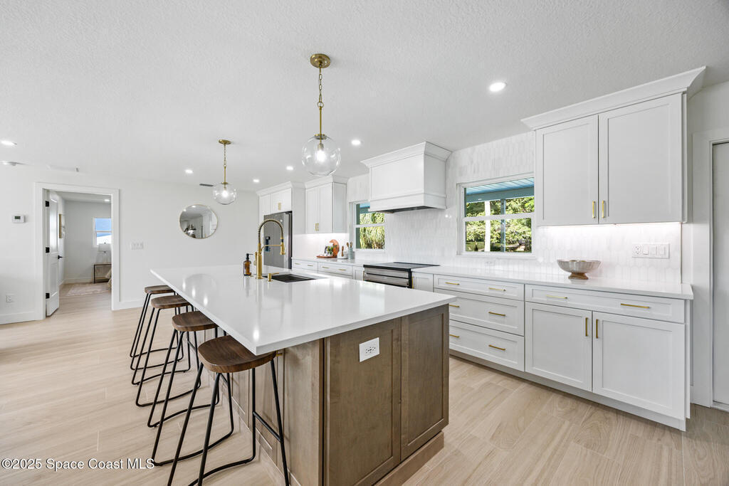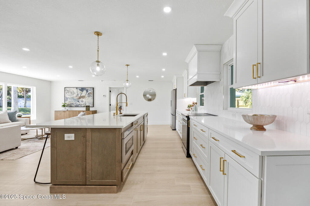 This fully remodeled 4-bedroom, 3-bath home in the desirable SOFA district combines modern design with enduring quality. Located in a quiet cul-de-sac on a .4-acre lot, the open layout features clean lines and organic textures throughout. The chef's kitchen includes a jumbo island with double-sided storage, quartz countertops, dolomite marble backsplash, custom soft-close cabinetry, and all-new Samsung stainless steel appliances. Under-cabinet lighting and a bar area with beverage fridge and sink complete the space. Ceramic tile flows seamlessly through the home, with a private primary suite on one side and three spacious bedrooms on the other, including one with an ensuite bath. All bedrooms feature custom natural wood closet systems, and the home offers a large indoor laundry room. Bathrooms showcase marble and ceramic tile with curated fixtures and high-end finishes.