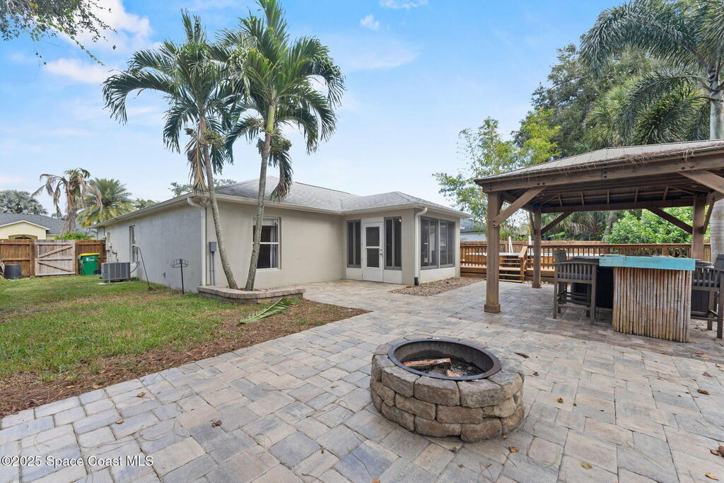 There's no place like home--and this one proves it! The backyard is a showstopper featuring a brick paver patio, firepit, gazebo with hot tub & bar, above-ground pool with raised deck, and lush tropical landscaping. Inside, the open floor plan has no carpet, with formal living and dining rooms plus a family room and sun porch that opens into a screened patio. Major updates done: roof 2021, HVAC 2020, pool/deck 2017, fence 2014, hot tub & gazebo 2022, water heater 2025, dishwasher 2024, washer/dryer 2021. Freshly pressure washed and wood re-stained, this home is truly move-in ready! Even the TVs convey! Privacy abounds with fenced yard & no rear neighbors. Located in desirable Cypress Woods--enjoy sidewalks, ponds, and playground with no connecting neighborhoods. Conveniently near I-95, Hwy 50, and US-1, just minutes to shopping, Indian River, Kennedy Space Center, Port Canaveral, and beaches. Paradise found right on the Space Coast!