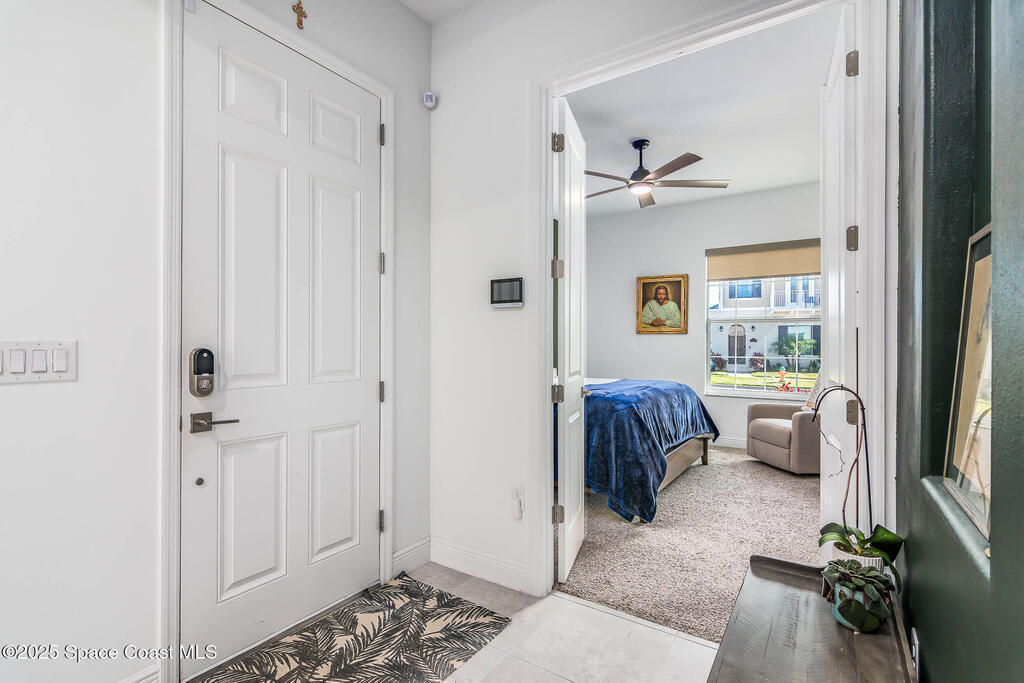 Experience modern luxury in this stunning 2022 home w/premium upgrades throughout. The kitchen space features a large center island, quartz countertops, Samsung Bespoke fridge, touch-enabled faucet & upgraded cabinetry. Elegant tile floors grace all living areas. An expansive great room w/10' ceilings & 9' sliding glass doors opens to a private 600 sqft paver courtyard--pre-plumbed for outdoor kitchen (water & gas). The owner's suite offers a walk-in closet, dual sinks, tub & shower. Upstairs,2 bdrms provide flexibility for guests or office, w/French doors to a private balcony w/lake views. Impact windows on 2nd floor & front provide storm protection. Smart home features include WiFi-enabled garage door, Nest front camera & door lock, plus security system on every door & window. Enjoy resort-style community amenities: 2 pools, tennis, pickleball & indoor basketball court. Minutes from Costco, Publix, A+ schools, Viera Hospital & The Avenues shops. Easy I-95 access & 20 min to the beach