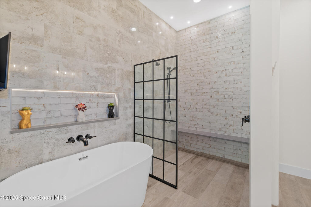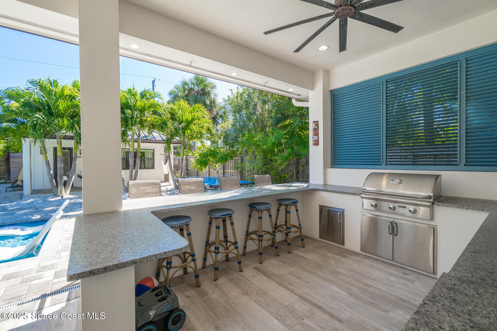 Welcome to your modern beachside oasis. Tucked between the Atlantic Ocean and the Banana River, in the coveted Snug Harbor community of Cocoa Beach. Built in 2020, this stunning 5-bedroom, 3.5-bath residence with nearly 2,500 sqft of living space perfectly blends luxury, efficiency, and the laid-back Florida lifestyle. Every detail of this home was designed to impress, from the chef's kitchen and high end finishes to the resort style backyard that's truly an entertainer's dream. Step inside and experience an open, sun filled layout with vaulted ceilings, custom wood beam inlays and a cozy gas fireplace that anchors the living area. The heart of the home is a designer kitchen featuring an oversized island, induction cooktop, vented range hood, walk-in pantry, quartz countertops, and sleek cabinetry that combine style and function. Whether you're hosting friends or cooking a quiet meal at home, this space was built for connection. The primary suite feels like a private retreat,