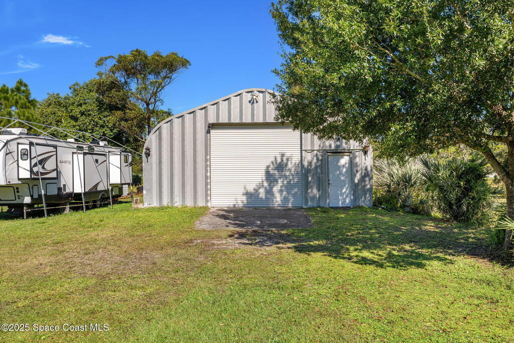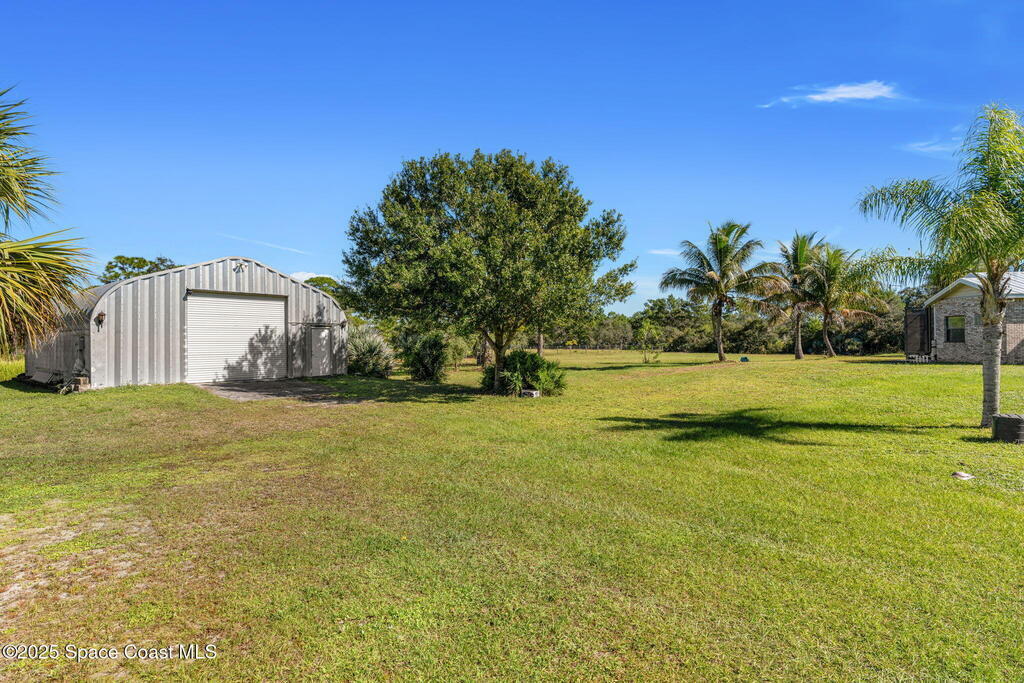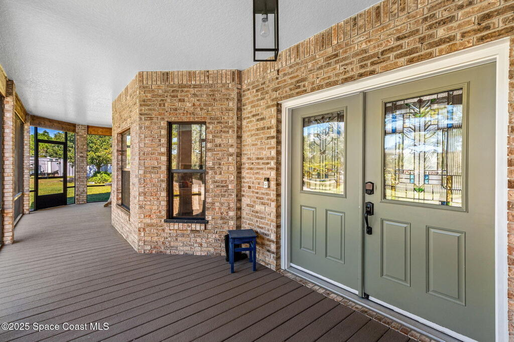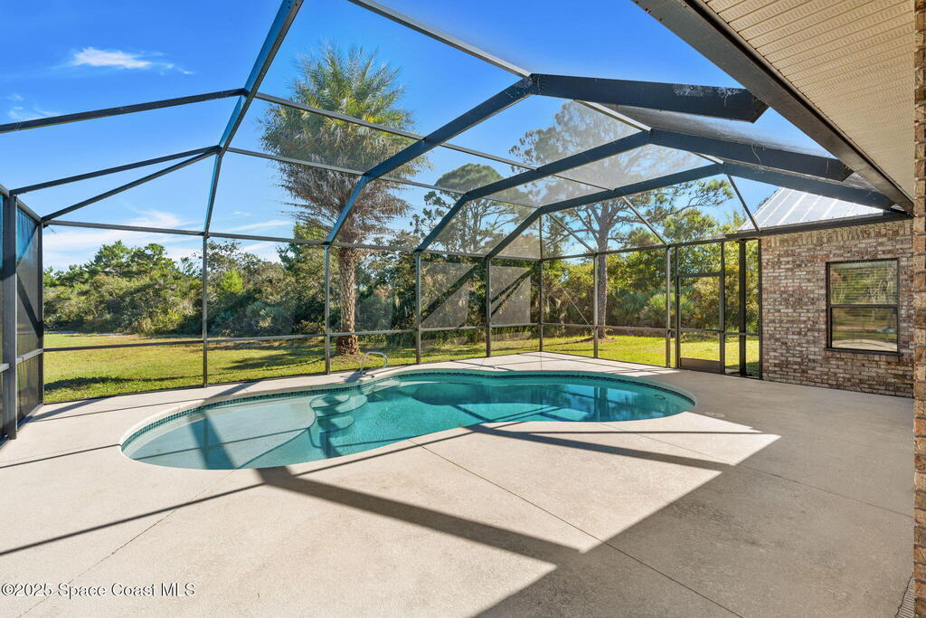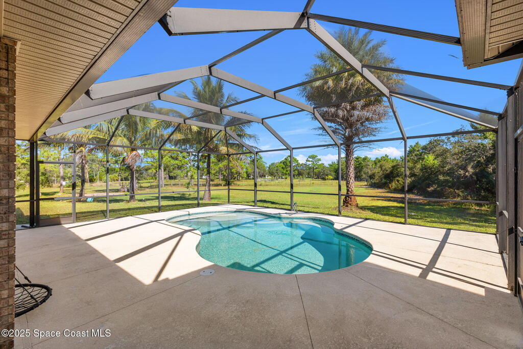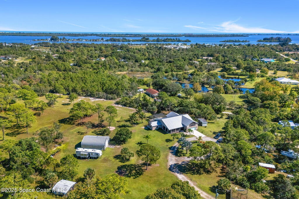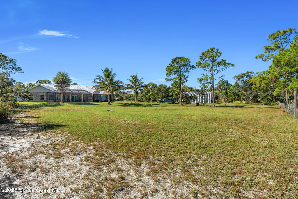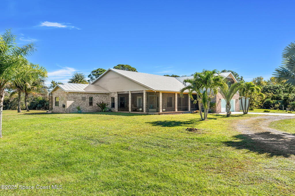 Private 2.5-Acre Estate in Grant-Valkaria! This charming 4-bed, 3-bath home offers the perfect blend of privacy, space, and quality. Built with reinforced concrete and featuring a new metal roof and hurricane shutters, this home is built to last. At its heart is a stunning kitchen with Viking appliances, custom wood cabinetry, granite counters, and a central island that opens to the living area. The spacious primary suite includes dual walk-in closets, double vanities, a soaking tub, and a glass-block walk-in shower. Upstairs, a private guest suite features a balcony and full bath. Enjoy the screened saltwater pool and oversized covered porch, perfect for entertaining or relaxing in total privacy. The 1,160 sq. ft. metal outbuilding with roll-up door is ideal for a workshop, gym, or RV/boat storage. An upgraded hydrogen water system, dedicated office with scenic views, charming screened front porch, and attached 2-car garage complete this exceptional property!