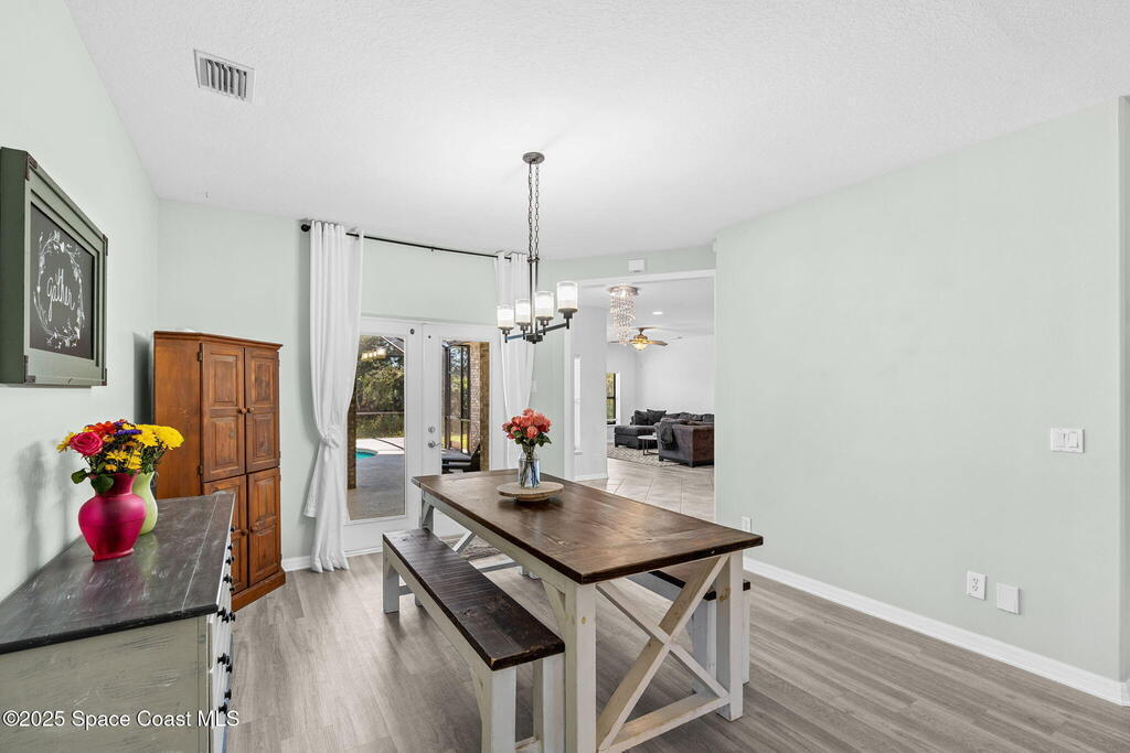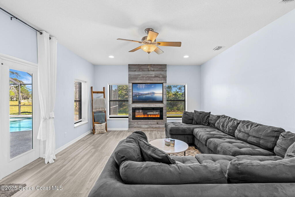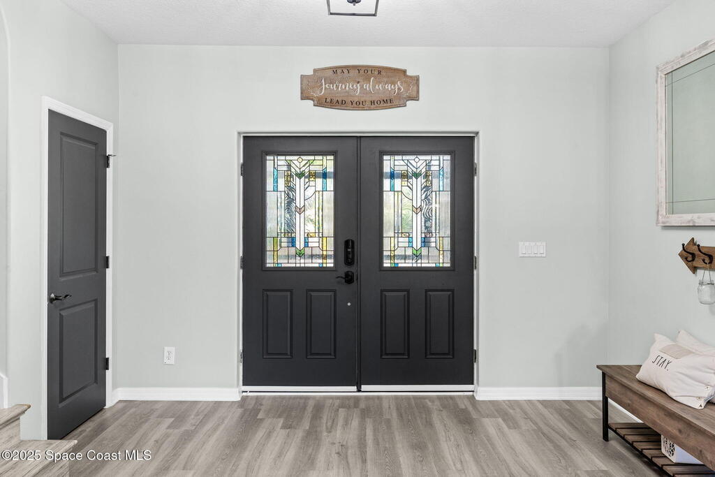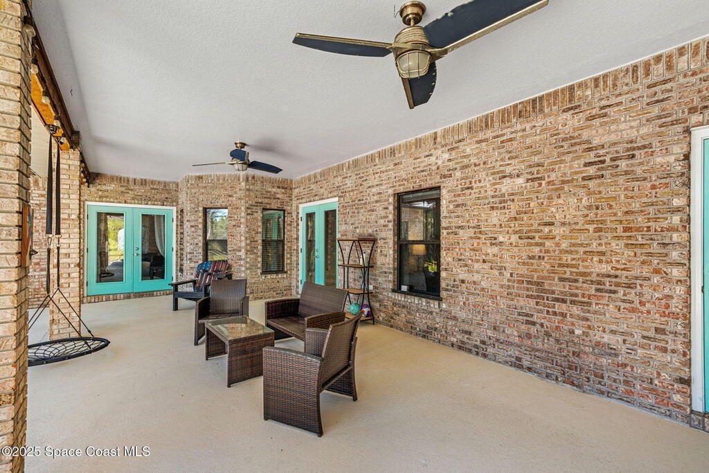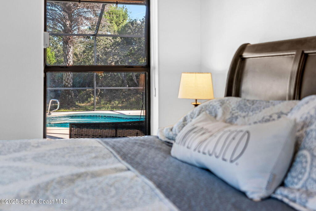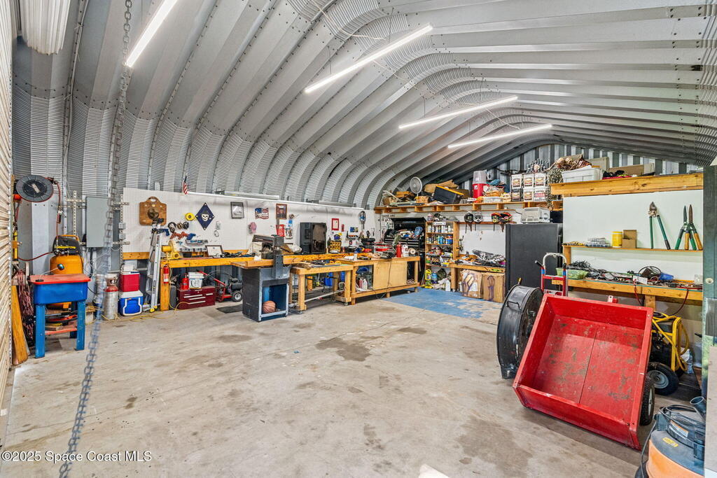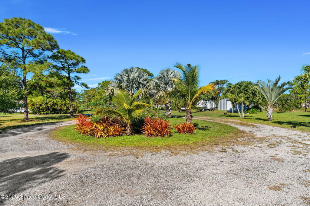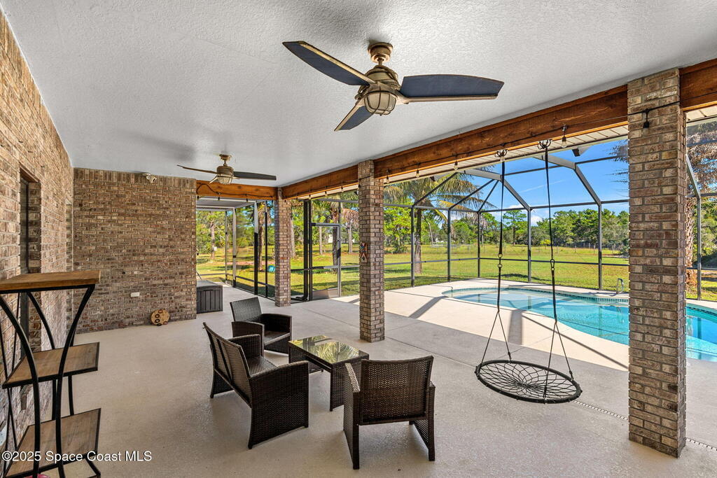 Private 2.5-Acre Estate in Grant-Valkaria! This charming 4-bed, 3-bath home offers the perfect blend of privacy, space, and quality. Built with reinforced concrete and featuring a new metal roof and hurricane shutters, this home is built to last. At its heart is a stunning kitchen with Viking appliances, custom wood cabinetry, granite counters, and a central island that opens to the living area. The spacious primary suite includes dual walk-in closets, double vanities, a soaking tub, and a glass-block walk-in shower. Upstairs, a private guest suite features a balcony and full bath. Enjoy the screened saltwater pool and oversized covered porch, perfect for entertaining or relaxing in total privacy. The 1,160 sq. ft. metal outbuilding with roll-up door is ideal for a workshop, gym, or RV/boat storage. An upgraded hydrogen water system, dedicated office with scenic views, charming screened front porch, and attached 2-car garage complete this exceptional property!