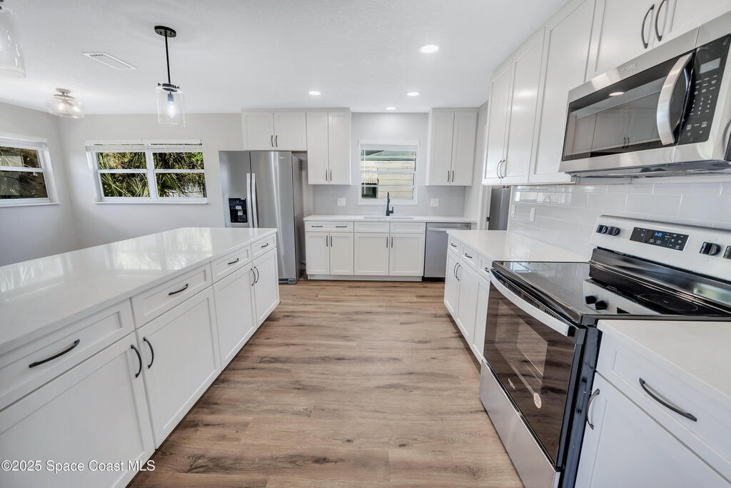 This beautifully remodeled 5-bedroom, 3-bath home in Fairway Estates of Rockledge offers the perfect blend of modern comfort and timeless charm. Step inside to find a bright, open layout featuring a stunning new kitchen with sleek cabinetry, quartz countertops, and stainless steel appliances. The spacious living areas are accented by new wood-look tile flooring throughout, while two bedrooms feature en-suite baths, ideal for guests or multi-generational living. This move-in-ready home combines style, function, and location.