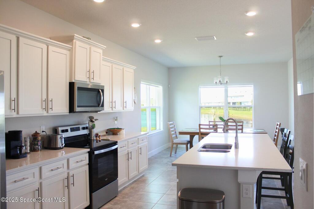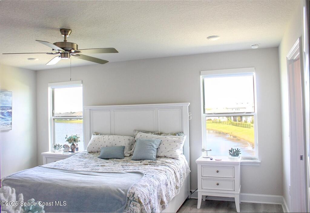 Perched gracefully above the surrounding landscape, this stunning residence captures tranquil water views and an abundance of natural light. Step inside to discover soaring ceilings and walls of windows that illuminate the open-concept living area and center-island kitchen perfect for entertaining or everyday living. The kitchen features crisp white cabinetry accented by sleek silver hardware, blending modern style with timeless appeal.The first floor is beautifully appointed with tile flooring throughout, offering both durability and easy maintenance. Upstairs, a spacious family loft provides the perfect retreat or flex space. The owner's suite impresses with a massive walk-in closet, dual vanities, and a luxurious bath with both soaking tub and separate shower. Three additional guest bedrooms, some with walk-in closets, share another full bathroom, giving everyone room to unwind.