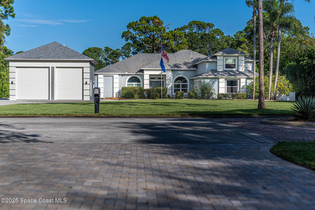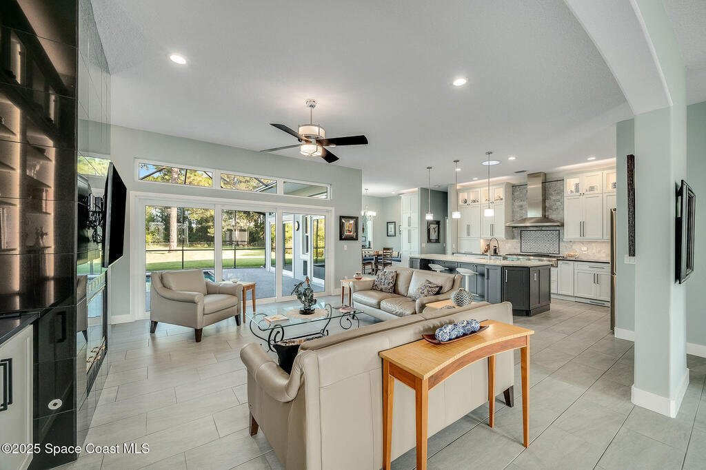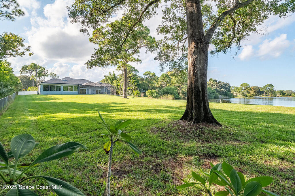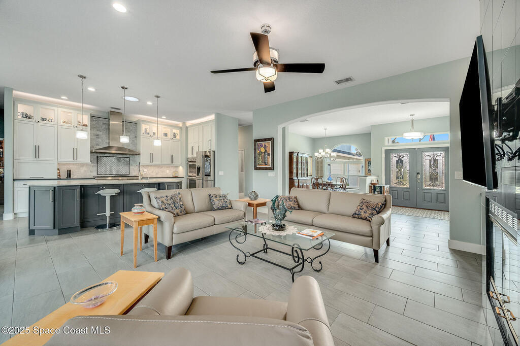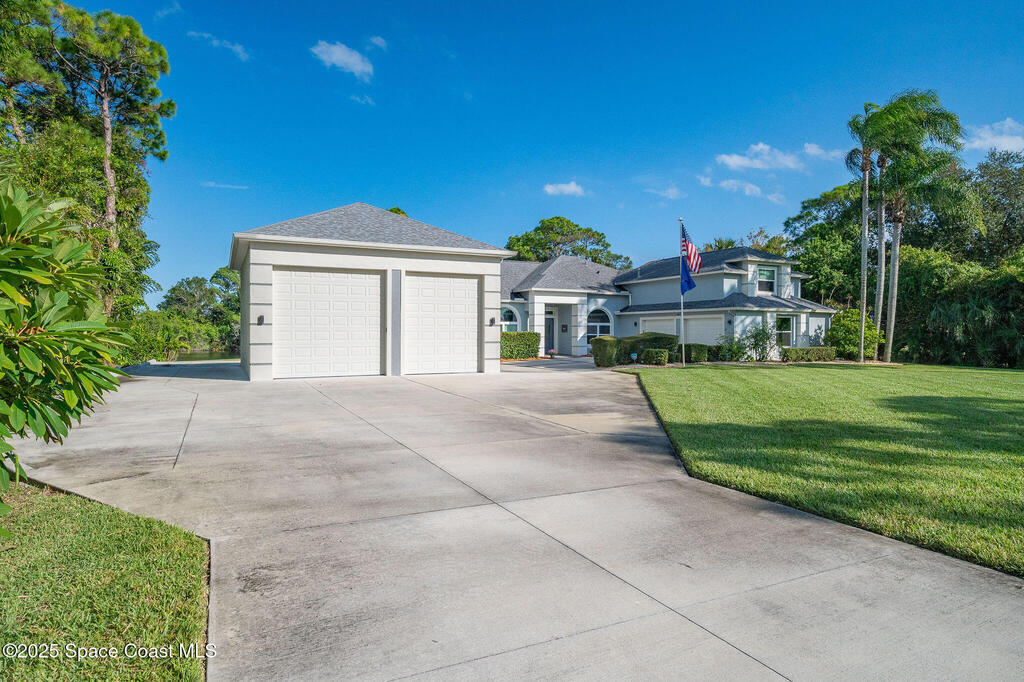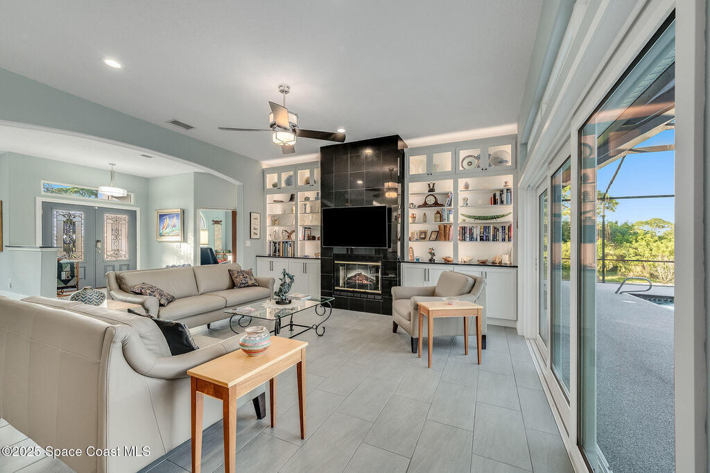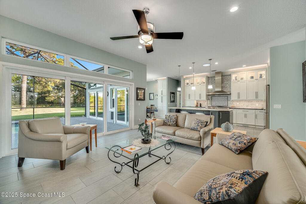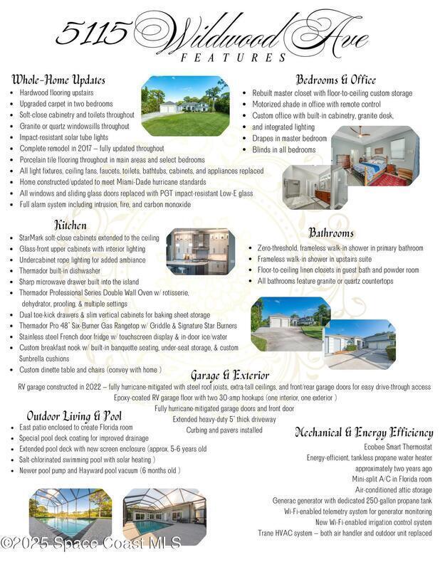 Discover refined lakefront living on 1.28 acres in The Trails, one of North Merritt Island's most sought-after communities. This 5-bedroom, 3.5-bath residence was fully remodeled in 2017 and offers luxury finishes, modern systems, and exceptional craftsmanship throughout. The interior showcases porcelain tile flooring in main areas, hardwood upstairs, and a chef's kitchen with StarMark soft-close cabinetry, glass-front uppers, under-cabinet lighting, and a full suite of Thermador appliances including double wall ovens, six-burner gas range, and dishwasher, plus a stainless French-door refrigerator and Sharp microwave drawer. Spa-inspired bathrooms feature frameless zero-threshold showers and granite or quartz counters. Additional highlights include a custom office with built-ins, an enclosed Florida room with mini-split A/C, Ecobee Smart Thermostat, tankless propane water heater, and newer Trane HVAC. The property features a 2-car attached garage and a 2022 constructed 2-bay RV