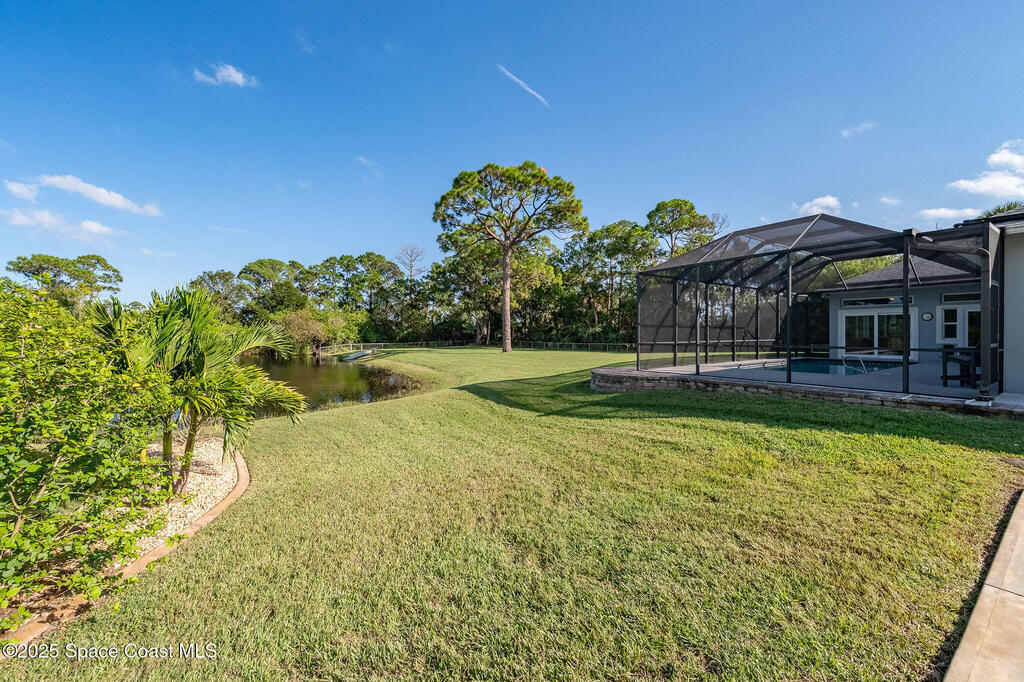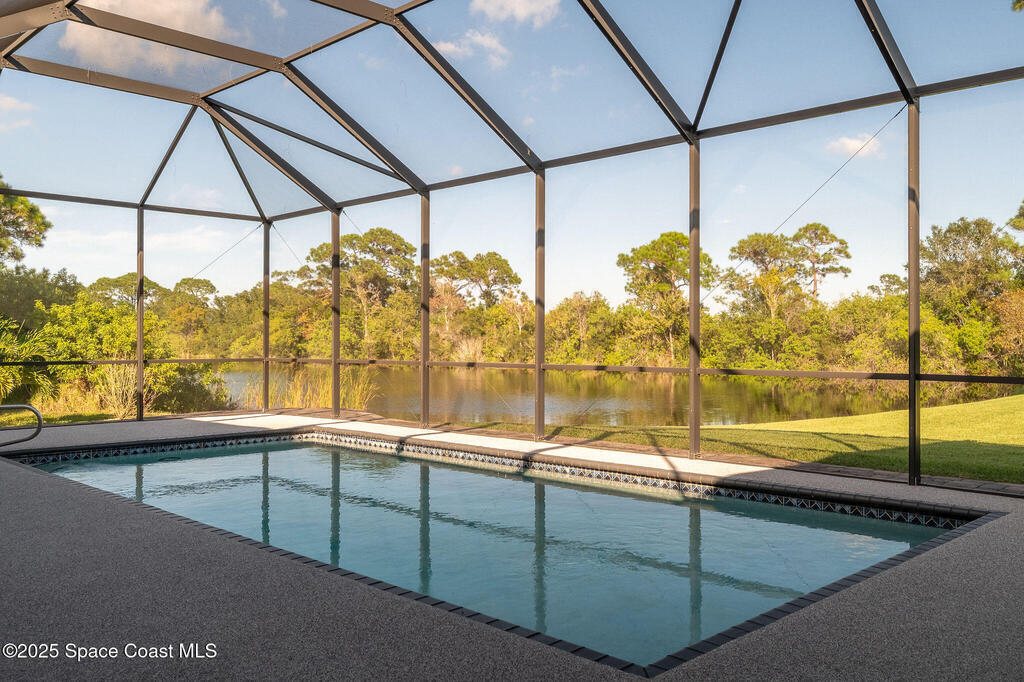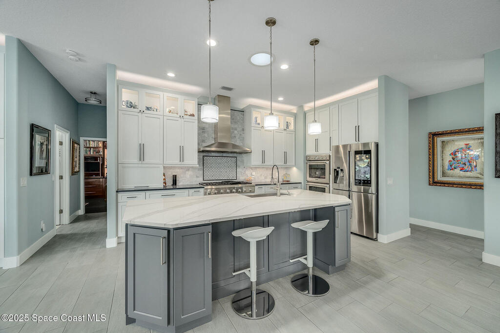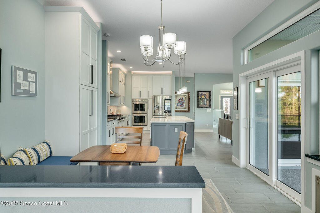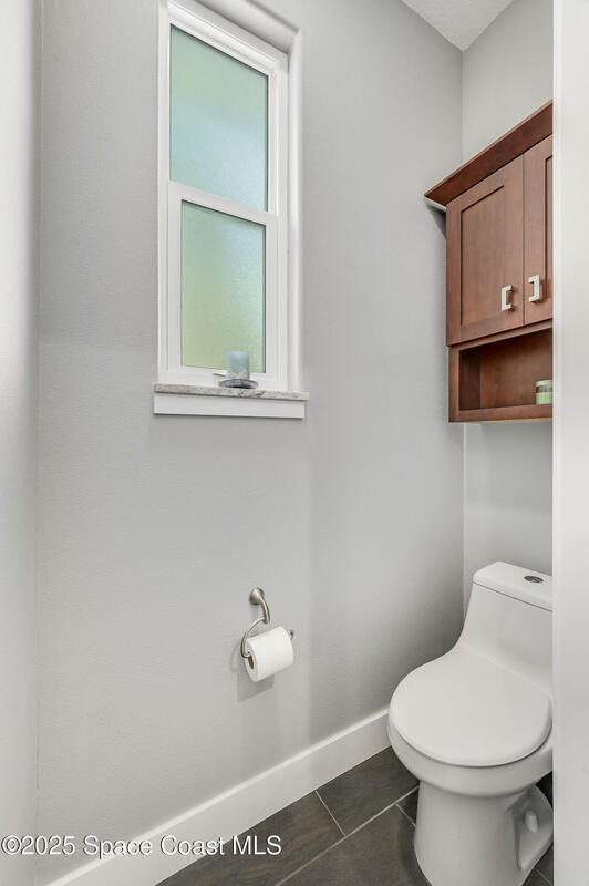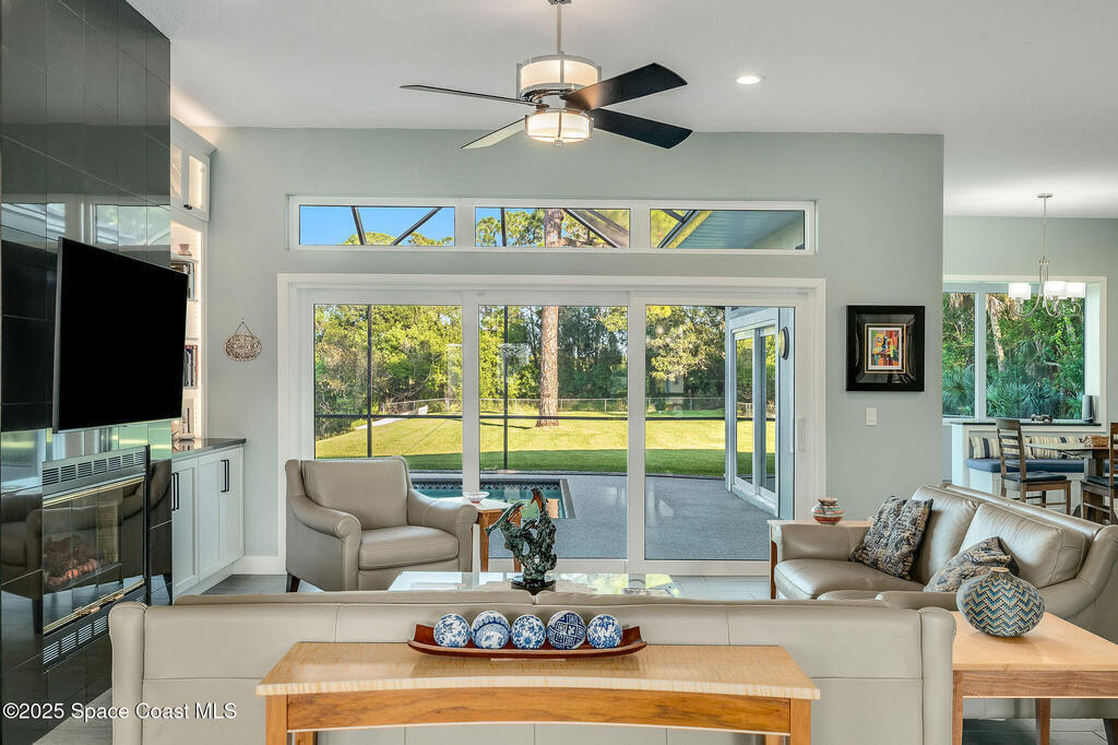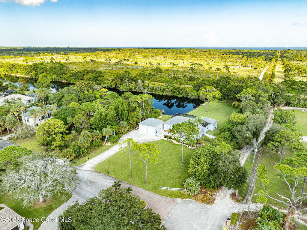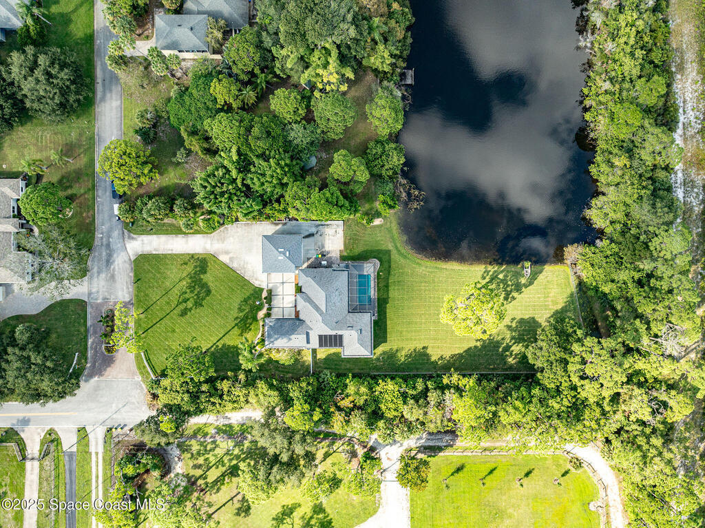 Discover refined lakefront living on 1.28 acres in The Trails, one of North Merritt Island's most sought-after communities. This 5-bedroom, 3.5-bath residence was fully remodeled in 2017 and offers luxury finishes, modern systems, and exceptional craftsmanship throughout. The interior showcases porcelain tile flooring in main areas, hardwood upstairs, and a chef's kitchen with StarMark soft-close cabinetry, glass-front uppers, under-cabinet lighting, and a full suite of Thermador appliances including double wall ovens, six-burner gas range, and dishwasher, plus a stainless French-door refrigerator and Sharp microwave drawer. Spa-inspired bathrooms feature frameless zero-threshold showers and granite or quartz counters. Additional highlights include a custom office with built-ins, an enclosed Florida room with mini-split A/C, Ecobee Smart Thermostat, tankless propane water heater, and newer Trane HVAC. The property features a 2-car attached garage and a 2022 constructed 2-bay RV
