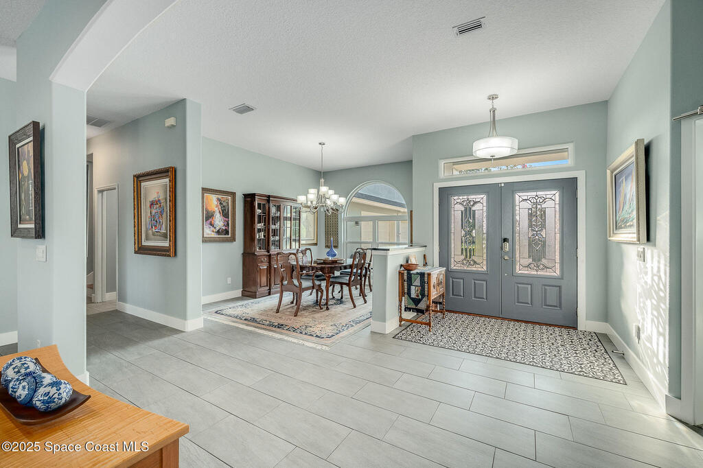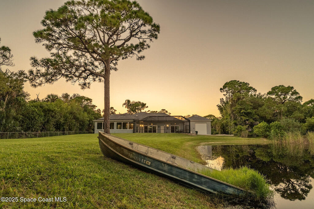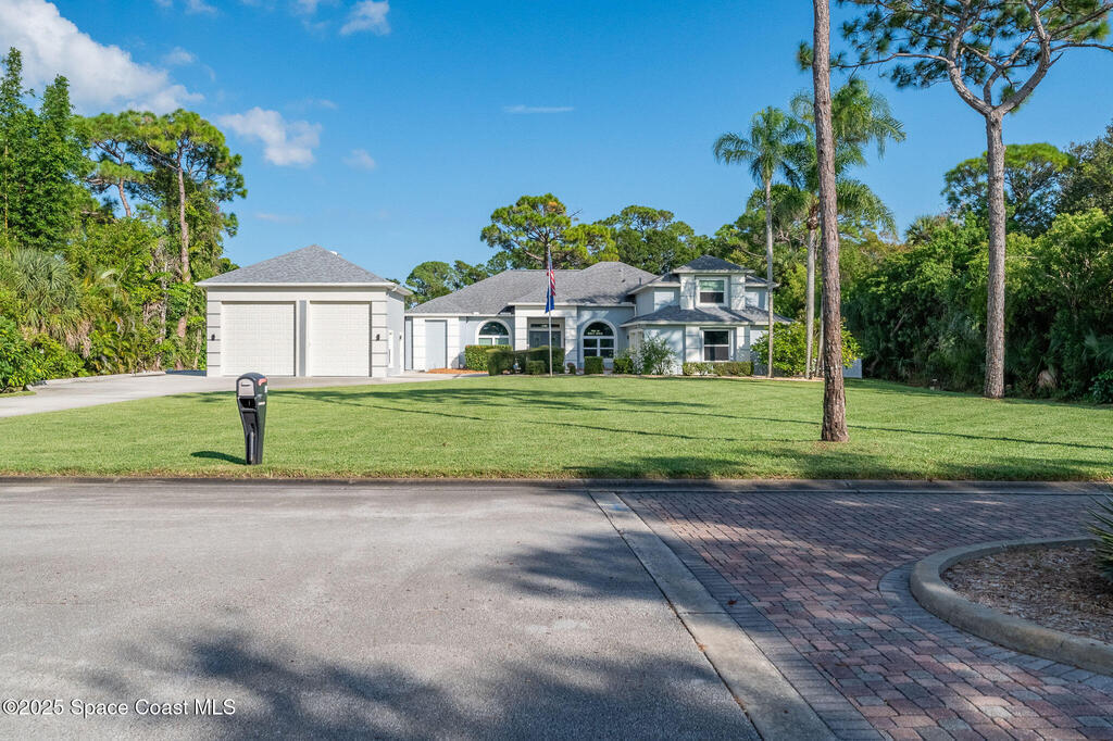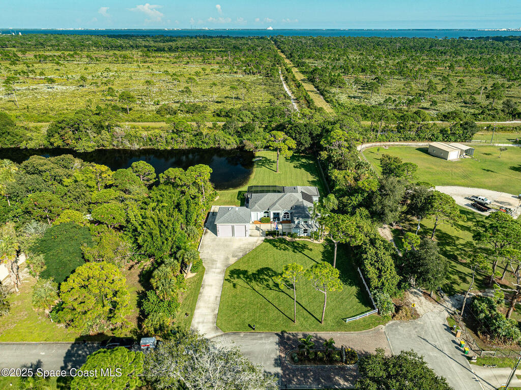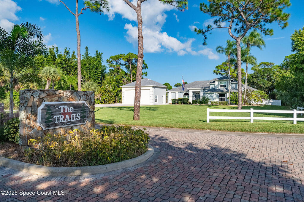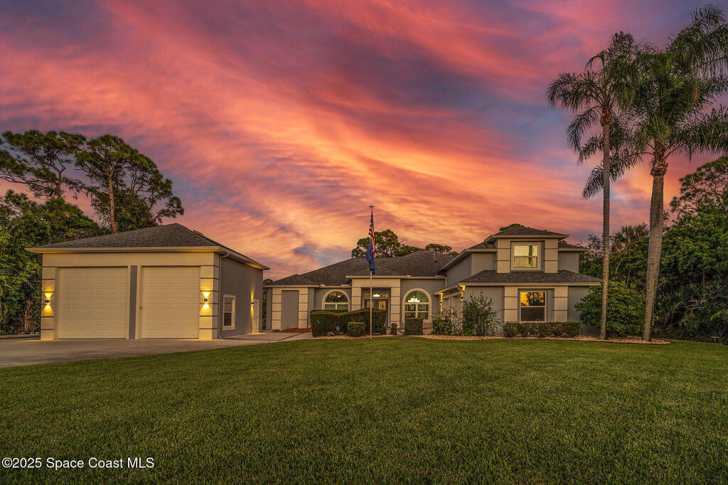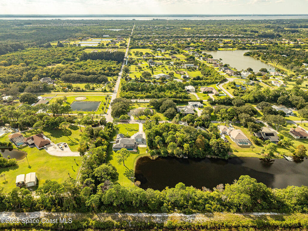 Discover refined lakefront living on 1.28 acres in The Trails, one of North Merritt Island's most sought-after communities. This 5-bedroom, 3.5-bath residence was fully remodeled in 2017 and offers luxury finishes, modern systems, and exceptional craftsmanship throughout. The interior showcases porcelain tile flooring in main areas, hardwood upstairs, and a chef's kitchen with StarMark soft-close cabinetry, glass-front uppers, under-cabinet lighting, and a full suite of Thermador appliances including double wall ovens, six-burner gas range, and dishwasher, plus a stainless French-door refrigerator and Sharp microwave drawer. Spa-inspired bathrooms feature frameless zero-threshold showers and granite or quartz counters. Additional highlights include a custom office with built-ins, an enclosed Florida room with mini-split A/C, Ecobee Smart Thermostat, tankless propane water heater, and newer Trane HVAC. The property features a 2-car attached garage and a 2022 constructed 2-bay RV