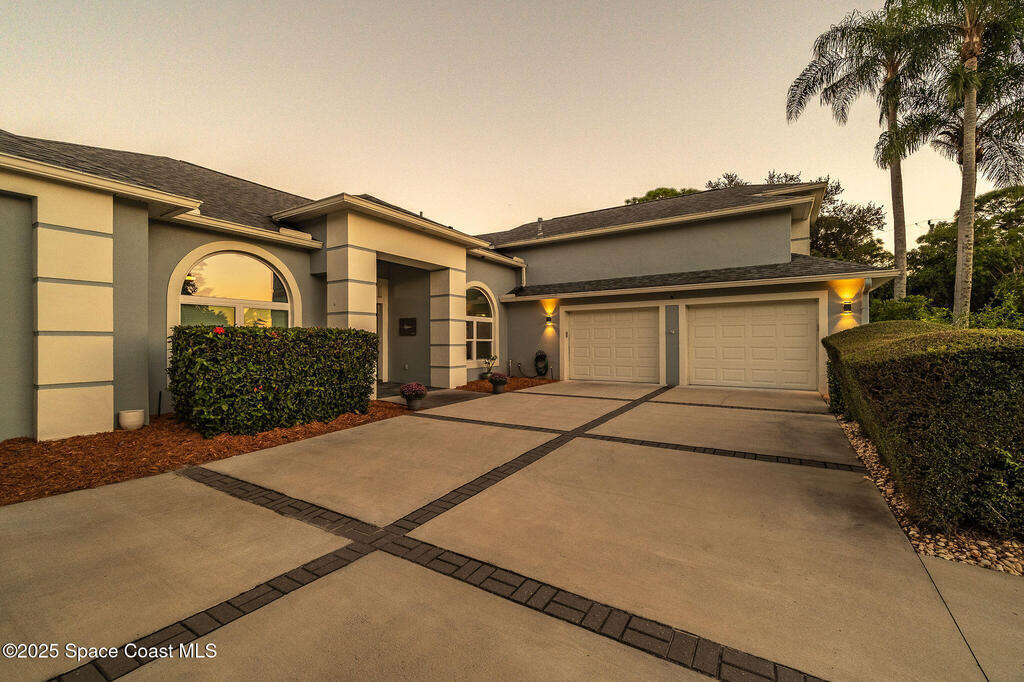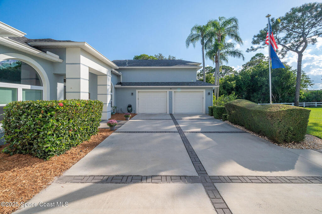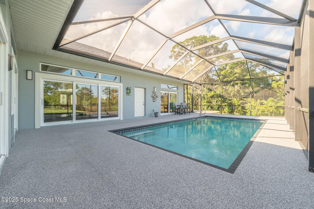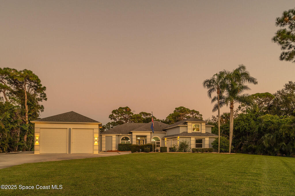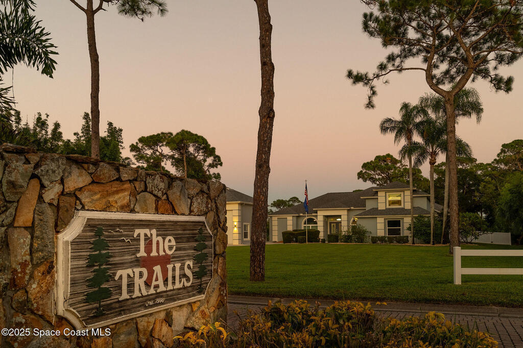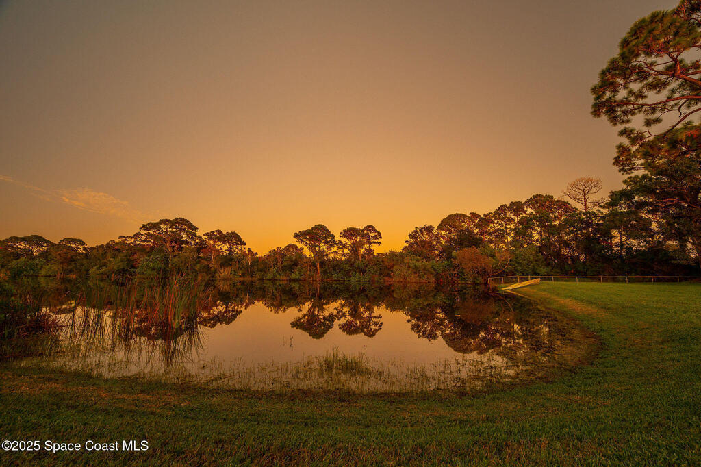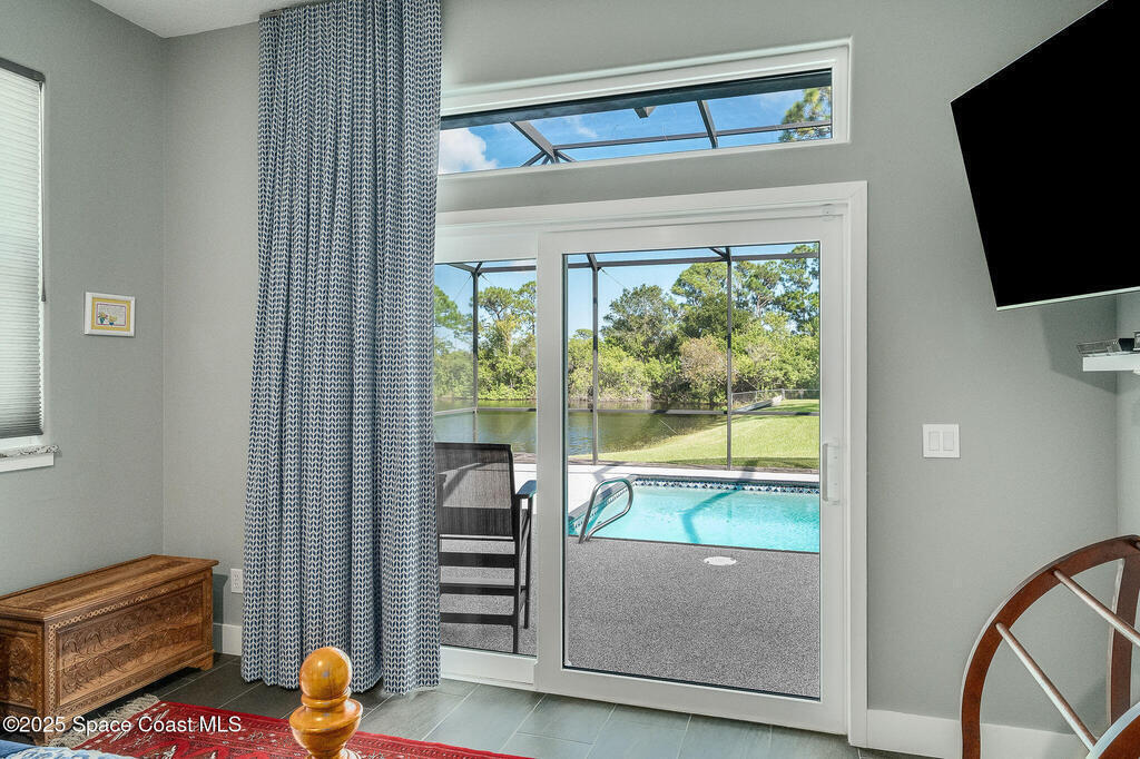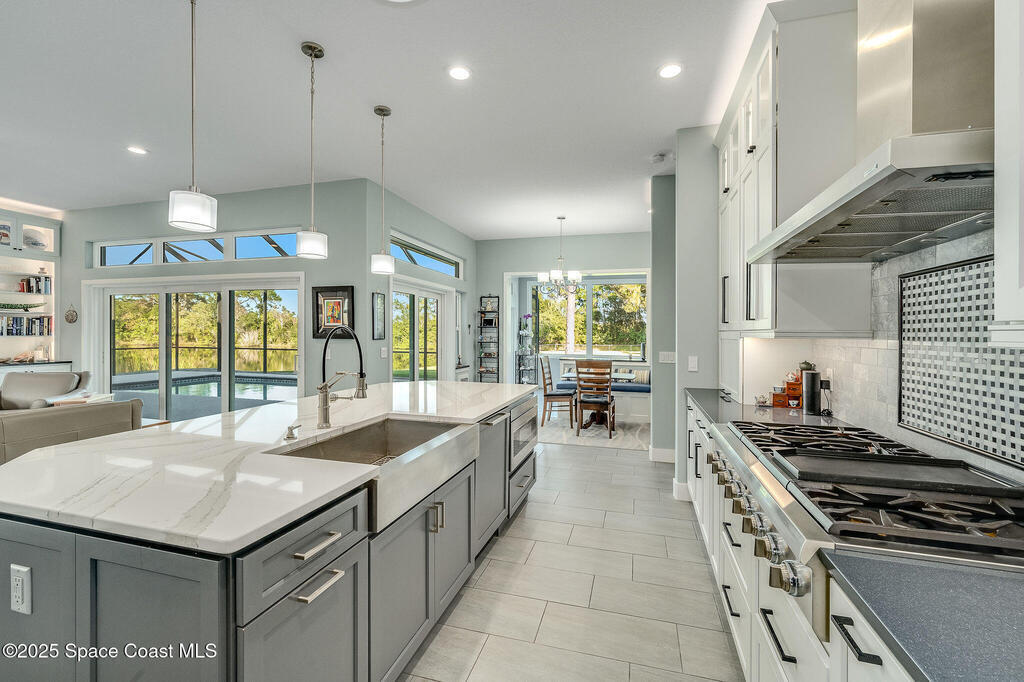Discover refined lakefront living on 1.28 acres in The Trails, one of North Merritt Island's most sought-after communities. This 5-bedroom, 3.5-bath residence was fully remodeled in 2017 and offers luxury finishes, modern systems, and exceptional craftsmanship throughout. The interior showcases porcelain tile flooring in main areas, hardwood upstairs, and a chef's kitchen with StarMark soft-close cabinetry, glass-front uppers, under-cabinet lighting, and a full suite of Thermador appliances including double wall ovens, six-burner gas range, and dishwasher, plus a stainless French-door refrigerator and Sharp microwave drawer. Spa-inspired bathrooms feature frameless zero-threshold showers and granite or quartz counters. Additional highlights include a custom office with built-ins, an enclosed Florida room with mini-split A/C, Ecobee Smart Thermostat, tankless propane water heater, and newer Trane HVAC. The property features a 2-car attached garage and a 2022 constructed 2-bay RV