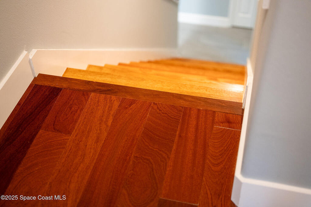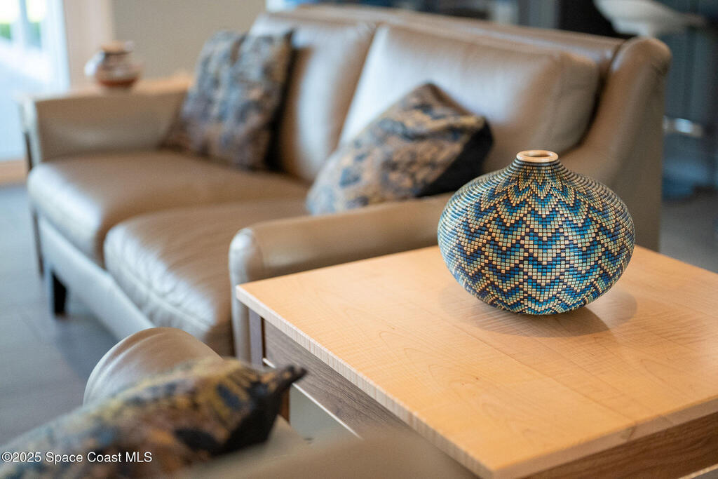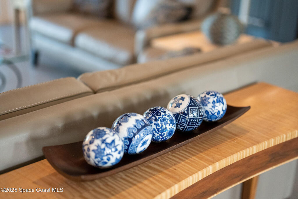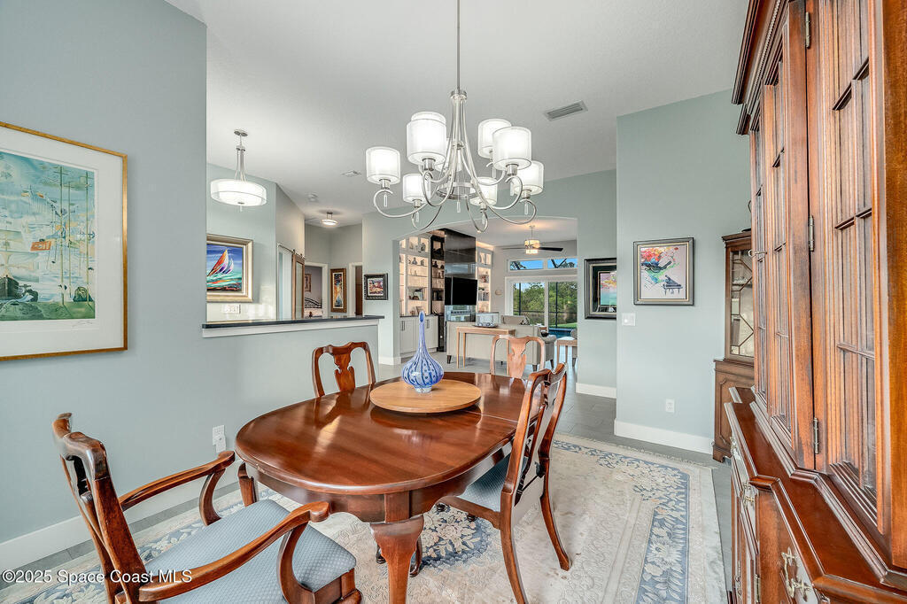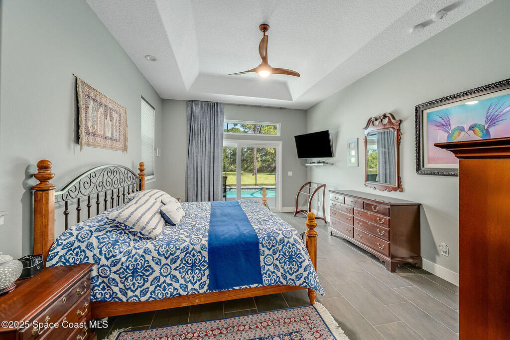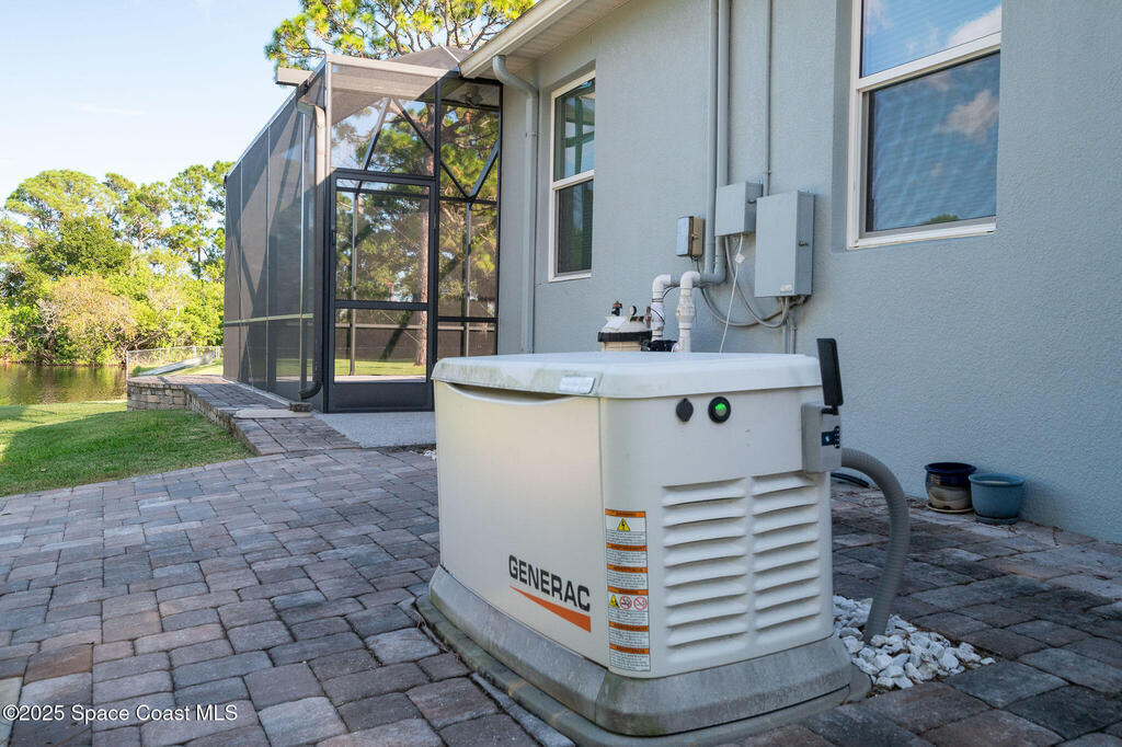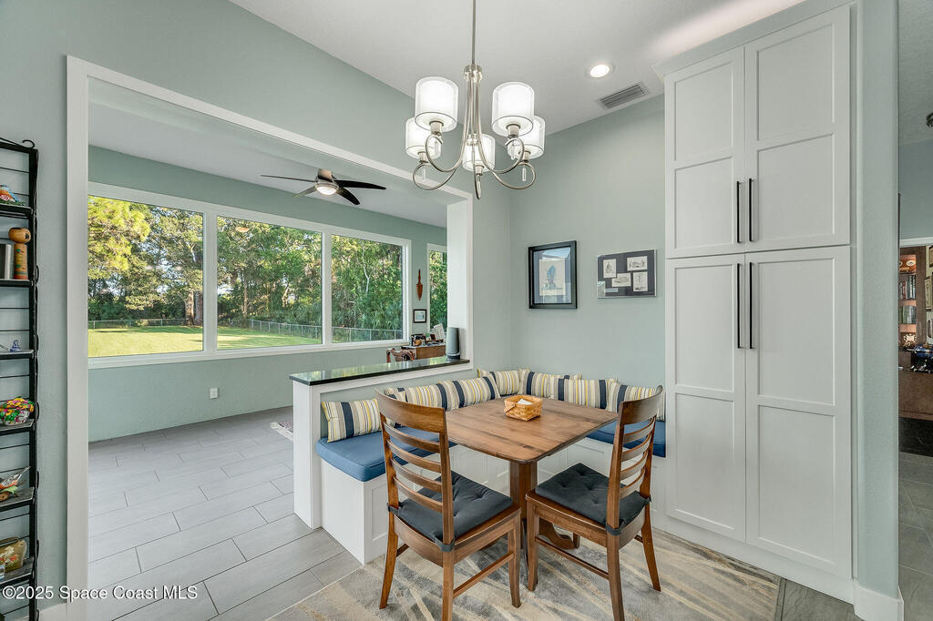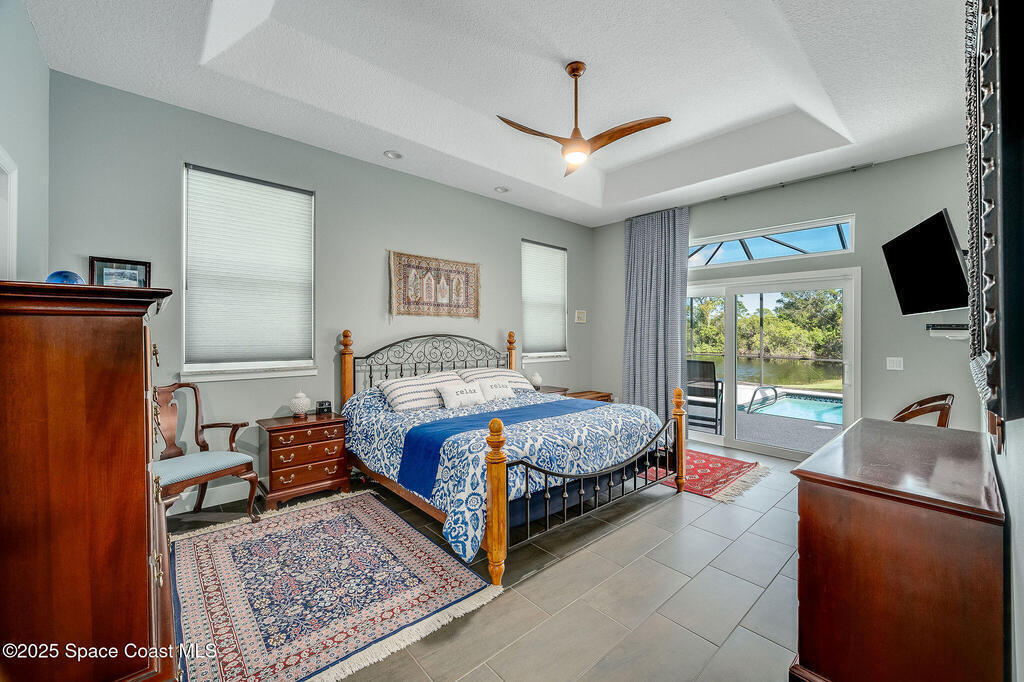 Discover refined lakefront living on 1.28 acres in The Trails, one of North Merritt Island's most sought-after communities. This 5-bedroom, 3.5-bath residence was fully remodeled in 2017 and offers luxury finishes, modern systems, and exceptional craftsmanship throughout. The interior showcases porcelain tile flooring in main areas, hardwood upstairs, and a chef's kitchen with StarMark soft-close cabinetry, glass-front uppers, under-cabinet lighting, and a full suite of Thermador appliances including double wall ovens, six-burner gas range, and dishwasher, plus a stainless French-door refrigerator and Sharp microwave drawer. Spa-inspired bathrooms feature frameless zero-threshold showers and granite or quartz counters. Additional highlights include a custom office with built-ins, an enclosed Florida room with mini-split A/C, Ecobee Smart Thermostat, tankless propane water heater, and newer Trane HVAC. The property features a 2-car attached garage and a 2022 constructed 2-bay RV