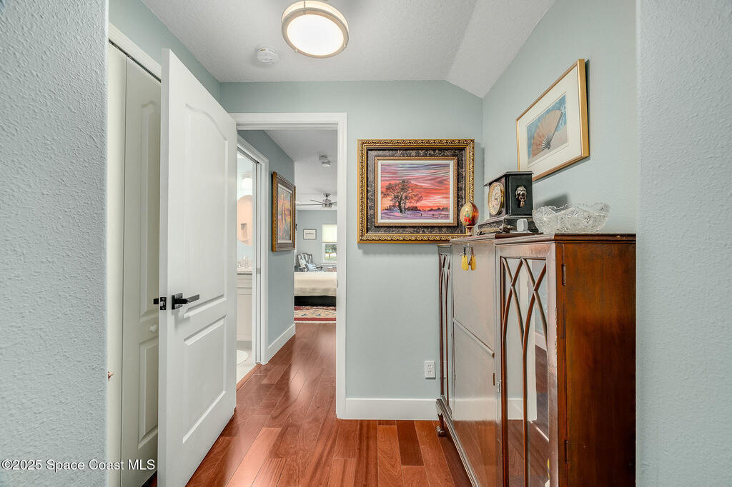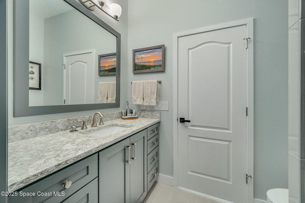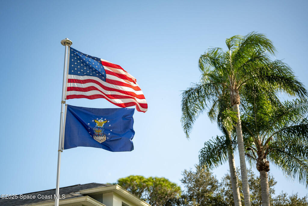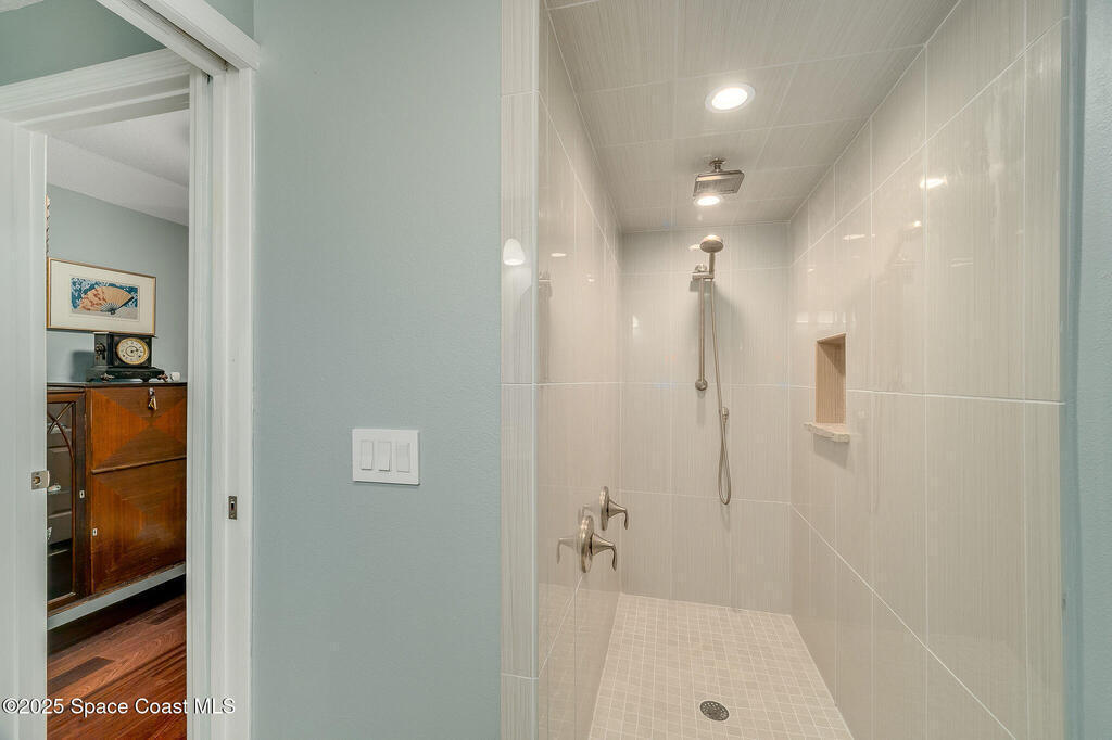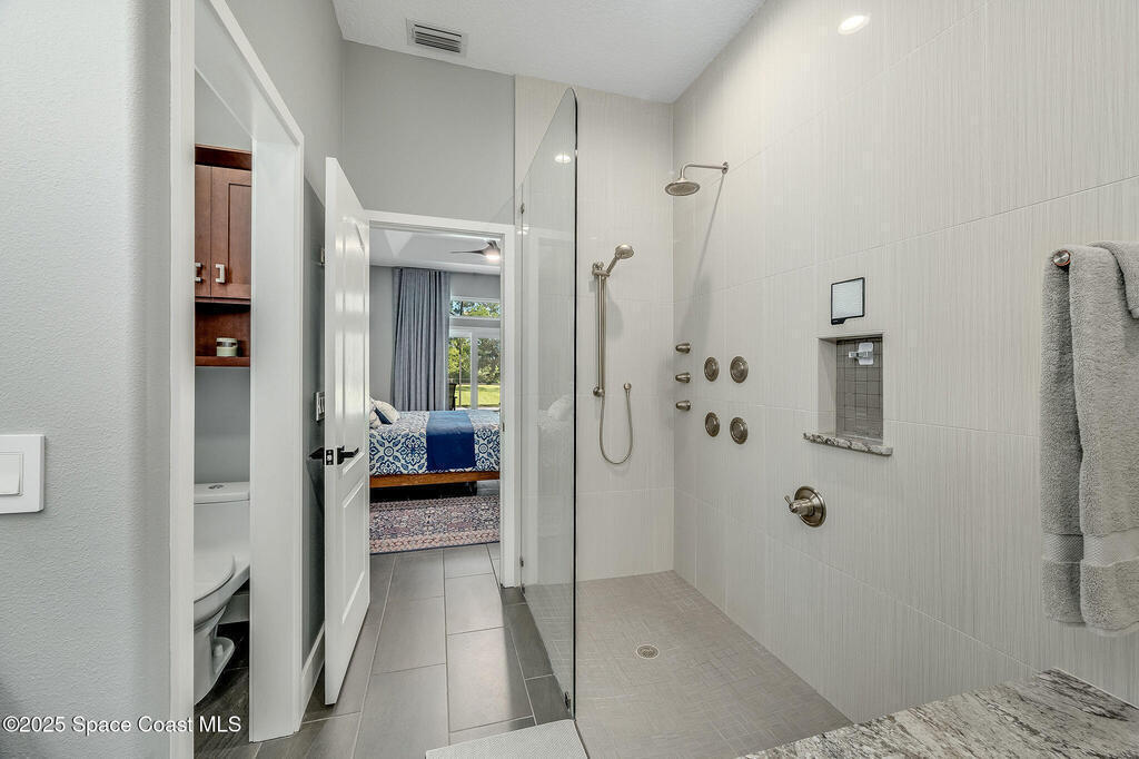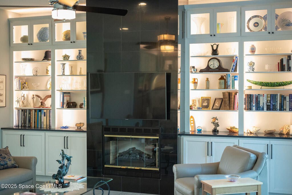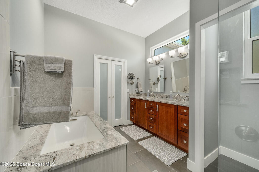 Discover refined lakefront living on 1.28 acres in The Trails, one of North Merritt Island's most sought-after communities. This 5-bedroom, 3.5-bath residence was fully remodeled in 2017 and offers luxury finishes, modern systems, and exceptional craftsmanship throughout. The interior showcases porcelain tile flooring in main areas, hardwood upstairs, and a chef's kitchen with StarMark soft-close cabinetry, glass-front uppers, under-cabinet lighting, and a full suite of Thermador appliances including double wall ovens, six-burner gas range, and dishwasher, plus a stainless French-door refrigerator and Sharp microwave drawer. Spa-inspired bathrooms feature frameless zero-threshold showers and granite or quartz counters. Additional highlights include a custom office with built-ins, an enclosed Florida room with mini-split A/C, Ecobee Smart Thermostat, tankless propane water heater, and newer Trane HVAC. The property features a 2-car attached garage and a 2022 constructed 2-bay RV