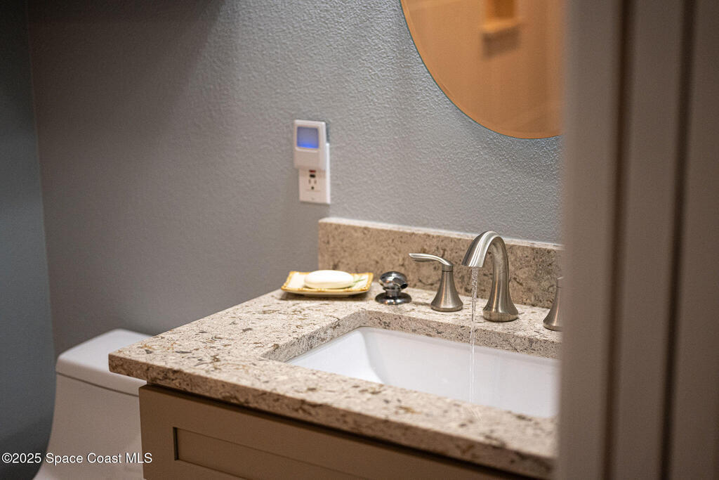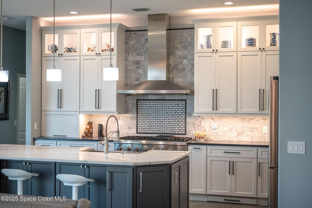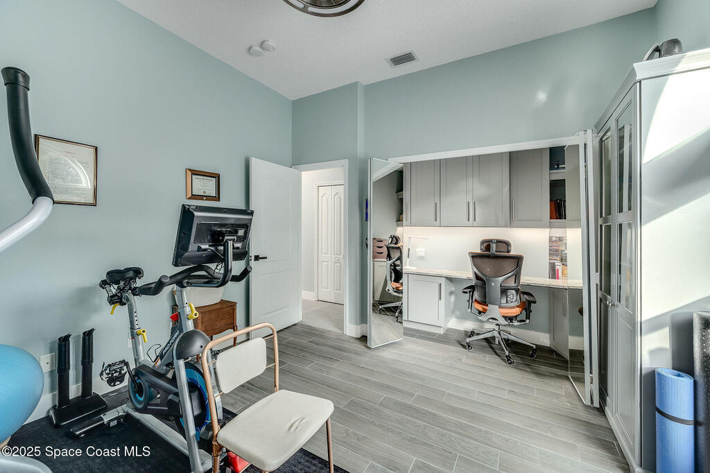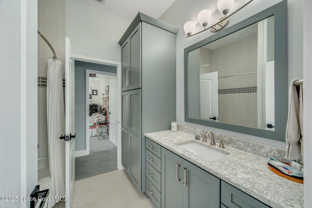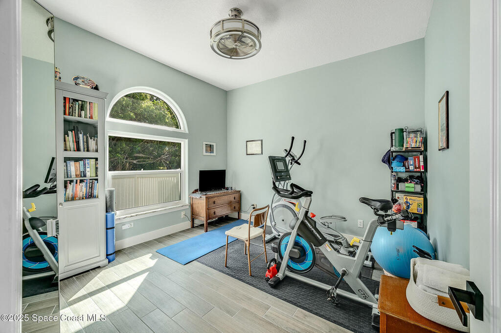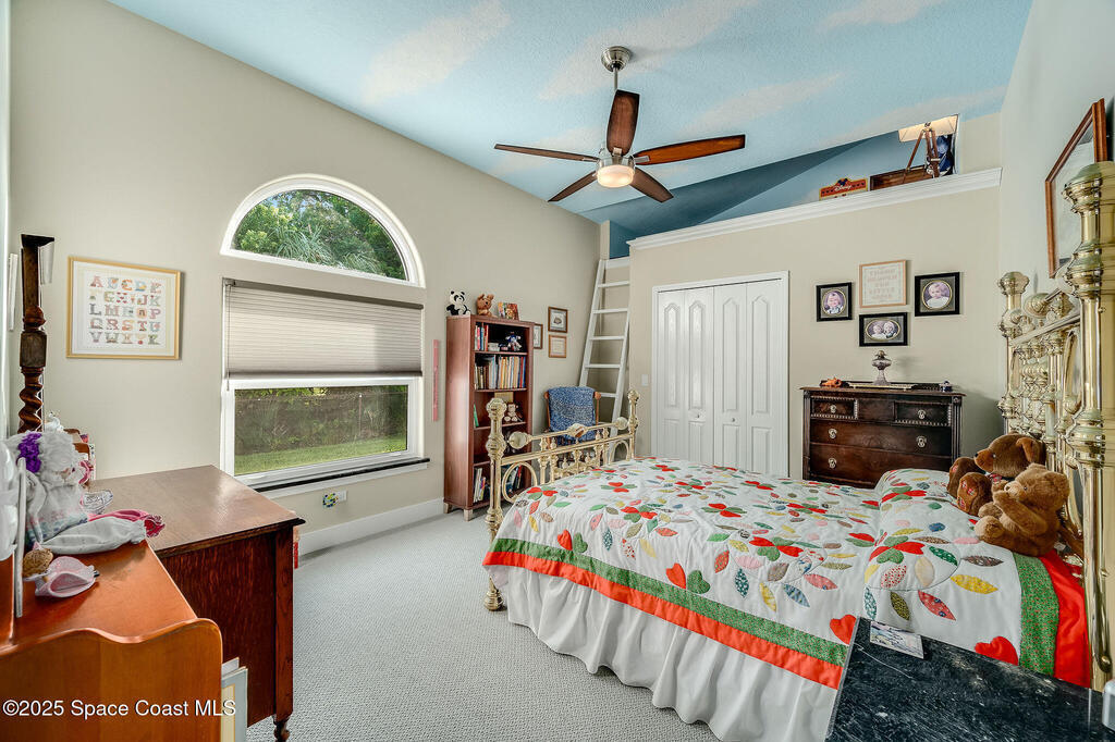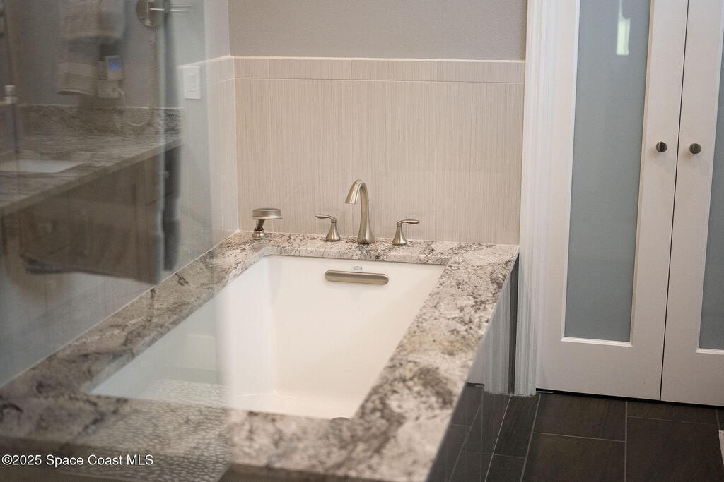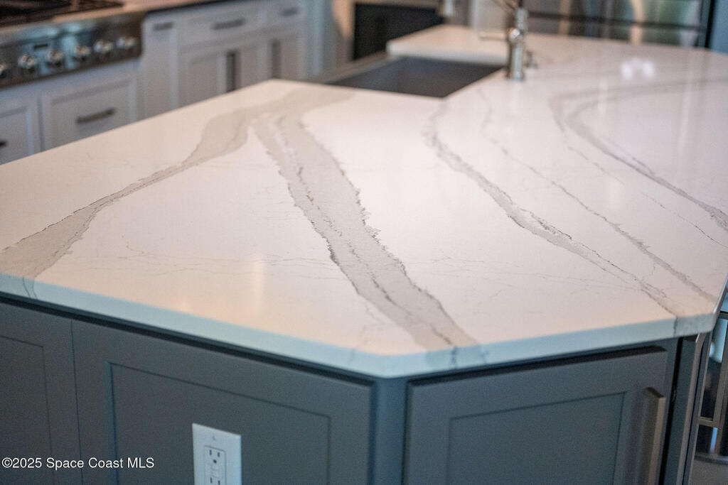 Discover refined lakefront living on 1.28 acres in The Trails, one of North Merritt Island's most sought-after communities. This 5-bedroom, 3.5-bath residence was fully remodeled in 2017 and offers luxury finishes, modern systems, and exceptional craftsmanship throughout. The interior showcases porcelain tile flooring in main areas, hardwood upstairs, and a chef's kitchen with StarMark soft-close cabinetry, glass-front uppers, under-cabinet lighting, and a full suite of Thermador appliances including double wall ovens, six-burner gas range, and dishwasher, plus a stainless French-door refrigerator and Sharp microwave drawer. Spa-inspired bathrooms feature frameless zero-threshold showers and granite or quartz counters. Additional highlights include a custom office with built-ins, an enclosed Florida room with mini-split A/C, Ecobee Smart Thermostat, tankless propane water heater, and newer Trane HVAC. The property features a 2-car attached garage and a 2022 constructed 2-bay RV