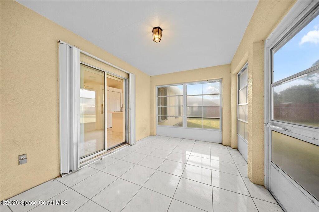 Welcome home to this charming 3-bedroom, 2-bath home in desirable NE Palm Bay! Step through the screened front entry into a spacious living and dining area, perfect for relaxing or entertaining. The kitchen features a convenient breakfast bar and plenty of counter space. The roomy primary bedroom offers a private vanity area, while two additional bedrooms and a full guest bath provide space for family or guests. Enjoy Florida living year-round from the large screened porch with vinyl windows and fenced back yard. Additional highlights include a 2-car garage with screen sliders and laundry hookups. Basic lawn service is included in the rent -- move right in and start enjoying the Florida lifestyle! Dryer included but not warranted. Owner will consider pets on a case by case basis but absolutely no cats !!