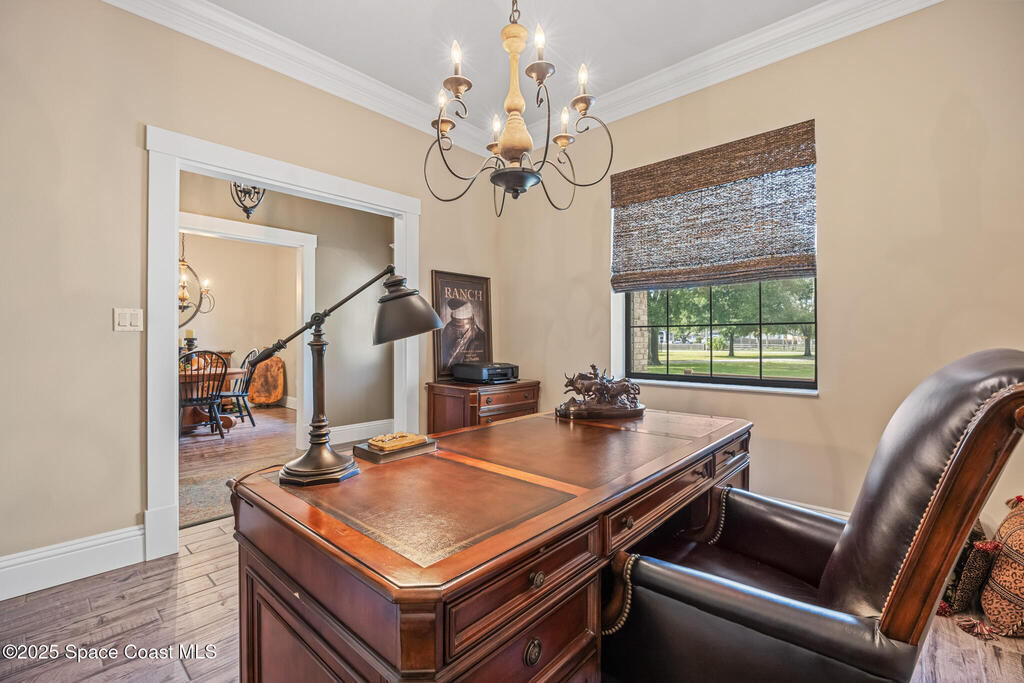 Welcome to this beautifully maintained brick-on-block home, with a sprawling 2.38 acres. This spacious home features 3 oversized bedrooms, 2 bathrooms with desirable split floor plan, separate dining room, and a dedicated office. The spacious layout is perfect for both relaxation and entertaining. Step outside to discover an impressive back porch with pavers. Nestled in the backyard of this picturesque property, you will find a tow-story workshop that exudes character and warmth, crafted from board and batten rough-sawn pine. The exterior boasts a timeless appeal, that harmonizes beautifully with the surrounding nature. You can embrace the charm and functionality of this rustic gem. The large yard offers plenty of room to relax, garden, or expand as your surrounded by the beauty of mature oak trees and vibrant crepe myrtles. Located with easy access to Kennedy space center and all major highways. This home is for anyone looking for space, function, and a bit of country charm.