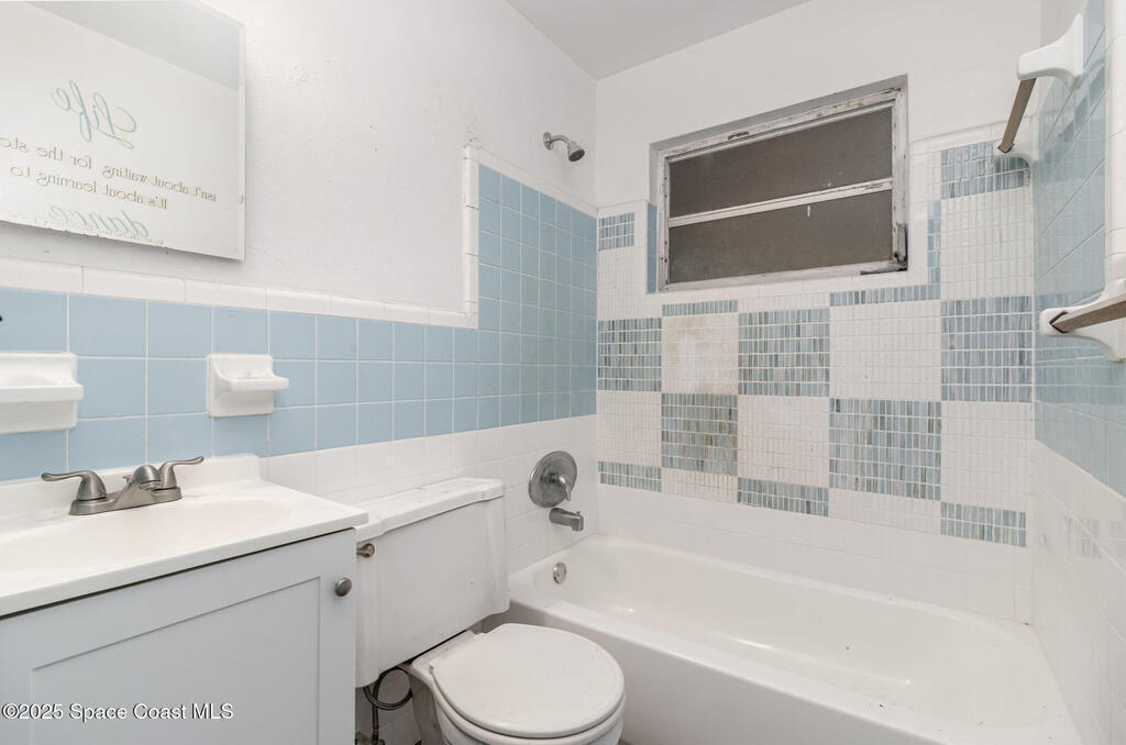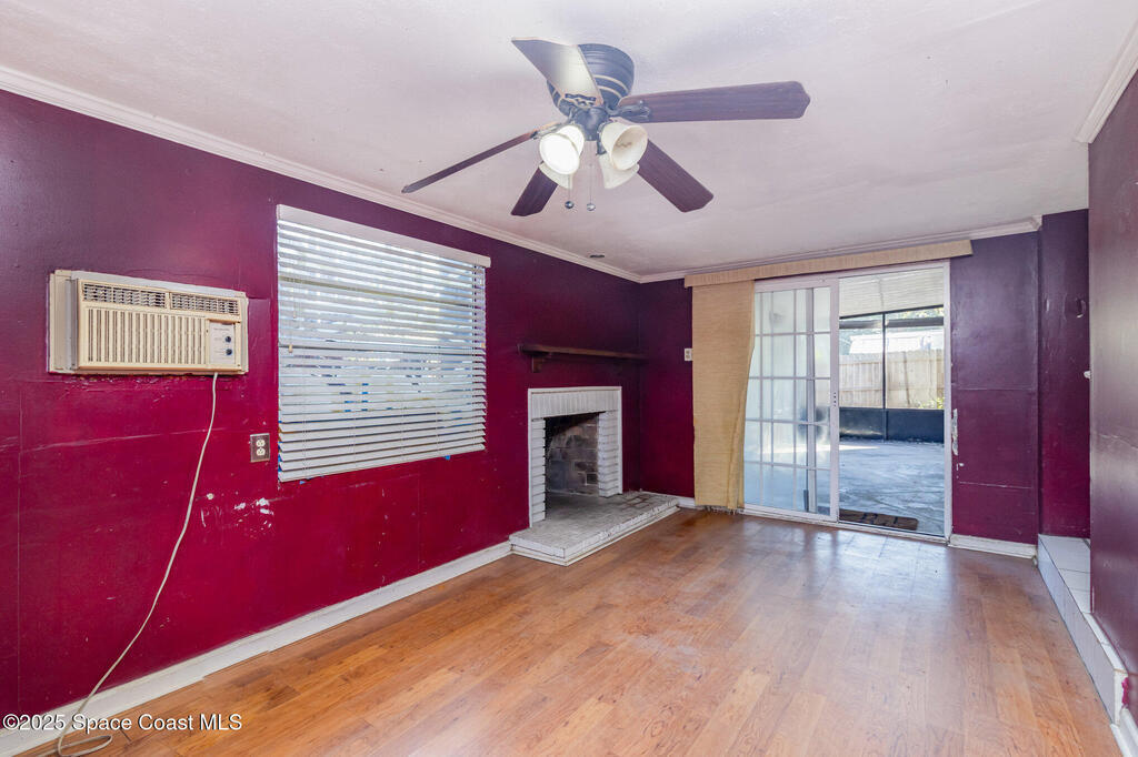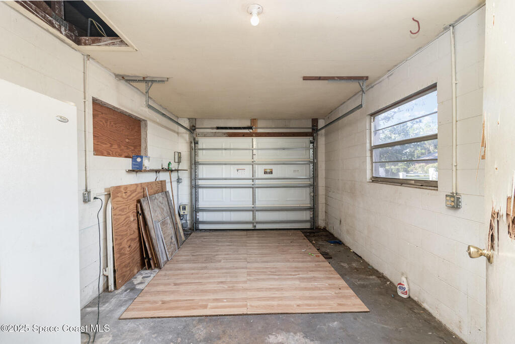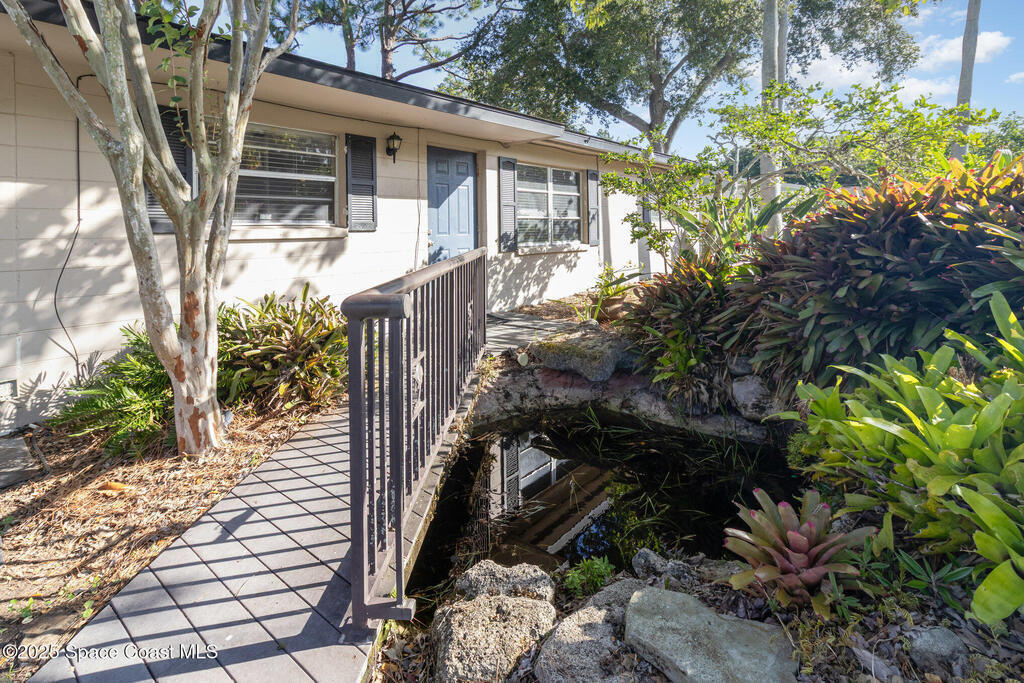 Outstanding location in South Merritt Island! 1/2 mile walk to Rotary Park. All A rated schools. Tropical landscaped front yard with large Koi pond welcomes you to this concrete block home. Incredible potential to remodel to your own taste. Cast-iron pipes have been replaced in 2022. Kitchen has already been partially removed and is a blank template ready for a fresh new look! Peaceful neighborhood of well-maintained homes and no through traffic. Open floor plan enters into living and dining room, passing through the kitchen into the family room with fireplace and sliders to the screen enclosed back porch. Was used as 3 bedroom 1.5 bath. Should be easy to modify into a 2 bathroom home. One car garage, double driveway with basketball hoop. Large backyard fenced and separated to allow one side for the kids and the other side for storage. Easy to open up completely. AC 2014. Impact garage door 2015. City Water and City Sewer!