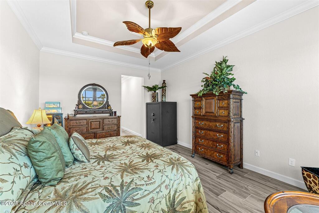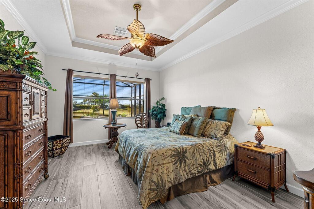 Situated on a .47-acre lot in Bridgewater, Viera's prime 55+ community, this rare sought-after Boretto plan has 3 bedrooms plus a study w/ glass doors and closet, 3 baths, garages for 3 cars and includes a front courtyard flanked by a two-car garage and a separate one car garage! Imagine having two sealed paver driveways! Must have features include tile throughout, 8' doors, tray ceilings, crown moldings, and four sliders that lead to an expanded screened lanai! The gourmet kitchen delights with stunning newer designer quartz kitchen counters, enlarged island w/disposal button and touch faucet, upgraded refrigerator and d/w, and custom shelves in pantry. Enter primary bedroom through double doors into a true retreat with luxury bath w/tub and separate tile shower, tray ceiling, walk-in closet with dual entries and built-ins! Active 55+ gated community offers a resort style clubhouse with heated pool/spa, fitness center, movie theater, tennis & pickleball courts and HOA does lawncare