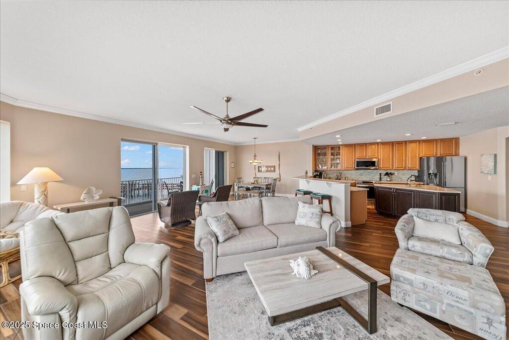 Spacious & Luxurious Riverfront Condo. Fully Furnished North East Corner Residence offers Stunning, Panoramic views of the Indian River from its expansive wrap-around balcony.The property provides 2,321 sq. ft. of Grand living space & boasts a tranquil & elegant atmosphere. Featuring 3 bedrooms, 3 bath, & a versatile den/4th bedroom. It includes designer touches and 9ft. ceilings throughout.The gourmet kitchen is equipped w/an island, breakfast bar, and Quartzite countertops w/a leather finish. It features SS appliances & an abundance of quality cabinetry. Wood plank tile flooring runs throughout the main living areas.The master suite is a true retreat, featuring sliders that open to a private balcony, plantation shutters, & two walk-in closets. The spacious master bath includes a Jacuzzi tub, separate shower, & dual vanities.Enjoy Spectacular Sunrises & watch playful dolphins from the comfort of your home,kitchen, living dining areas, & master suite all offer gorgeous river views.