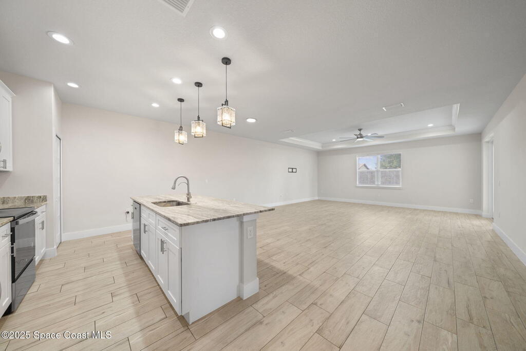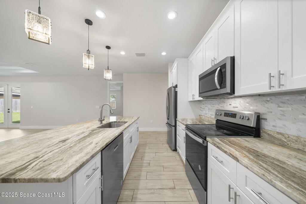 2024 Build 4 bedroom 2 bath home for rent in Northwest Palm Bay. Tile flooring throughout, open floor plan with vaulted ceilings. Spacious kitchen with stainless steel appliances and granite countertops. Covered rear patio, large fenced backyard and three car garage. Great location, close to shopping and restaurants. Lawn care included in rent.