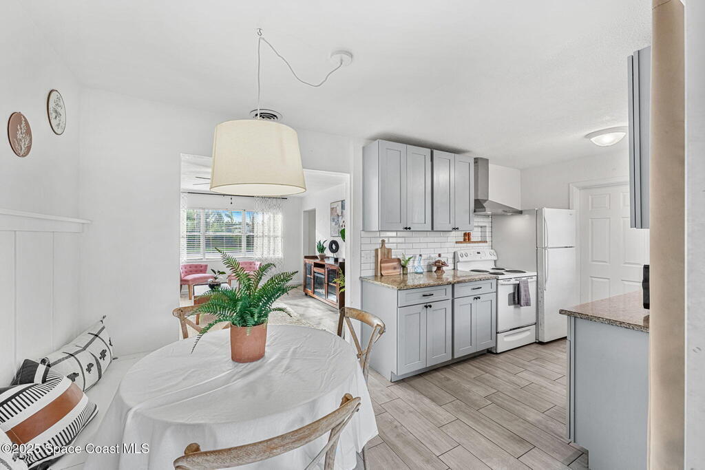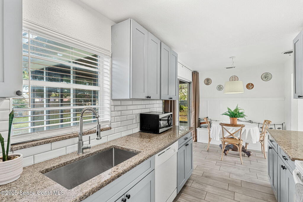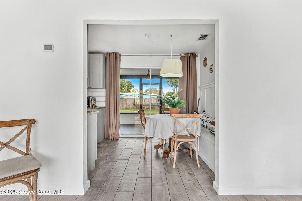 This charming 3 bedroom 2 bath has recent updates including newer kitchen cabinets & wood look tile in kitchen and living areas, New interior and Exterior Paint, New toilet in primary bathroom and new vanity and fixtures in secondary bathroom, Wainscoting in a kitchen nook with built in bench seating with storage underneath. New roof in 2023, Updated Electrical Panel in 2023, Large fully fenced in back yard with gate for all your toys, perfect for kids, fur babies & a pool! Brand new screen enclosure in front of the house by the front door, and large screened in back porch, NEW HVAC system. Tankless Gas hot water heater. Small storage area by the carport, Interior laundry room, and new modern Black and White exterior paint.