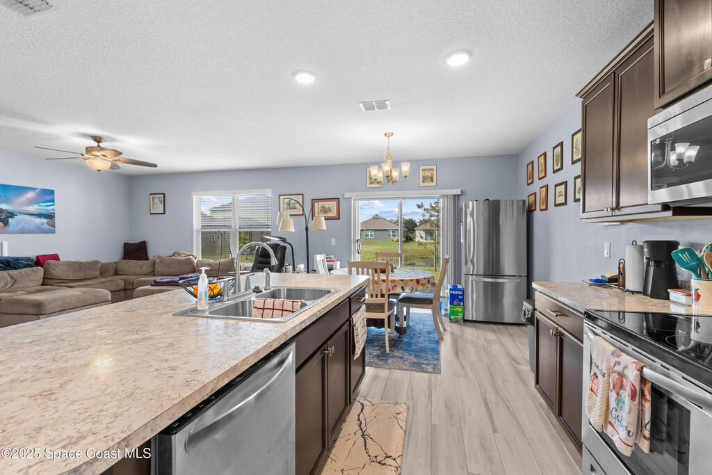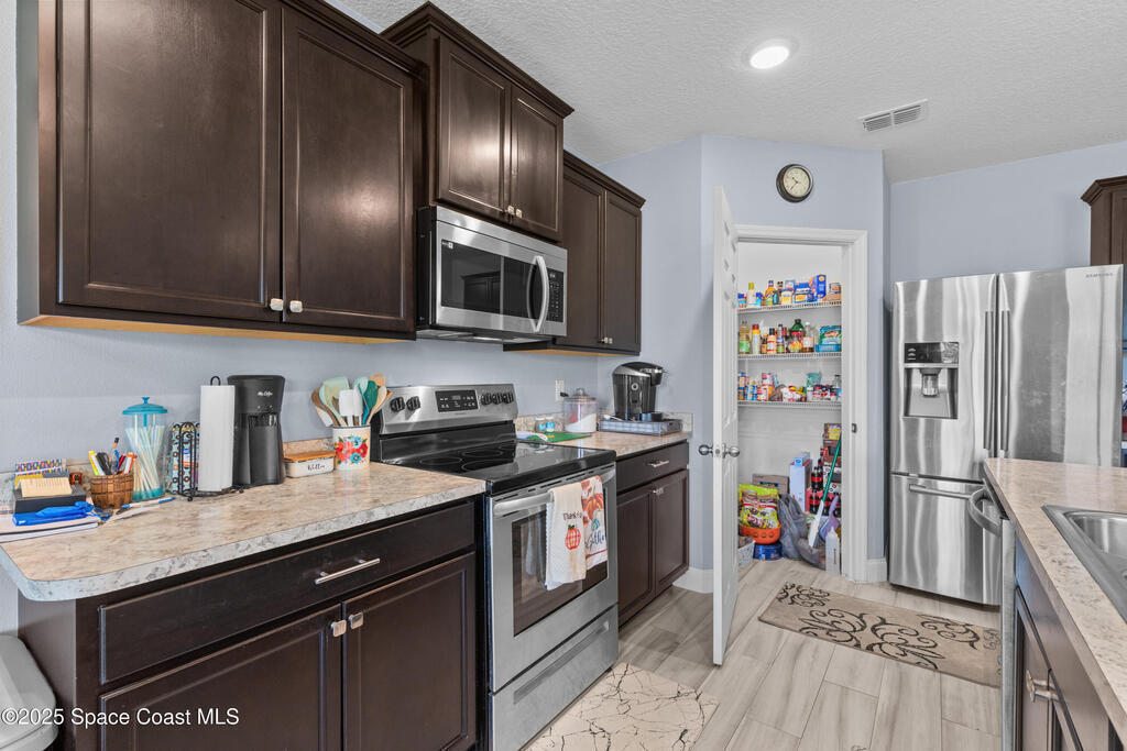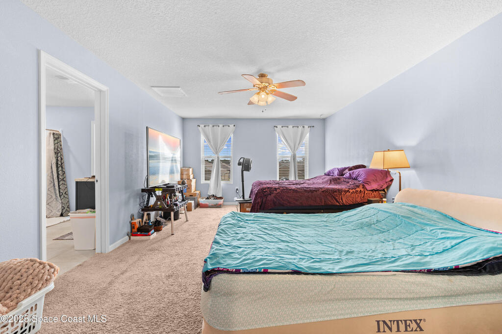 2018 build 5 bedroom, 3 bath home in the gated community of Brentwood Lakes. Downstairs bedroom and bath. Formal living area with separate family room open to kitchen and dining. Large kitchen with island and walk in pantry. No carpet in the living areas and stairway, bedrooms only. Covered entry and rear porch areas. Massive master suite with walk in shower, dual sinks and two walk in closets. Spacious loft area and 3 additional bedrooms.Upstairs bath also has dual sinks. Hurricane shutters. All appliances convey including washer and dryer (except the second refrigerator near the sliders in kitchen). HOA covers both cable and internet, along with community areas and gated entry.