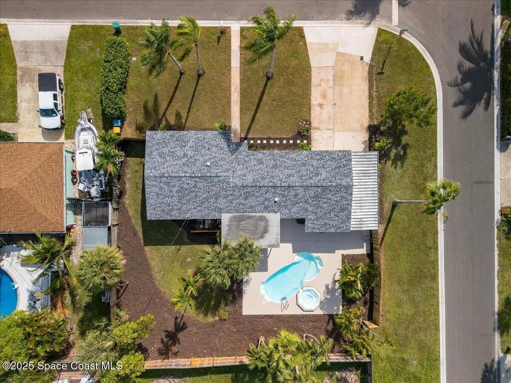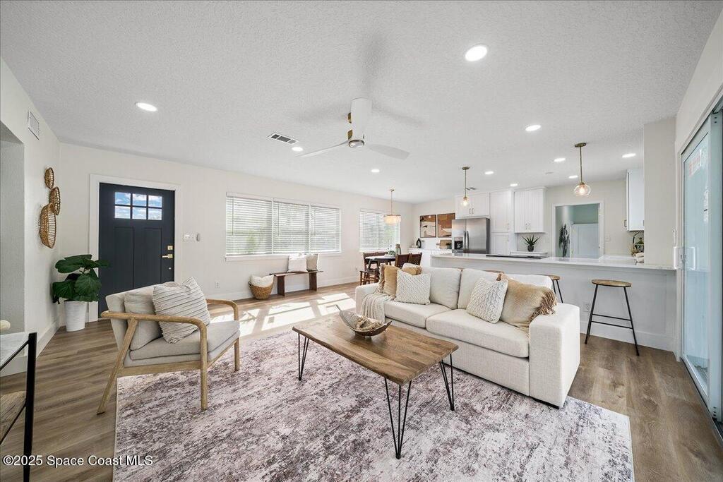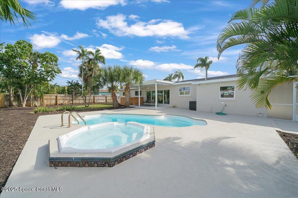 Completely renovated coastal pool home in Satellite Beach! This 4-bed, 2-bath home has been redesigned from top to bottom with new plumbing (including cast-iron drains), air ducts, hot water heater, flooring, doors, and paint inside and out. The open floor plan showcases brand-new hurricane-impact windows and sliders, wood-look LVP flooring, and a designer kitchen with quartz waterfall island, floating wood shelves, and all-new stainless appliances. Both bathrooms feature custom-tiled showers, modern vanities, and gold fixtures. Enjoy the flexible bonus bedroom, perfect for an office, playroom, or fitness space--and the convenience of indoor laundry. Step outside to a newly refinished pool, covered lanai, and tropical landscaping with upgraded irrigation, new well system, and pool pump. Every detail has been done, just blocks from the beach, parks, and top-rated schools