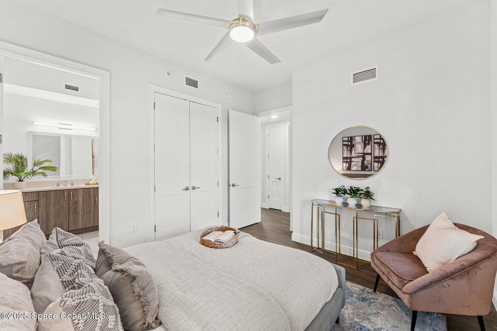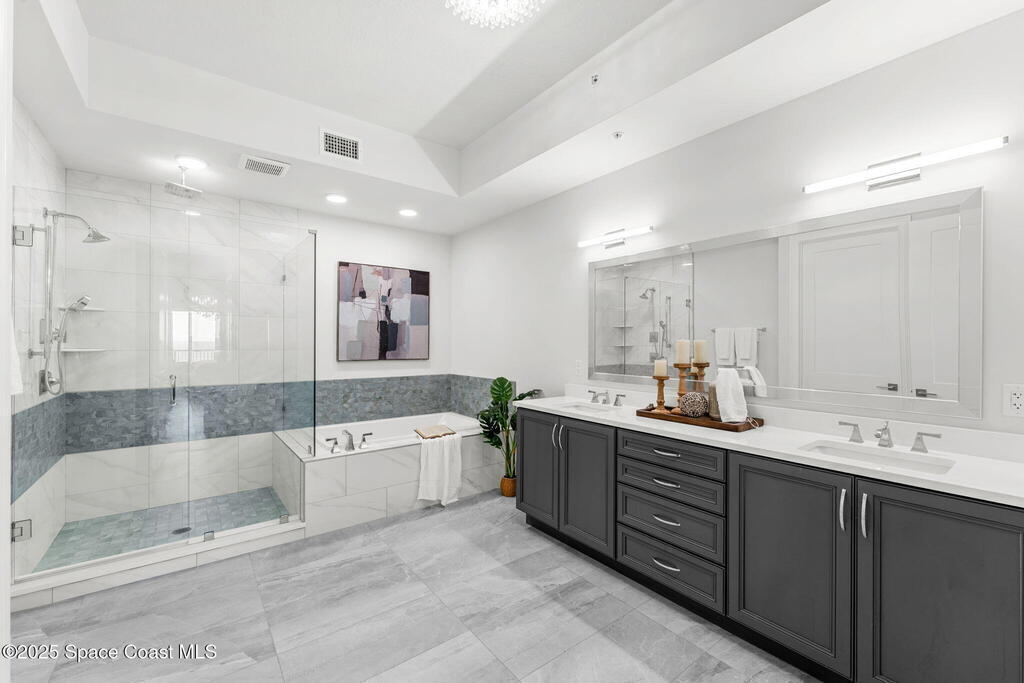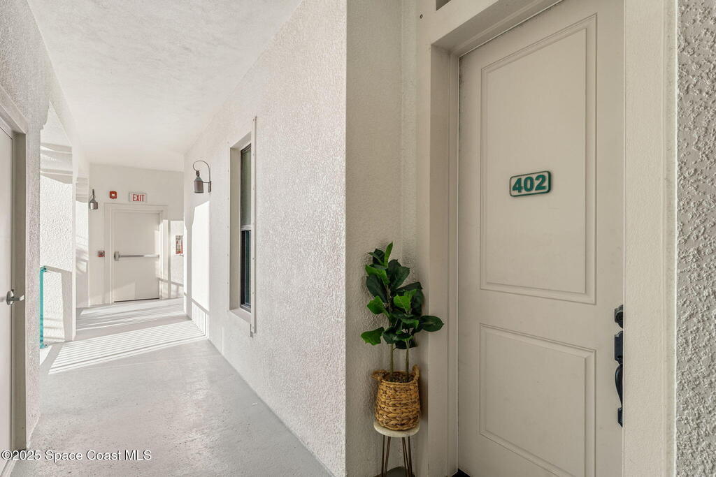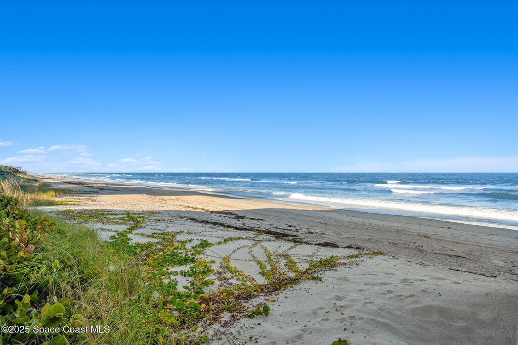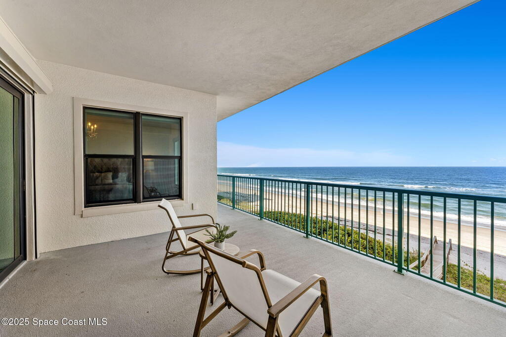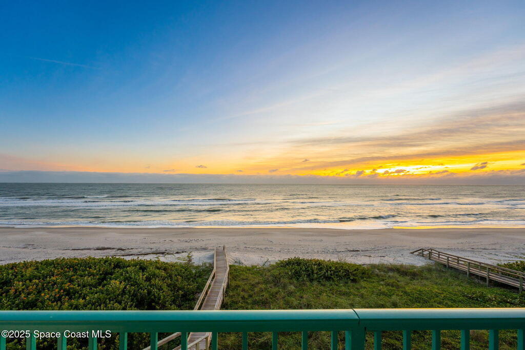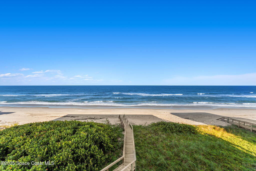 Welcome to The Palm Beach, one of the most exclusive oceanfront addresses on Florida's Space Coast. Built in 2022, this boutique Mediterranean-style building offers only 25 residences, designed to deliver privacy, luxury, and coastal serenity.Perched on the fourth floor, Unit 402 spans over 2,100 square feet with three bedrooms, three baths, and 10-foot ceilings that create an airy, open feel throughout. The interior features real wood flooring, impact-rated windows and doors, and a European-style kitchen with stainless steel appliances, a detached coffee bar, and elegant designer finishes. The primary suite includes a spa-inspired bath and a spacious walk-in closet, while the private balcony invites in the ocean breeze and sweeping Atlantic views. Amenities at The Palm Beach include a resort-style pool, hot tub, full fitness center, putting green, and an extensive grassy area perfect for pets.