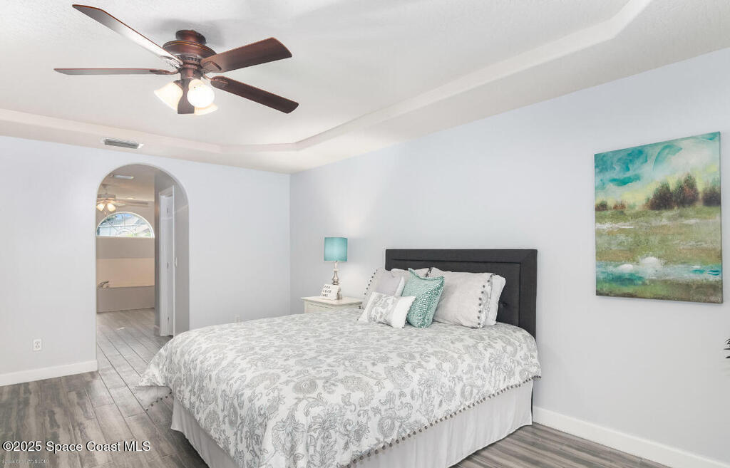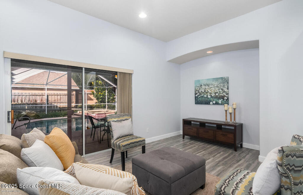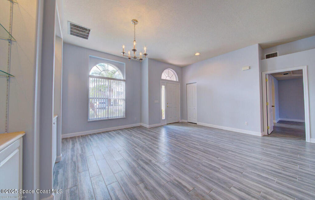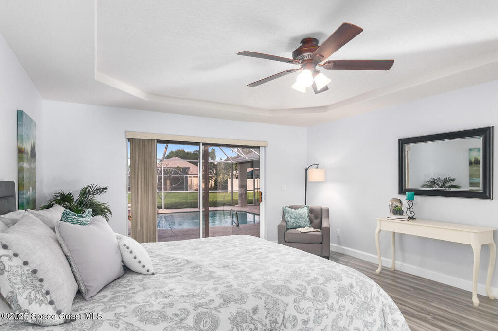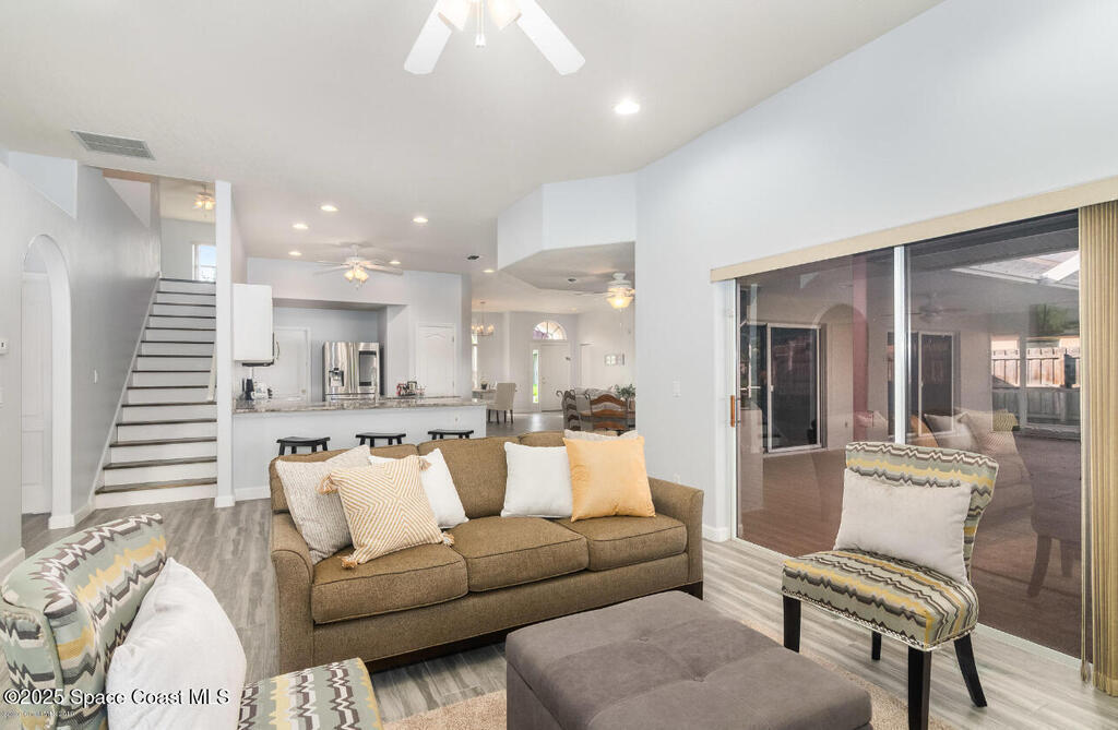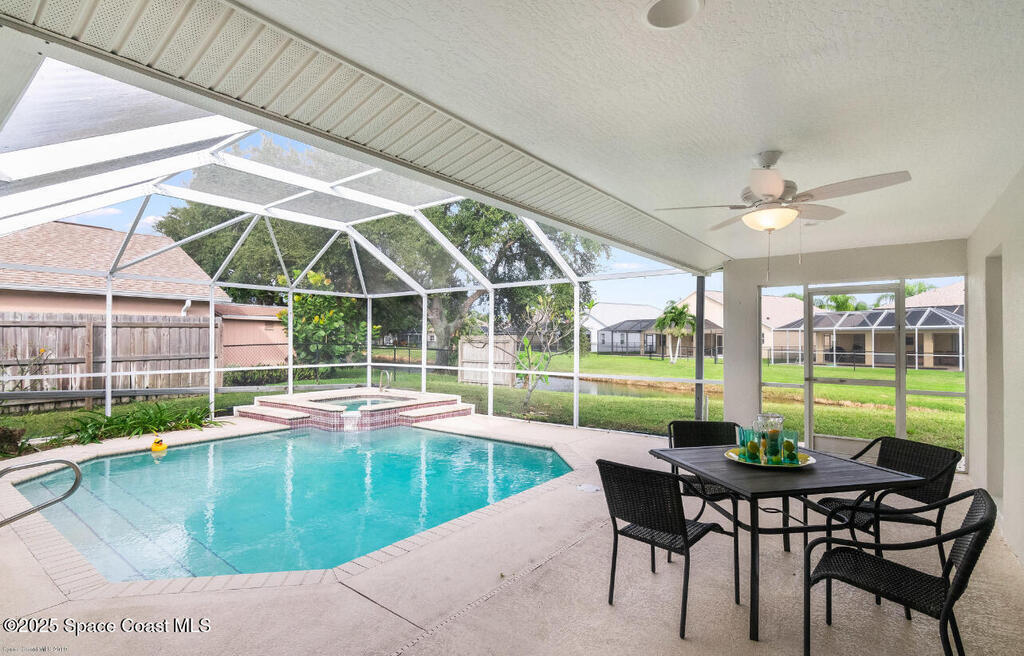 This beautifully remodeled 5 bed/3 bath pool/spa home includes a 2019 roof, 2020 A/C, stainless steel appliances, tile flooring throughout including a hardwood staircase, granite countertops in kitchen and bathrooms, freshly painted inside and out (2025), three car garage, screened-in lanai with heated pool, and overlooks a pond in the desirable gated community of Sunset Lakes. You will find 4 bedrooms downstairs with the 3 bathrooms, a formal and informal dining room, and two living spaces. The loft upstairs can be closed off for a fifth bedroom or use it as a bonus space. Walk to the neighborhood park, playground, tennis courts, basketball, and lake. Sunset Lakes is 15 minutes to Kennedy Space Center, fishing and the beach at Jetty Park, and 45 minutes to Orlando International Airport.Listing agent is licensed real estate agent and son of sellers.