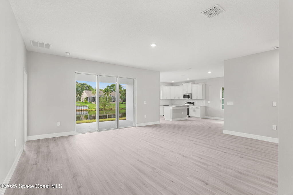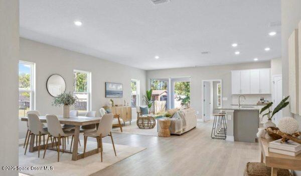 This stunning 4-bedroom, 3-bath, 2,092 sq ft home sits on an oversized 0.34-acre corner lot with a pond and canal behind and on the side, offering rare water views and beautiful sunrises and sunsets. The property features a custom curved paver driveway with RV/boat parking, city water, septic, and FPL service. Inside, enjoy 9'4'' ceilings, LVP flooring throughout (That's right no carpet), and a chef's kitchen with white cabinets, Calacatta quartz countertops, Samsung stainless steel appliances (washer & dryer included), and a white subway tile backsplash with dove-gray grout. The home includes a frameless master shower, glass front door, upgraded Maxim lighting, and Moen chrome fixtures. Exterior upgrades include Shadow Grey shingles, black drip edge, Blue Ridge Cobble stone, and beautifully customized and fully irrigated landscape. A rare blend of premium finishes, modern design, and exceptional waterfront living for maximum privacy.
