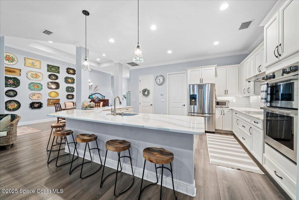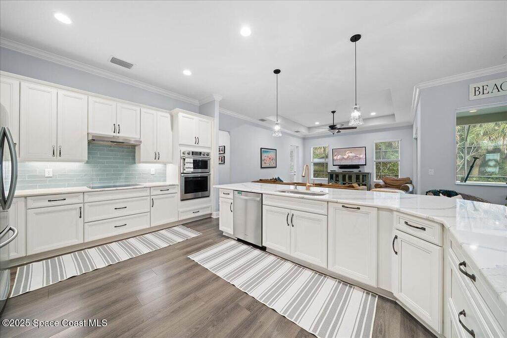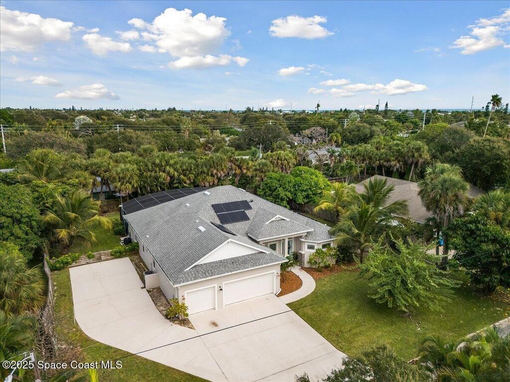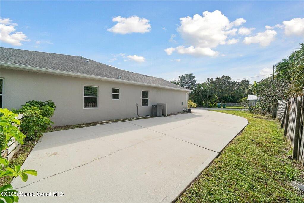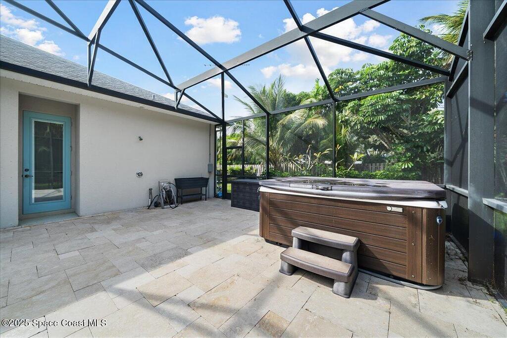 Fall in love with this 2018 Lifestyle-built home that is designed for effortless luxury. This five-bedroom, three-bath residence sits on a generous .41-acre lot--vast for the area--featuring expansive concrete areas for parking and toy storage. The home's footprint was extended two feet south and west, and ceilings rise two feet higher, infusing the space with generous light and air. Full solar panels are completely owned, ensuring energy efficiency and big bill savings. Inside, Cambria quartz Britannica countertops grace every surface, and a walk-in pantry with auto-on lighting keeps everything organized. A high-end wall microwave oven combo, recessed lighting, and counter-height bar seating elevate daily living. Outdoors enjoy a giant, impressive screened in lanai and heated pool with waterfall and beach-entry, a separate five-seat hot tub and outdoor shower. Big backyard to play in! Bonus exterior electric and sewer hook-ups for an RV. Short walk to river pier and ocean access!
