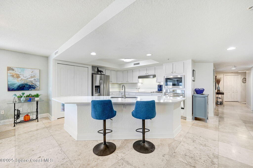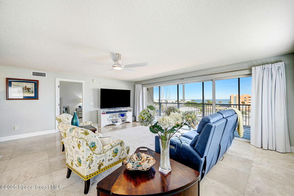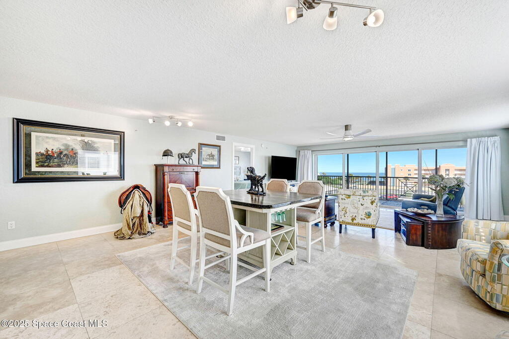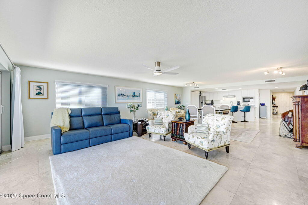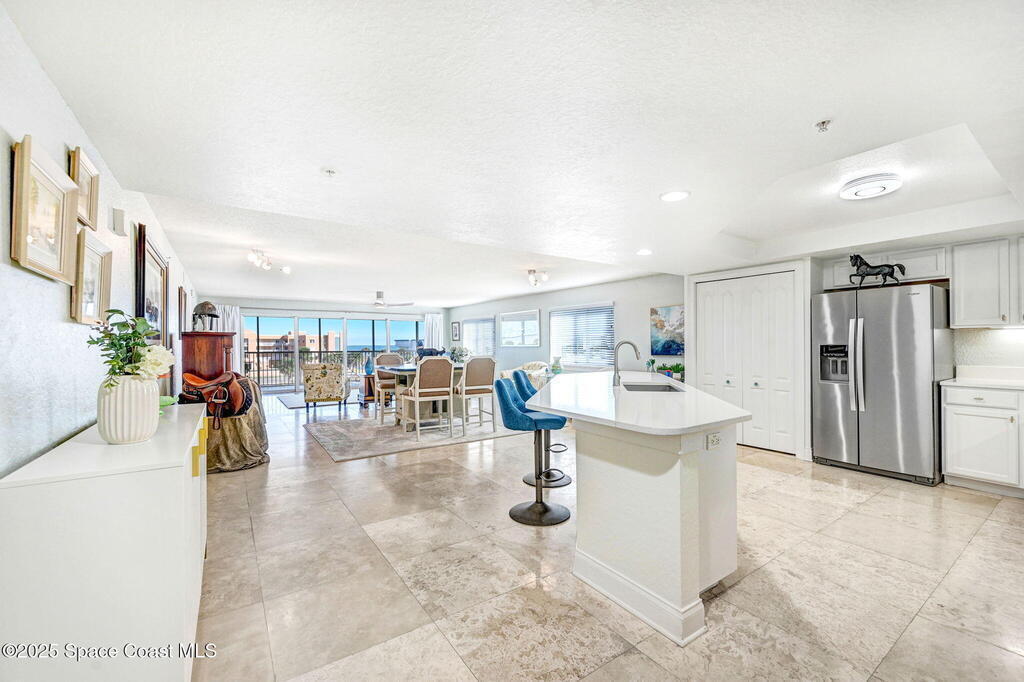 You have just found your new Barrier Island Penthouse Home with wonderful Atlantic Ocean Views. This Stunning 3 bedroom, 2 bath, end unit Penthouse offers; Fantastic Ocean views, Hurricane Impact windows and Doors, Open Floorplan, light and bright, Chefs Kitchen, Quartz countertops, huge kitchen island, breakfast bar, Stainless Steel appliances encompassing dining room and open to large living room, Travertine flooring in main living areas, Carpeted Bedrooms, large in-unit laundry, en-suite primary bedroom with huge shower and double bowl sinks, 2 generously sized guest bedrooms, a huge 33' screened covered patio, and 2 private under building garage parking spots #2 and #4. This wonderful Beachside community offers; Community Pool, BBQ, Clubhouse, Fitness center, pickleball and tennis court. Enjoy being across Jimmy Buffett Memorial Highway (A1A) from the Atlantic Ocean and Beaches. Close to A rated Schools, Shopping, Dining, and Entertainment. Enjoy Florida Beachside Living!!