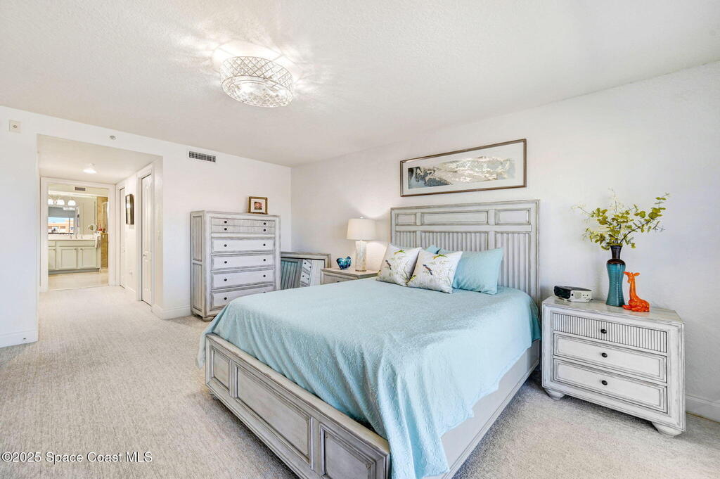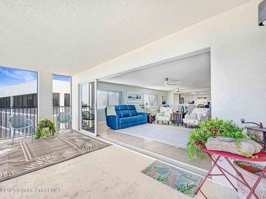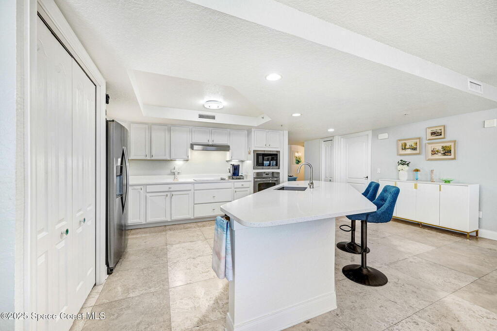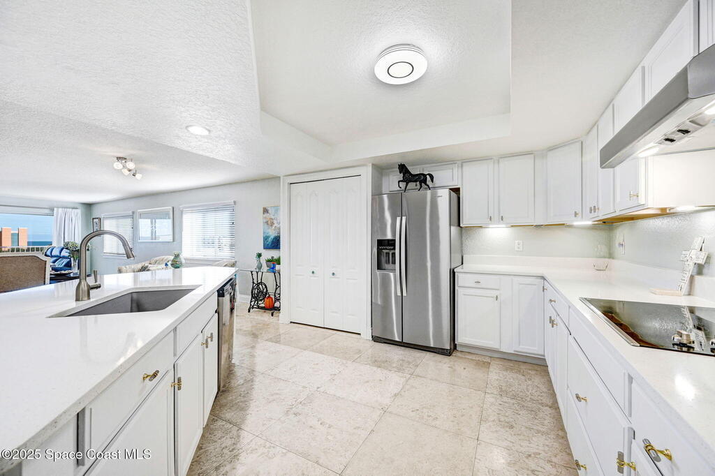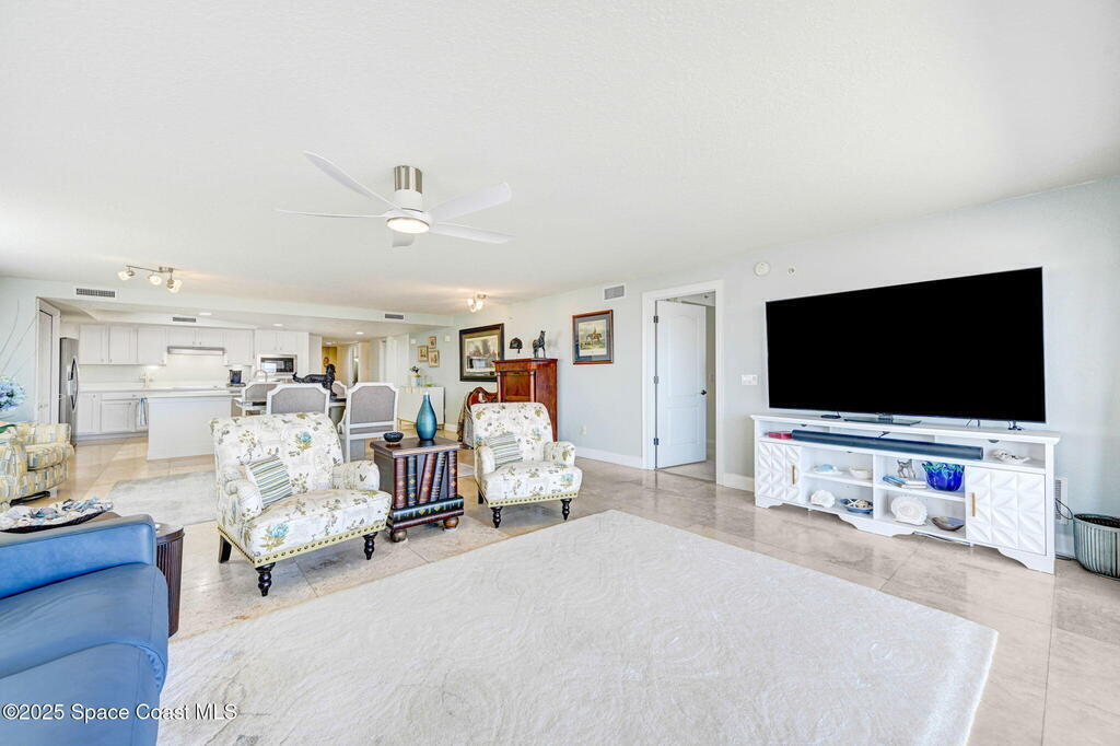 You have just found your new Barrier Island Penthouse Home with wonderful Atlantic Ocean Views. This Stunning 3 bedroom, 2 bath, end unit Penthouse offers; Fantastic Ocean views, Hurricane Impact windows and Doors, Open Floorplan, light and bright, Chefs Kitchen, Quartz countertops, huge kitchen island, breakfast bar, Stainless Steel appliances encompassing dining room and open to large living room, Travertine flooring in main living areas, Carpeted Bedrooms, large in-unit laundry, en-suite primary bedroom with huge shower and double bowl sinks, 2 generously sized guest bedrooms, a huge 33' screened covered patio, and 2 private under building garage parking spots #2 and #4. This wonderful Beachside community offers; Community Pool, BBQ, Clubhouse, Fitness center, pickleball and tennis court. Enjoy being across Jimmy Buffett Memorial Highway (A1A) from the Atlantic Ocean and Beaches. Close to A rated Schools, Shopping, Dining, and Entertainment. Enjoy Florida Beachside Living!!