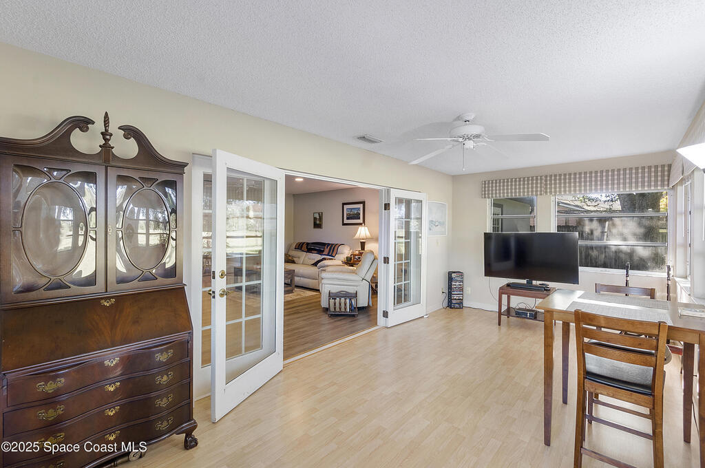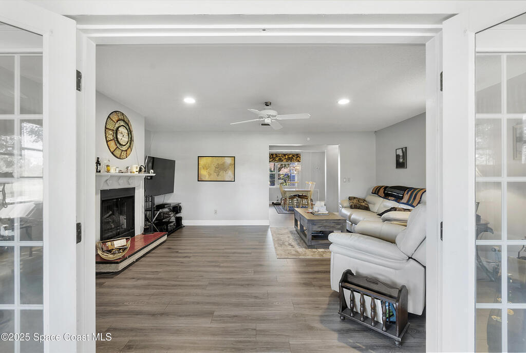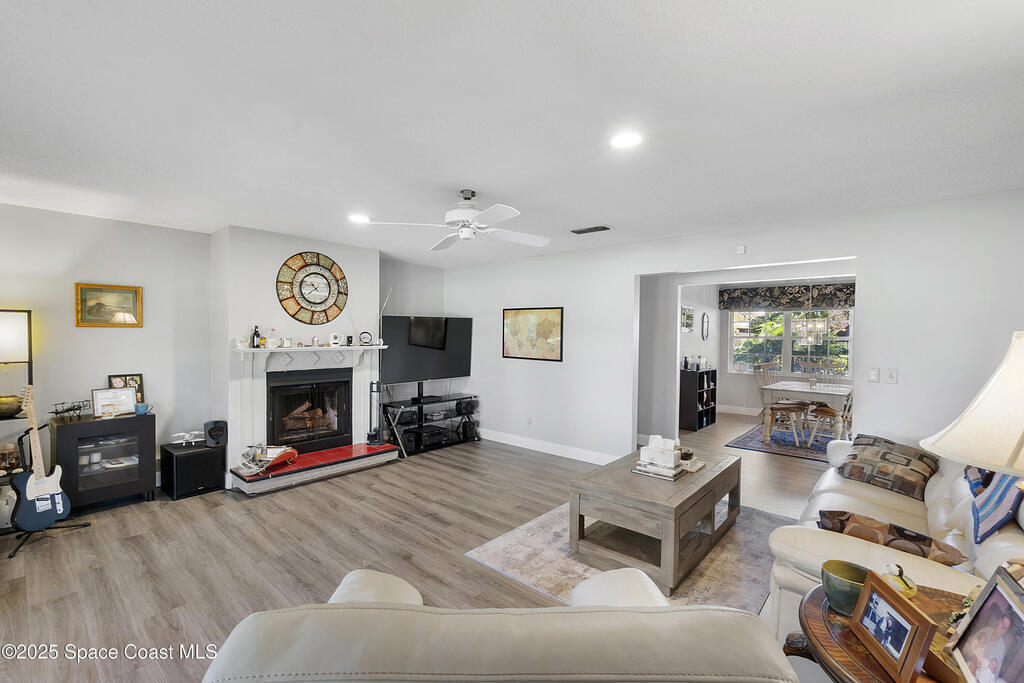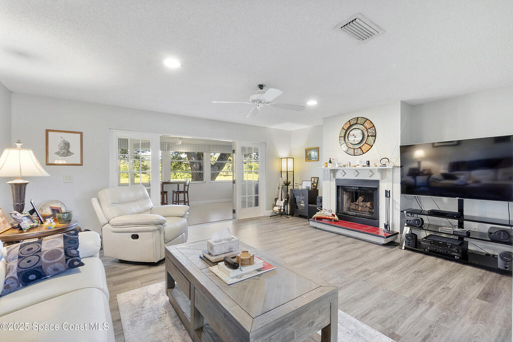 Welcome to this beautifully maintained concrete block home, featuring thoughtful updates and inviting living spaces. Located on a quiet street, in an established and desirable golf course front community. This home features a new roof (2022), luxury vinyl plank floors, fresh paint, kitchen w/ SS appliances and pantry, a sprinkler system on reclaimed water, a 2 car garage and so much more. The entry foyer leads into a formal DR, ideal for gatherings and a spacious LR highlighted by a wood burning fireplace. French doors from the LR lead into a light-filed 10 X 19 Florida room (under air) overlooking the historic Royal Oak Golf Course, creating a serene backdrop for everyday living. The generous primary suite offers a walk in closet, step in shower and ample room to unwind. Split floor plan and home is move in ready! With its blend of character, updates and a picturesque setting this home is ready to welcome its next owner! Close to beaches, KSC, Orlando & theme parks!